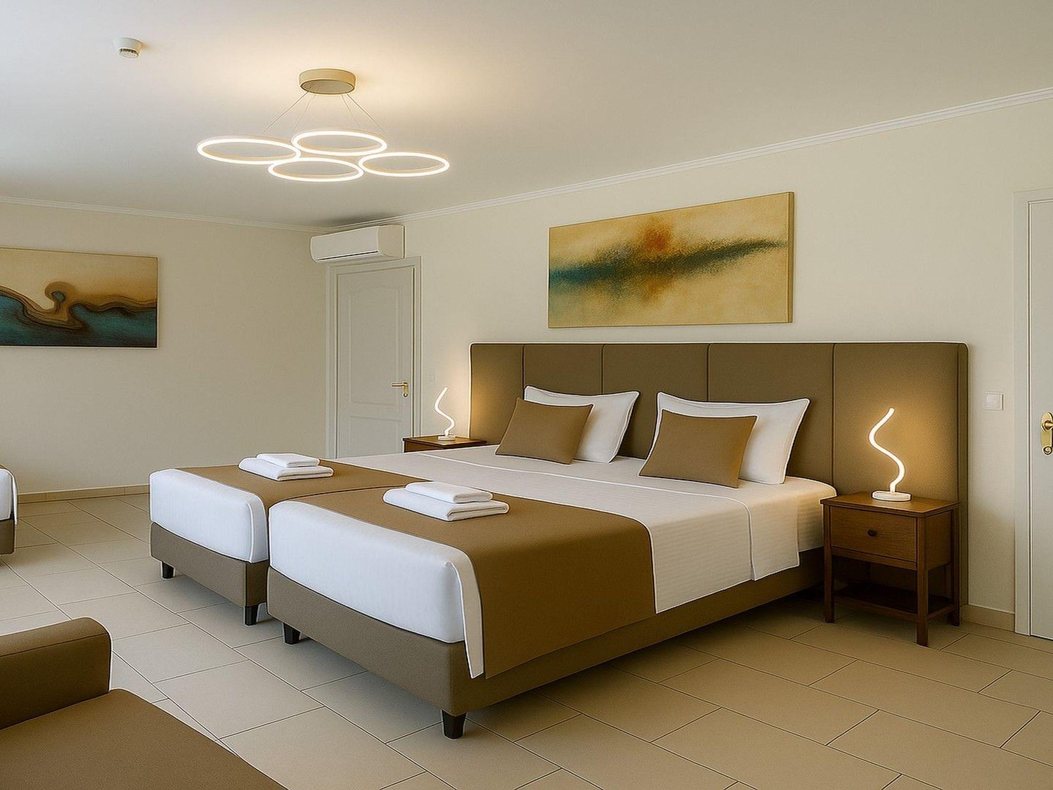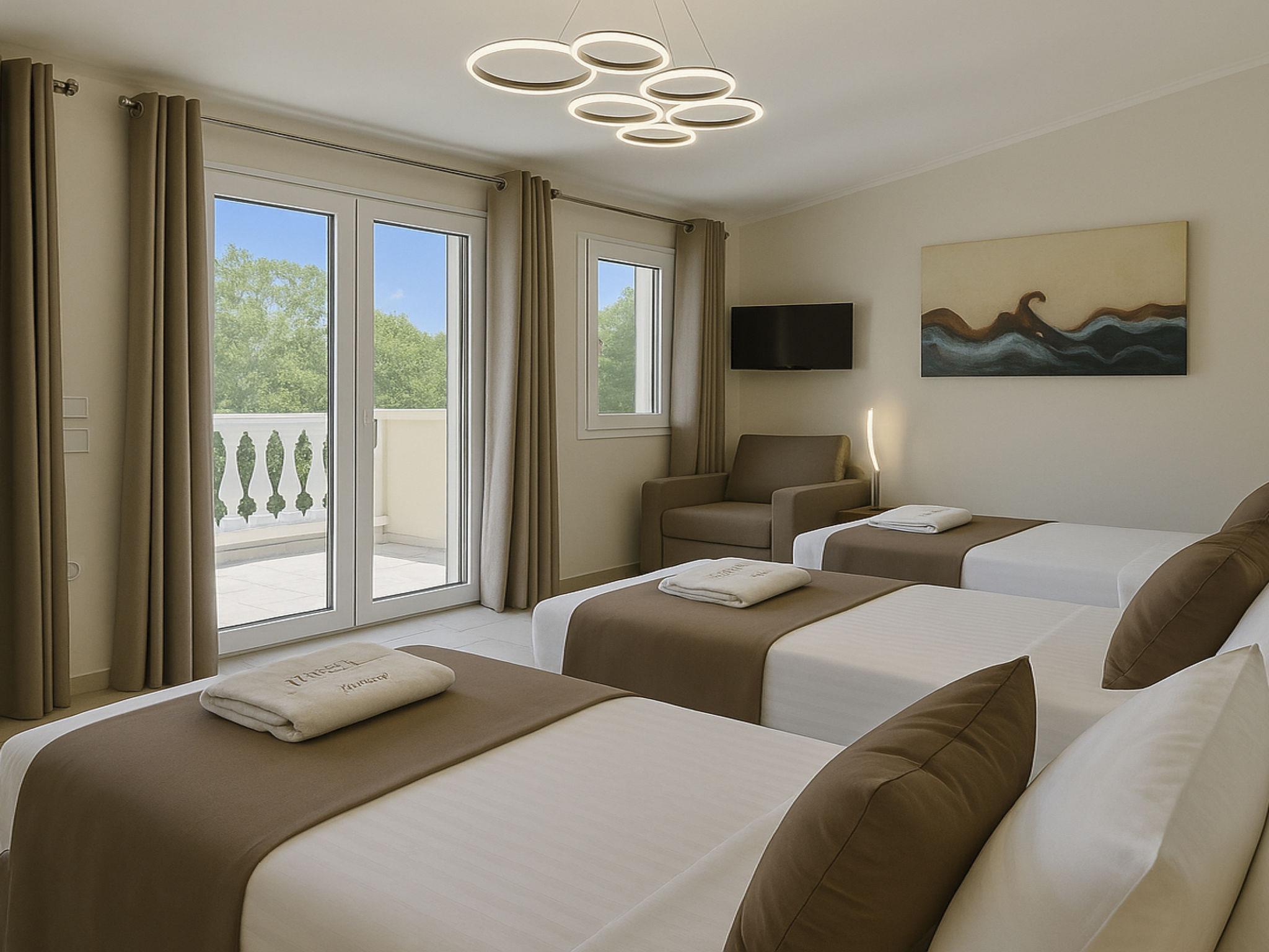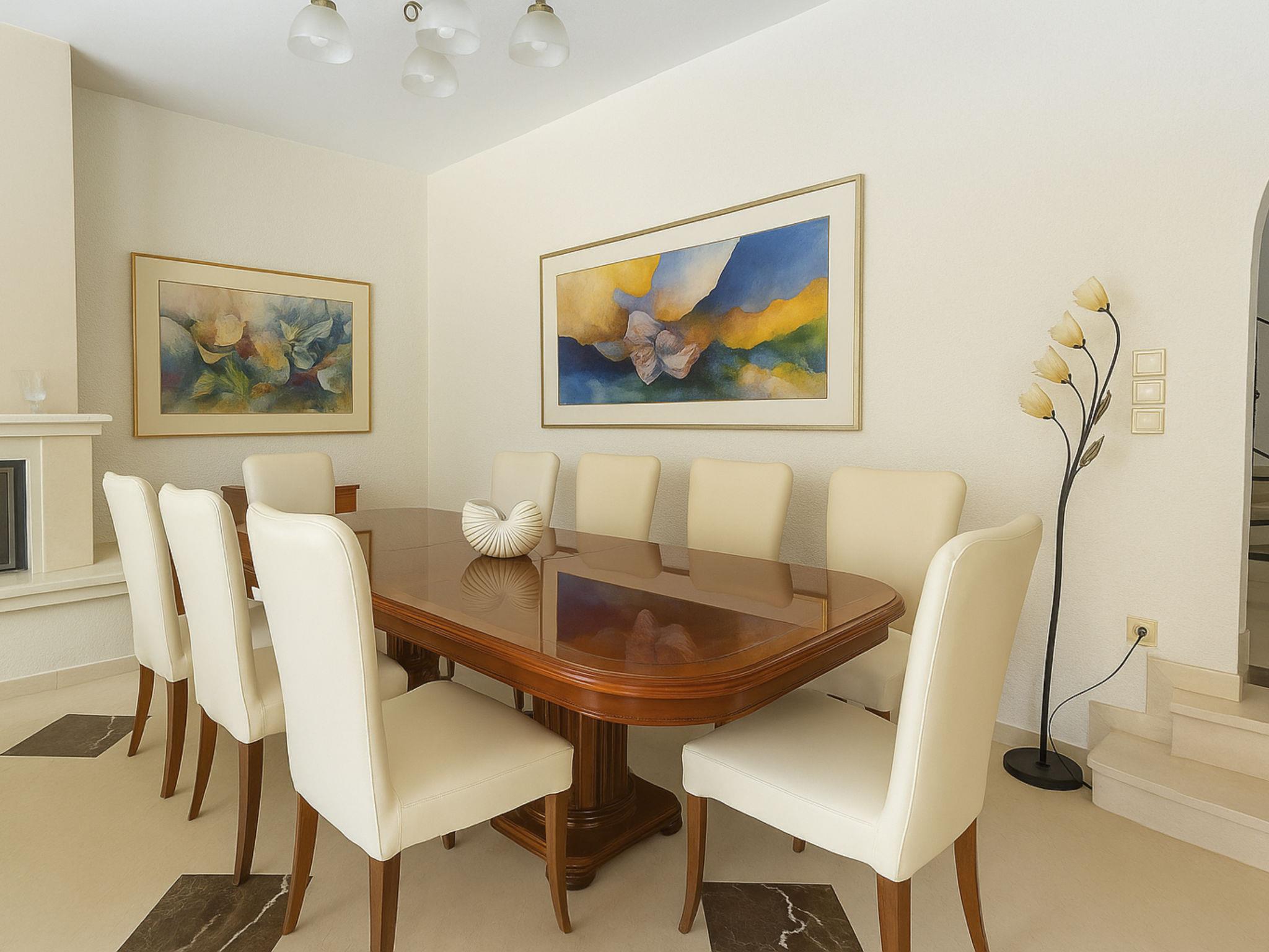 The freshwater swimming pool is adorned with elegant Greek white marble tiles and is surrounded by outdoor furniture. You can sunbathe on stylish loungers with comfortable cushions or relax on the lawn under the shade of the trees.