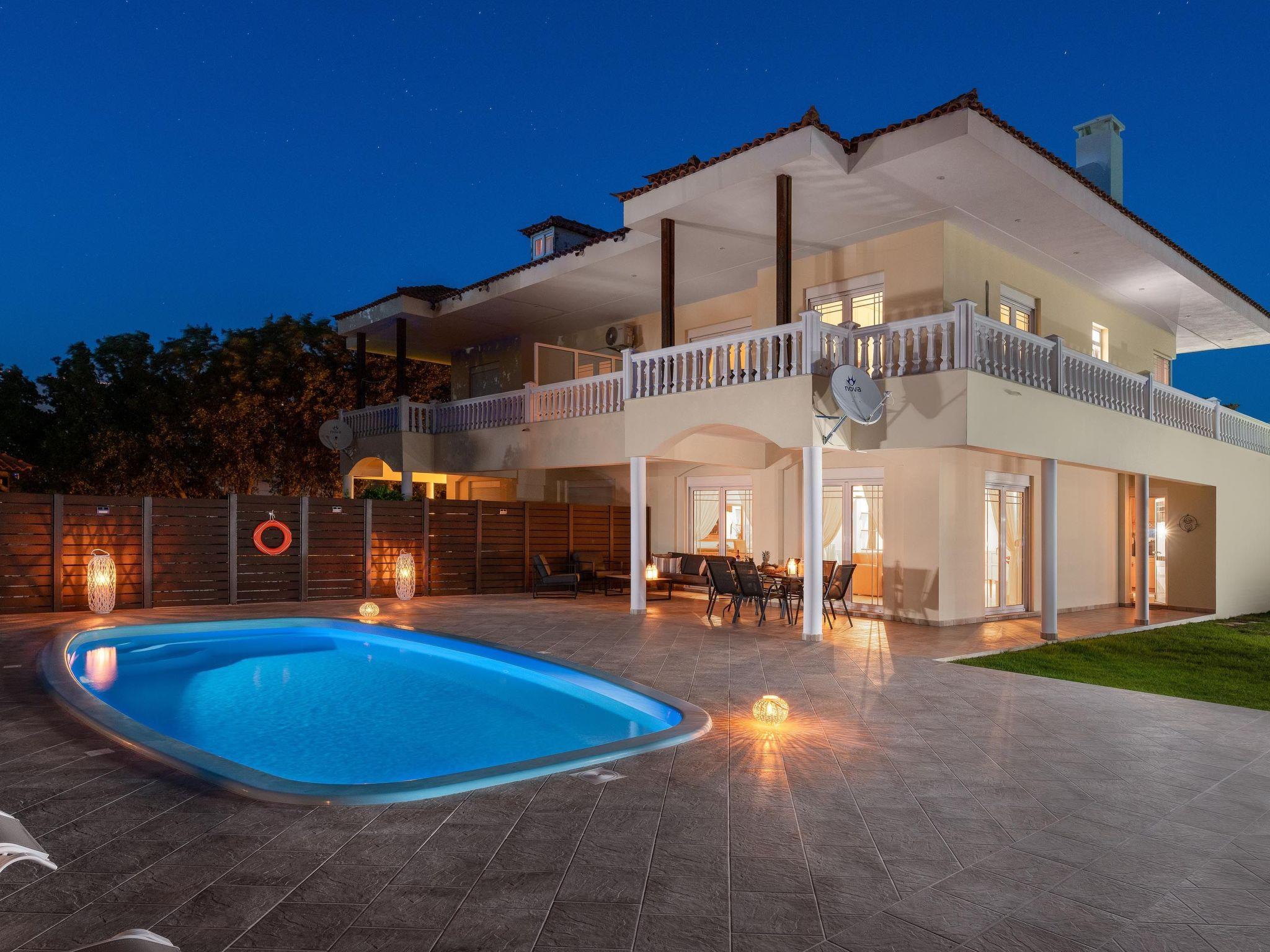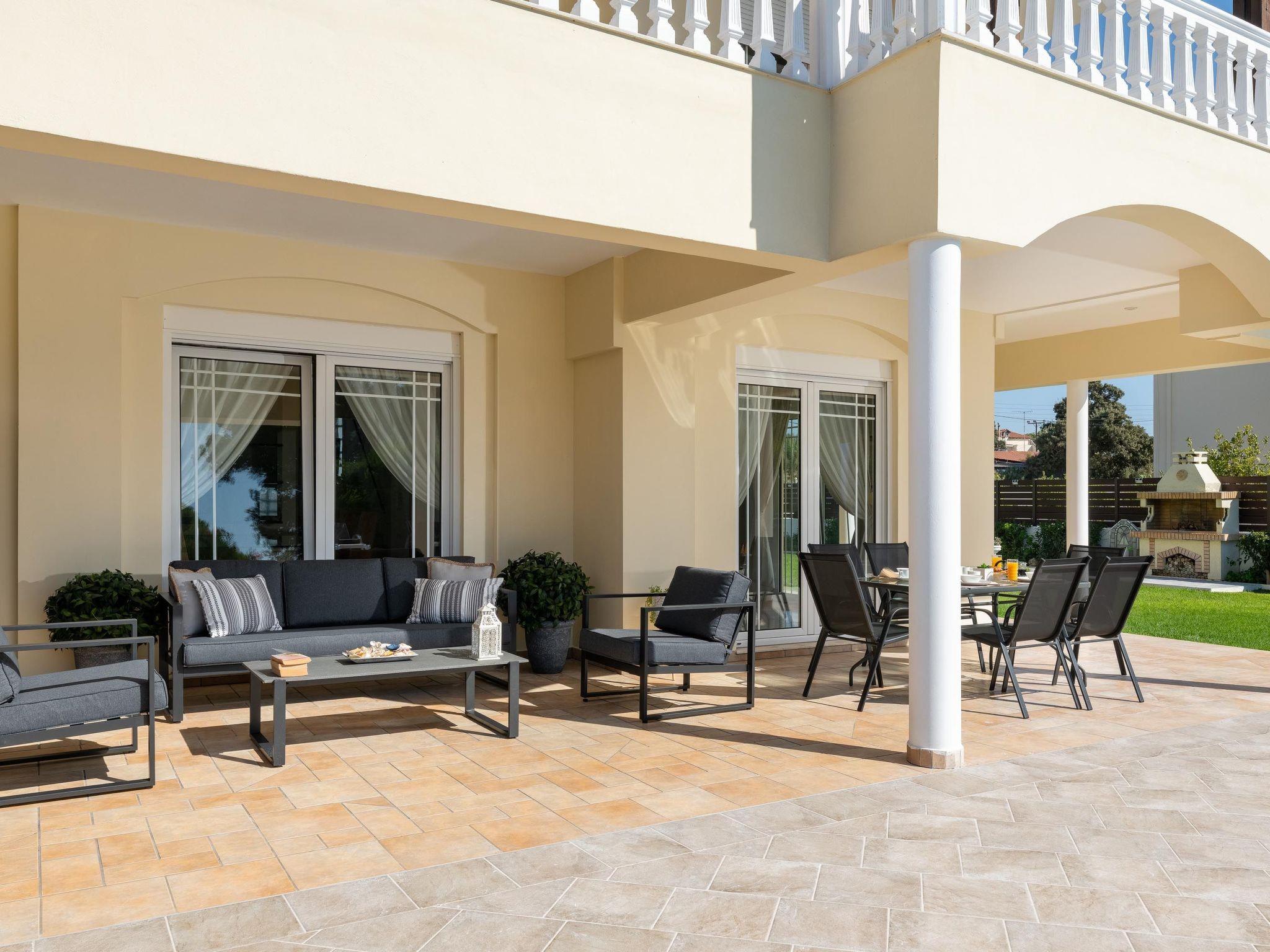 Villa Montefile has three fully air-conditioned bedrooms, all of them with double beds and balconies. One of the double bedded bedrooms includes an ensuite bathroom with a shower and has a flat-screen TV. There are two bathrooms in total, with showers as well as a WC. All areas of the villa are fully airconditioned. Also, there’s an open-plan huge kitchen which is fully equipped and suitable for any meal preparation. In the same area, you will find the sitting area of the kitchen along with an incredibly cozy living room in bright tones. There’s a smart TV and free Wi-Fi access throughout the property. There’s an entrance that leads to two houses that belong to one property. As you face the property from the entrance, Villa Montefile is on the left. Outdoors, there’s the wonderful private swimming pool and a heated jacuzzi with sunbeds where you can relax and work on your tan under the rays of the Aegean Sun. Of course, the beach is right about a 6-minute drive from the house so you can easily spend your time there. Also, there’s an outdoor furnished area and a BBQ installation along with a sitting area to enjoy a gathering with your friends or family under the starry sky!