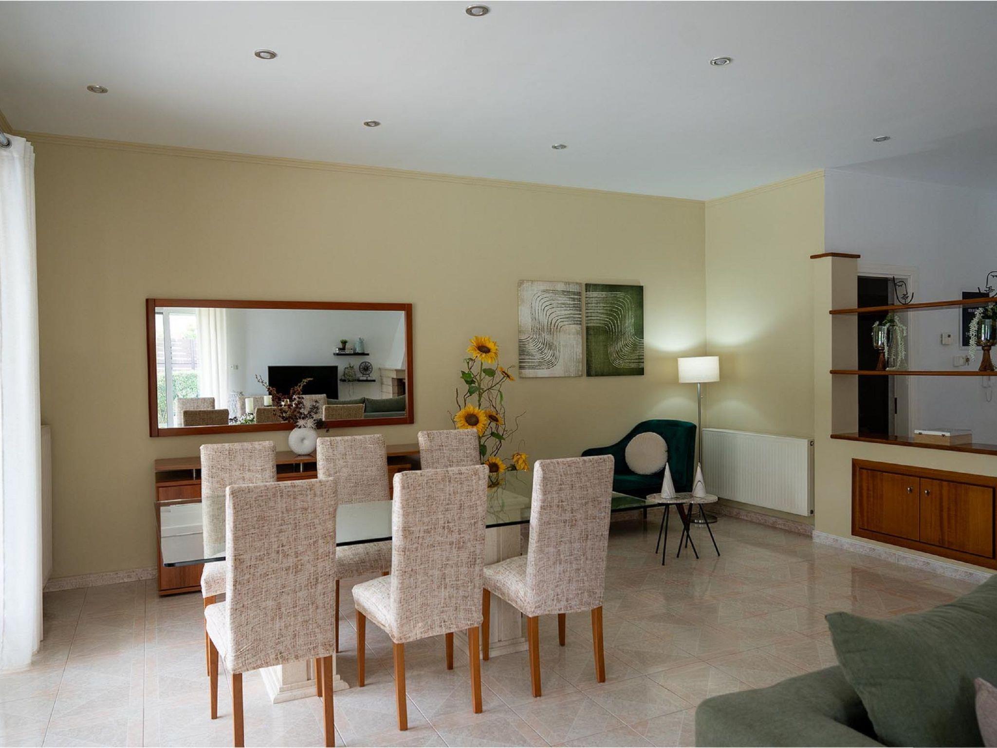 Villa Montefile is set on a beautiful side of Ialysos and offers a wonderful private swimming pool. Its great advantages are the great location, you’ll find it only a 6-minute drive from the beach as well as its contemporary interior design. The airport of Rhodes is found at a driving distance of only 15 minutes. It conveniently accommodates up to 7 guests and offers everything you might need during your holidays in Rhodes!Villa Montefile has three fully air-conditioned bedrooms, all of them with double beds and balconies. Also, it has An airconditioned bedroom with a single bed and a window. One of the double bedded bedrooms includes an ensuite bathroom with a shower and has a flat-screen TV. There are two bathrooms in total, with showers as well as a WC. All areas of the villa are fully airconditioned. Also, there’s an open-plan huge kitchen which is fully equipped and suitable for any meal preparation. In the same area, you will find the sitting area of the kitchen along with an incredibly cozy living room in bright tones. There’s a smart TV and free Wi-Fi access throughout the property. There’s an entrance that leads to two houses that belong to one property. As you face the property from the entrance, Villa Montefile is on the left.