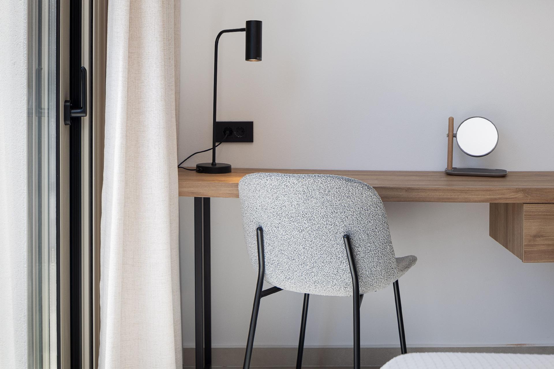 The villa spans approximately 86 sqm of indoor living space and 124sqm of outdoor area, making it ideal for groups or families. The villas feature a spacious open-plan living area, where guests can relax on a comfortable sofa while enjoying modern amenities such as a 50’’ Smart TV with satellite channels. Large sliding doors provide access to private terraces or the pool area, creating an easy flow between the indoor and outdoor spaces. The villa has a fully functional kitchen, allowing guests to prepare meals with ease, and the dining area offers a welcoming space for shared meals.