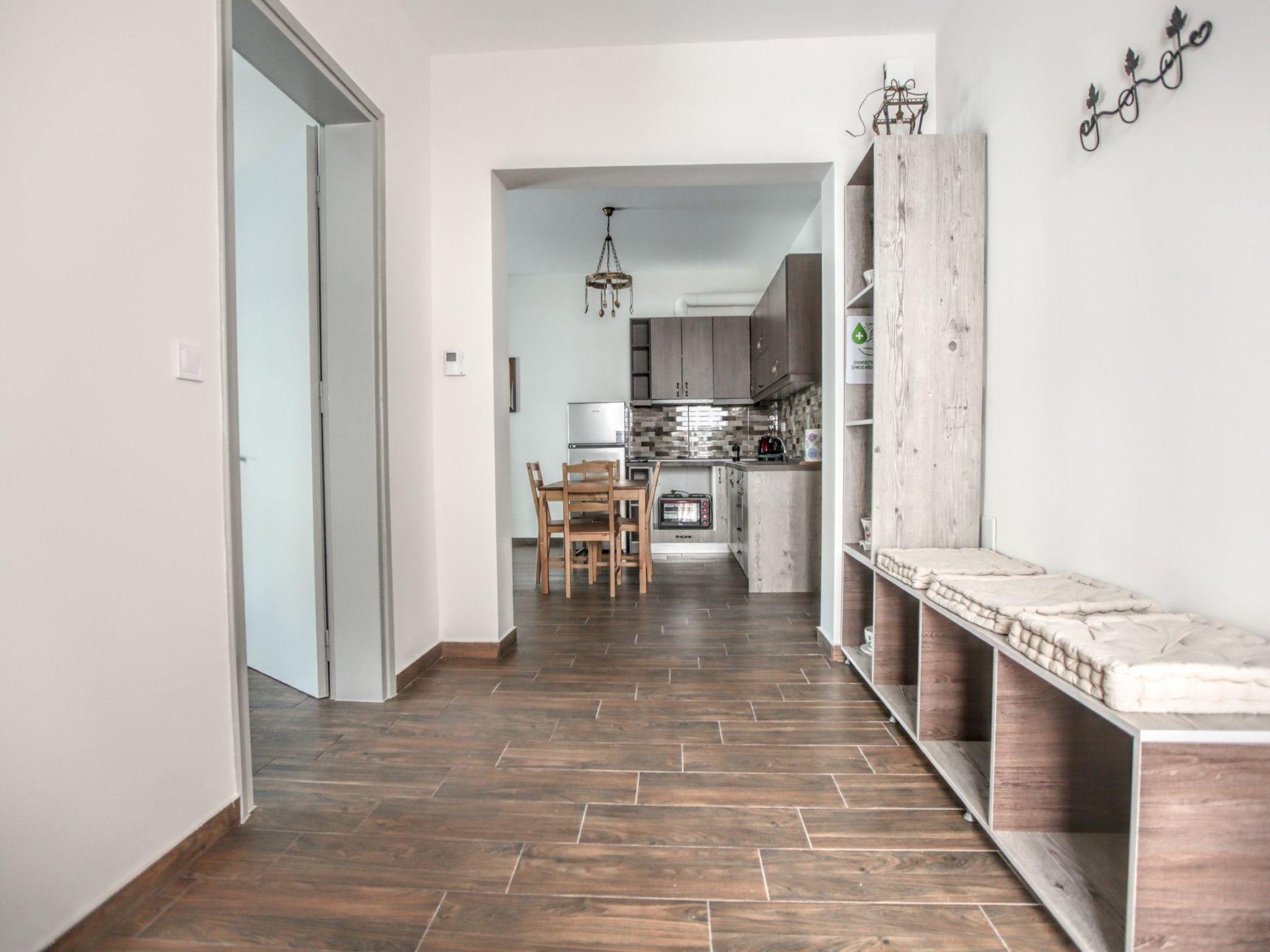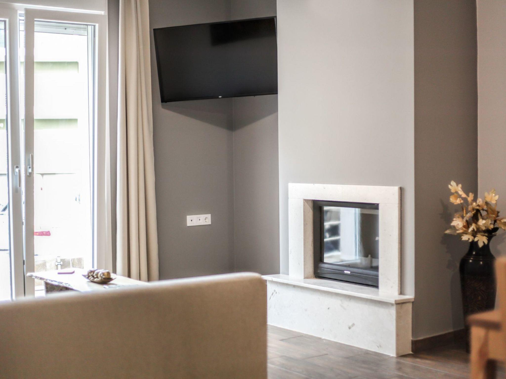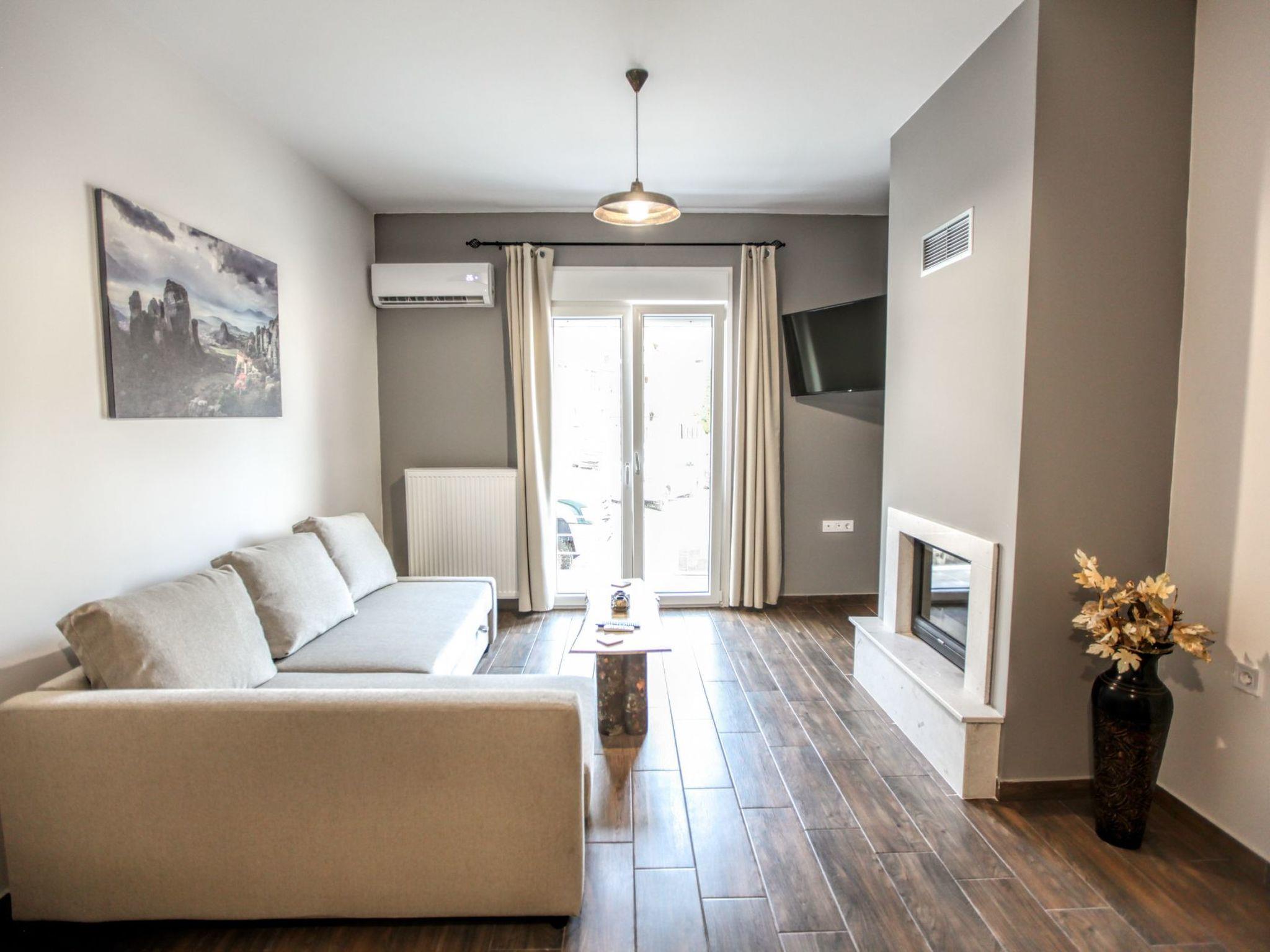 Explore the glorious Meteora rocks and the surrounding area with this brand new, large, airy, country rustic style apartment, which offers an open plan living space with all the modern facilities, as your base. The property is tastefully decorated with neutral patterns, high end finishings and wooden-like accents, for a luxurious yet charming feel. This contemporary apartment has everything to make you feel at home – Wi-Fi, energy fireplace, king-size beds, well-equipped kitchen and tableware,