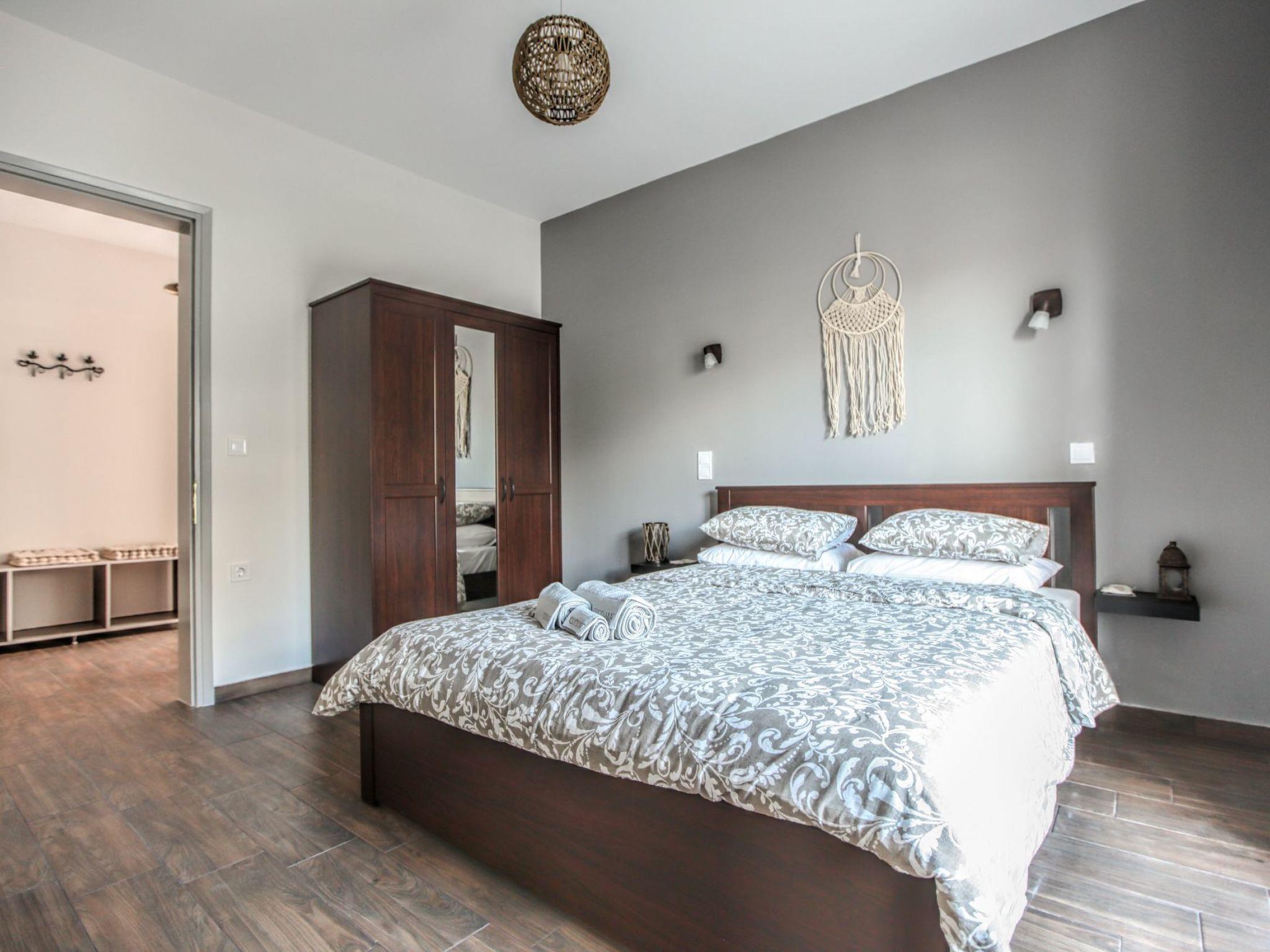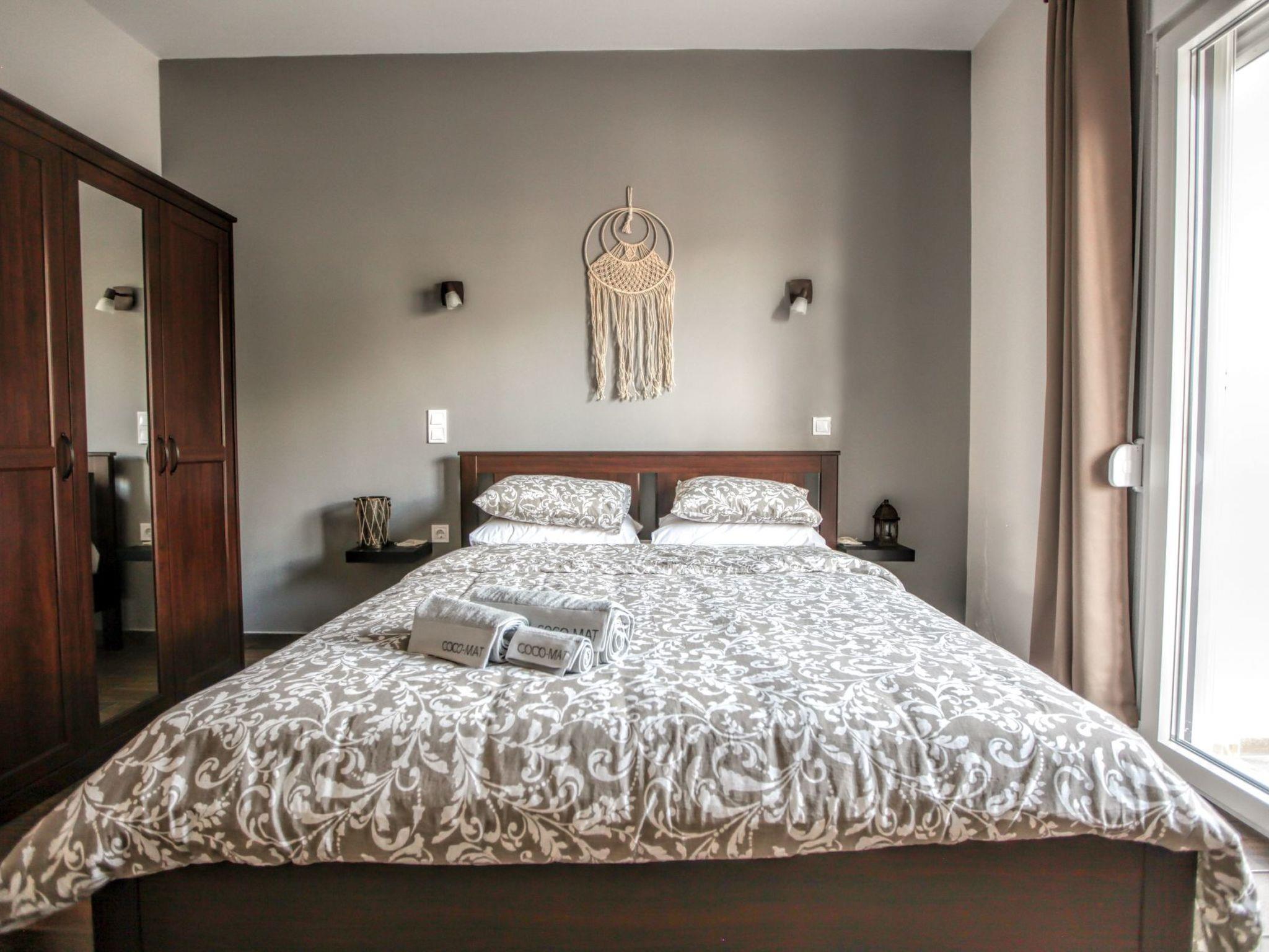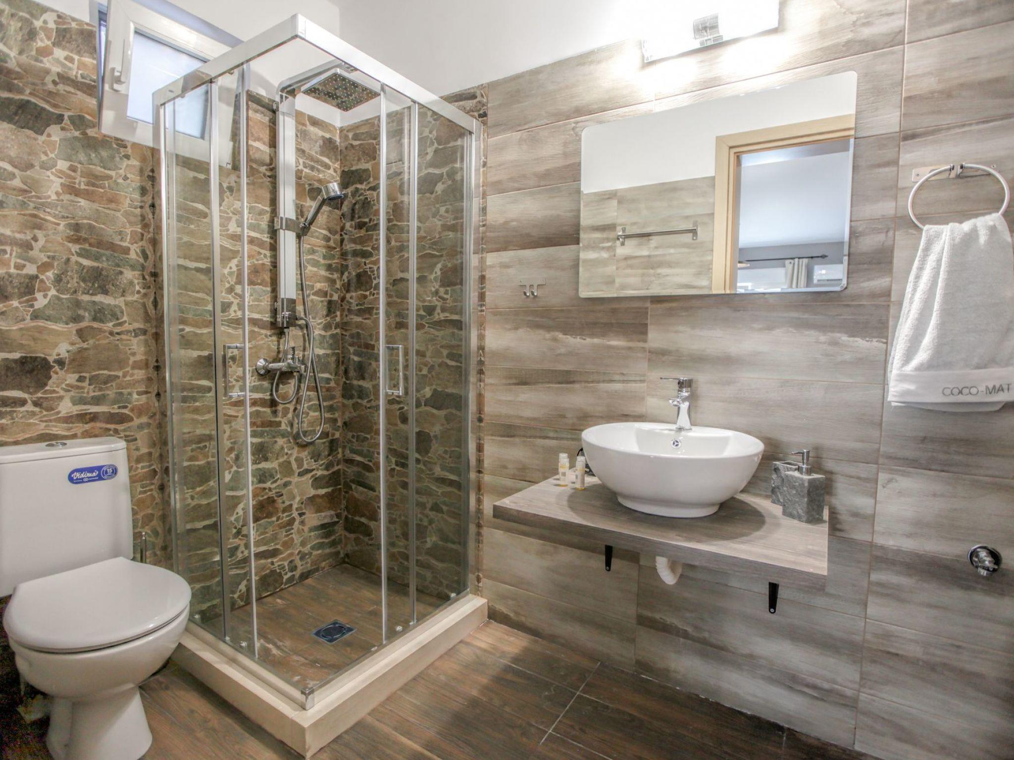 It consists of a bright double master bedroom looking out to the … and of a large open plan living room – dining room – kitchen. The living room, where you can relax on the six seater sofa opposite the fireplace and enjoy a movie, is discreetly screened off from the dining area, which extends to a fully-equipped kitchen with a four-chair kitchen table. There is a spacious bathroom with beautifully designed walls and a comfortable shower cabin, in which you can enjoy a hot bath, while the… rain falls down on you! On summer nights, make sure you switch the air conditioner on, while on wintery nights, the house is heated with natural gas, 24/7 natural. This apartment is ideal for families with children, couples, or groups of friends.