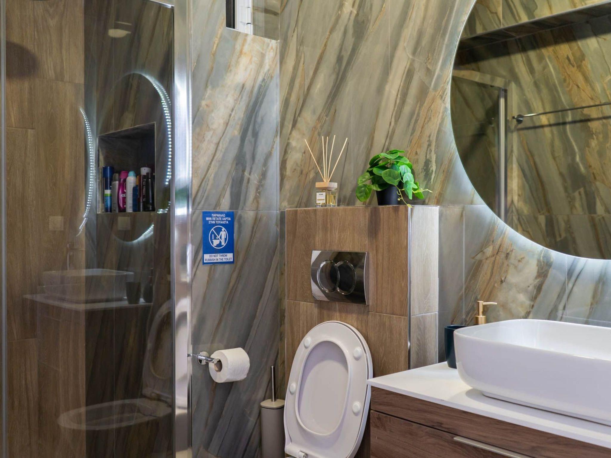 After a day of exploring the wonders of Meteora, retreat to the luxurious bathroom, complete with all the amenities you could desire. Refresh yourself under the soothing shower or indulge in a long soak in the spacious bathtub.