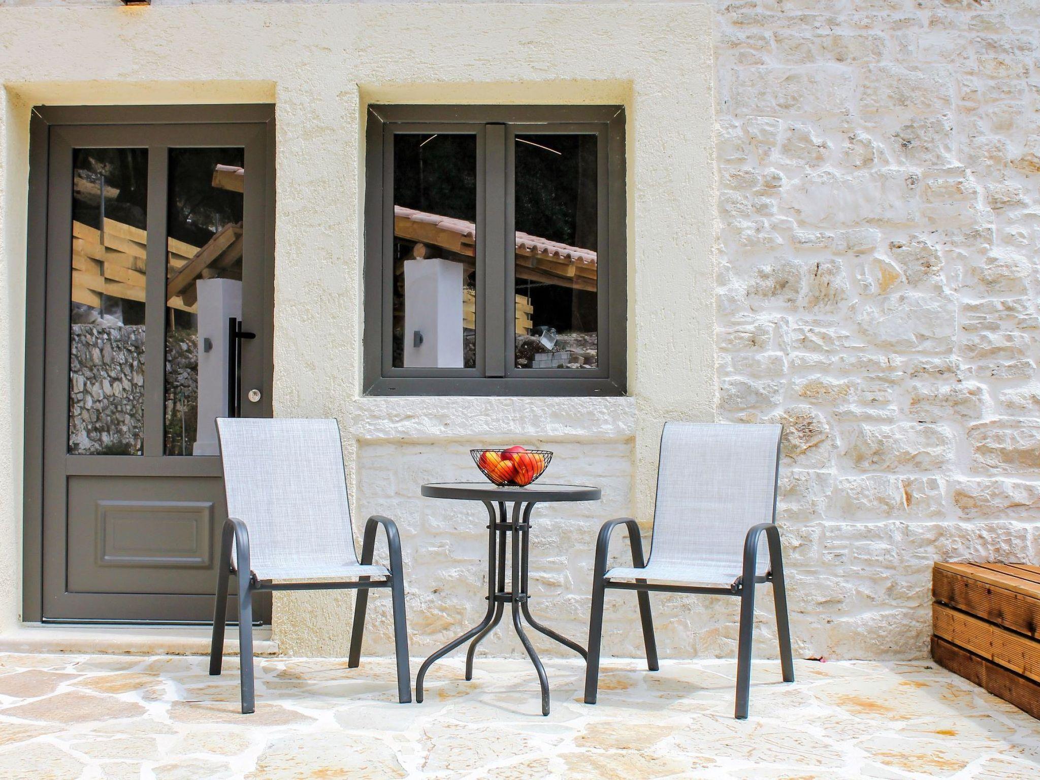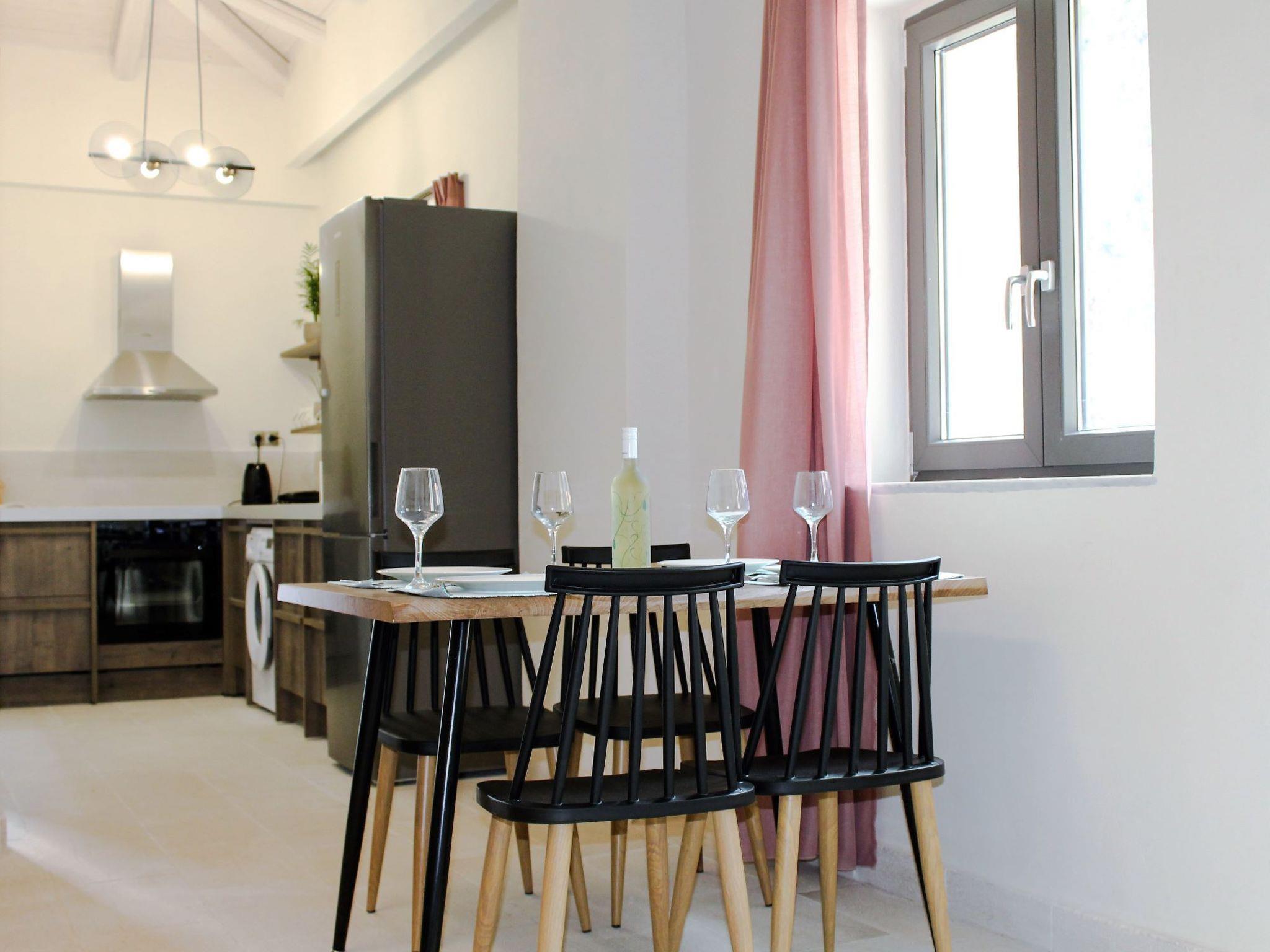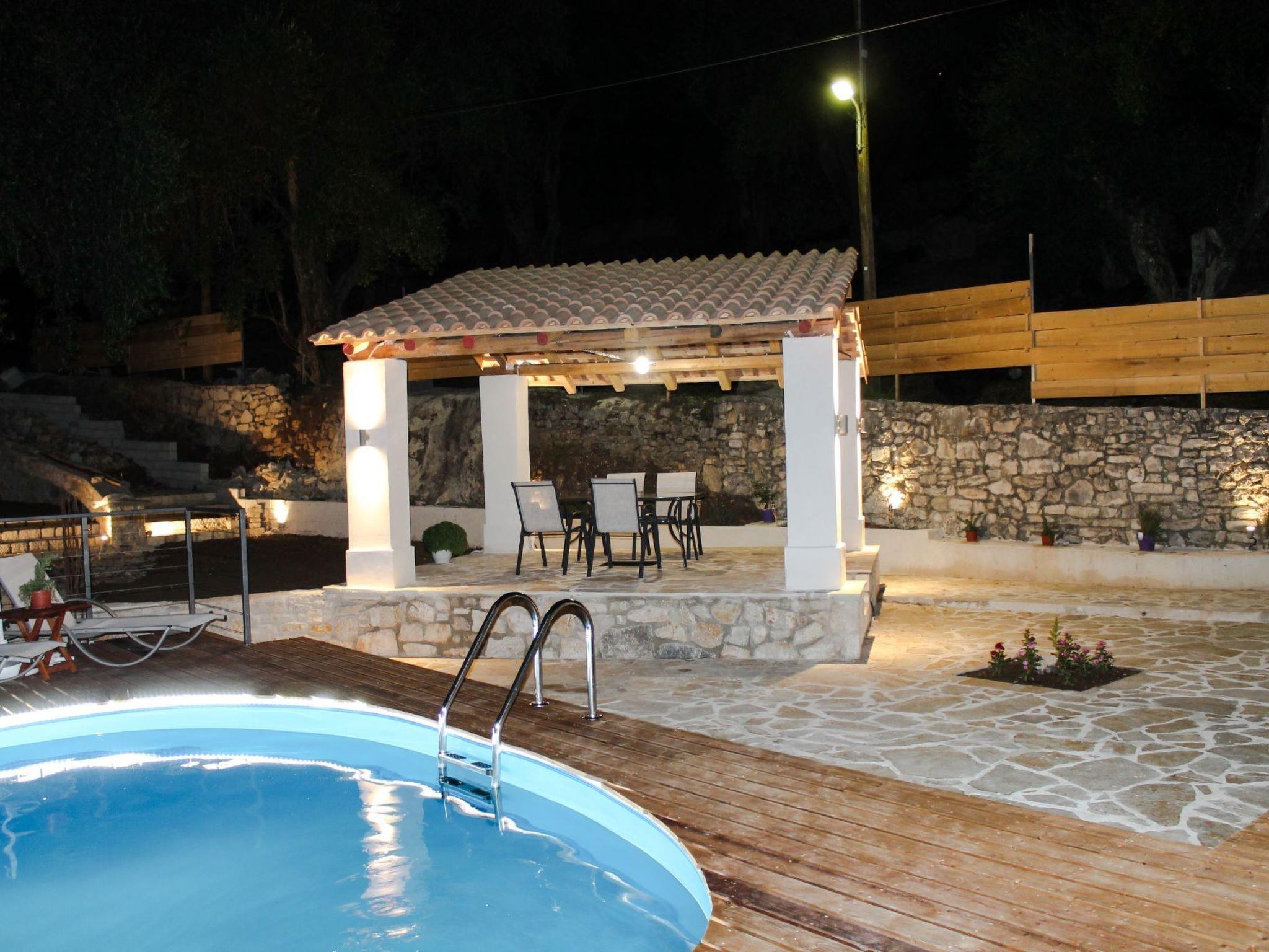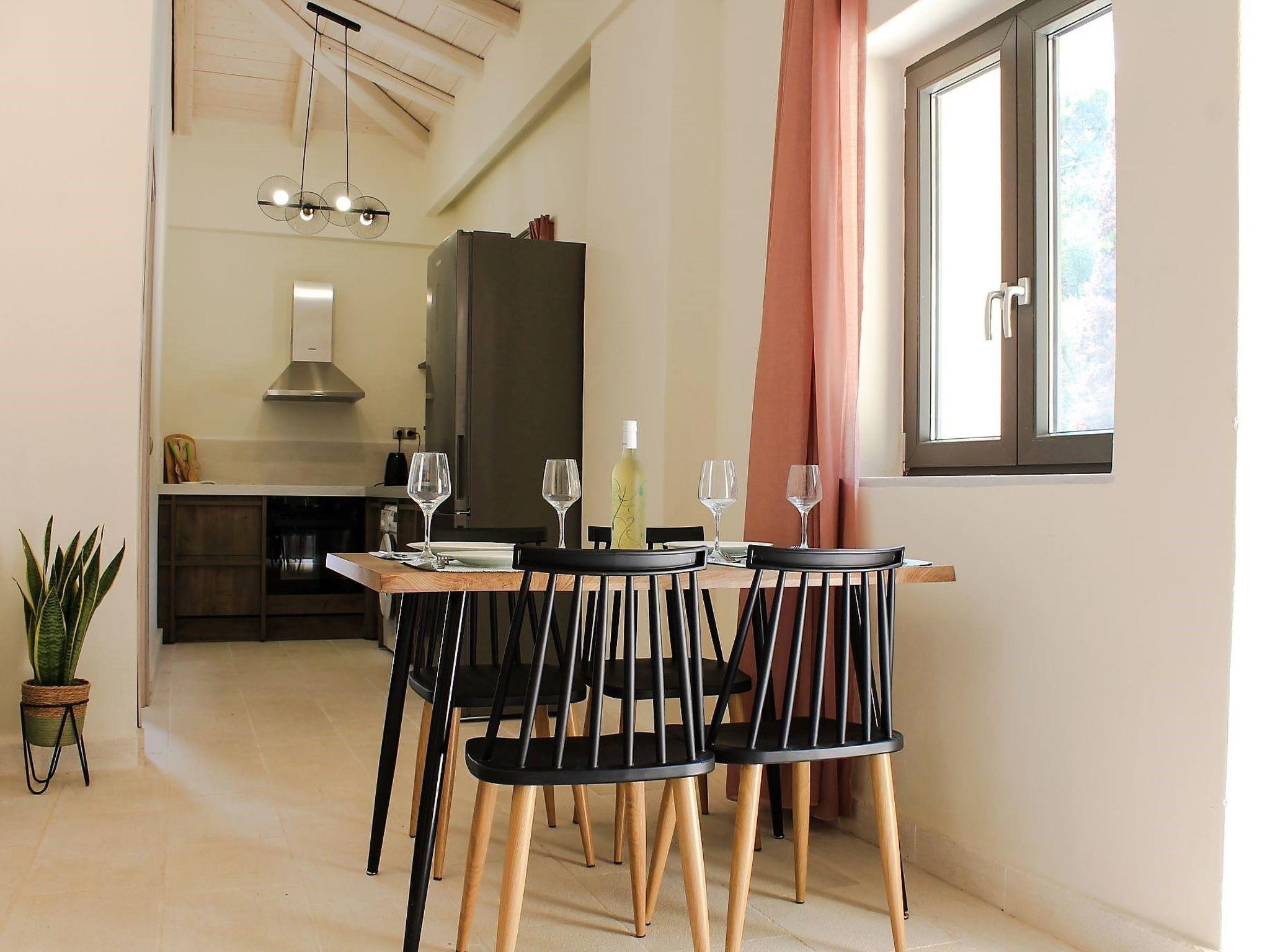 The external staircase from the private parking leads to a lovely and spacious yard with olive trees and greenery.The lovely gazebo with the table where the family can gather and have their meal is situated in such a way that there is always a pleasant breeze. Right next to it there is the house's swimming pool, with sunbeds and a wooden deck.The pool is right next to the stone-built house by the central entrance.The central door leads into a large living room with a sofa and a smart TV, as well as a dining table and a fully equipped kitchen.There are another two bedrooms in the villa, each with a double bed and air conditioning system. The first balcony door leads to the central courtyard, while the second leads to a Juliet balcony. The family bathroom with shower is located right next to the living room.