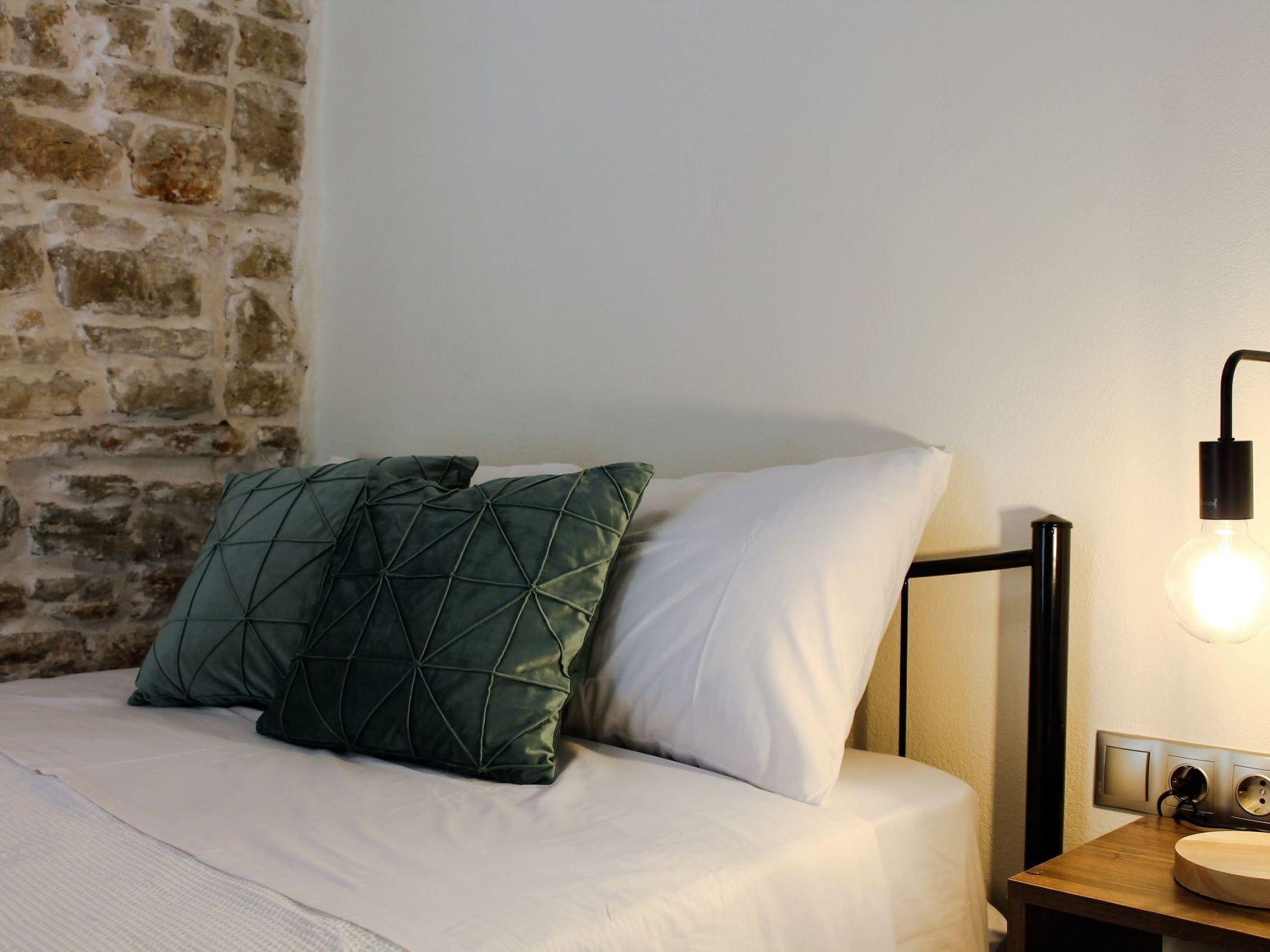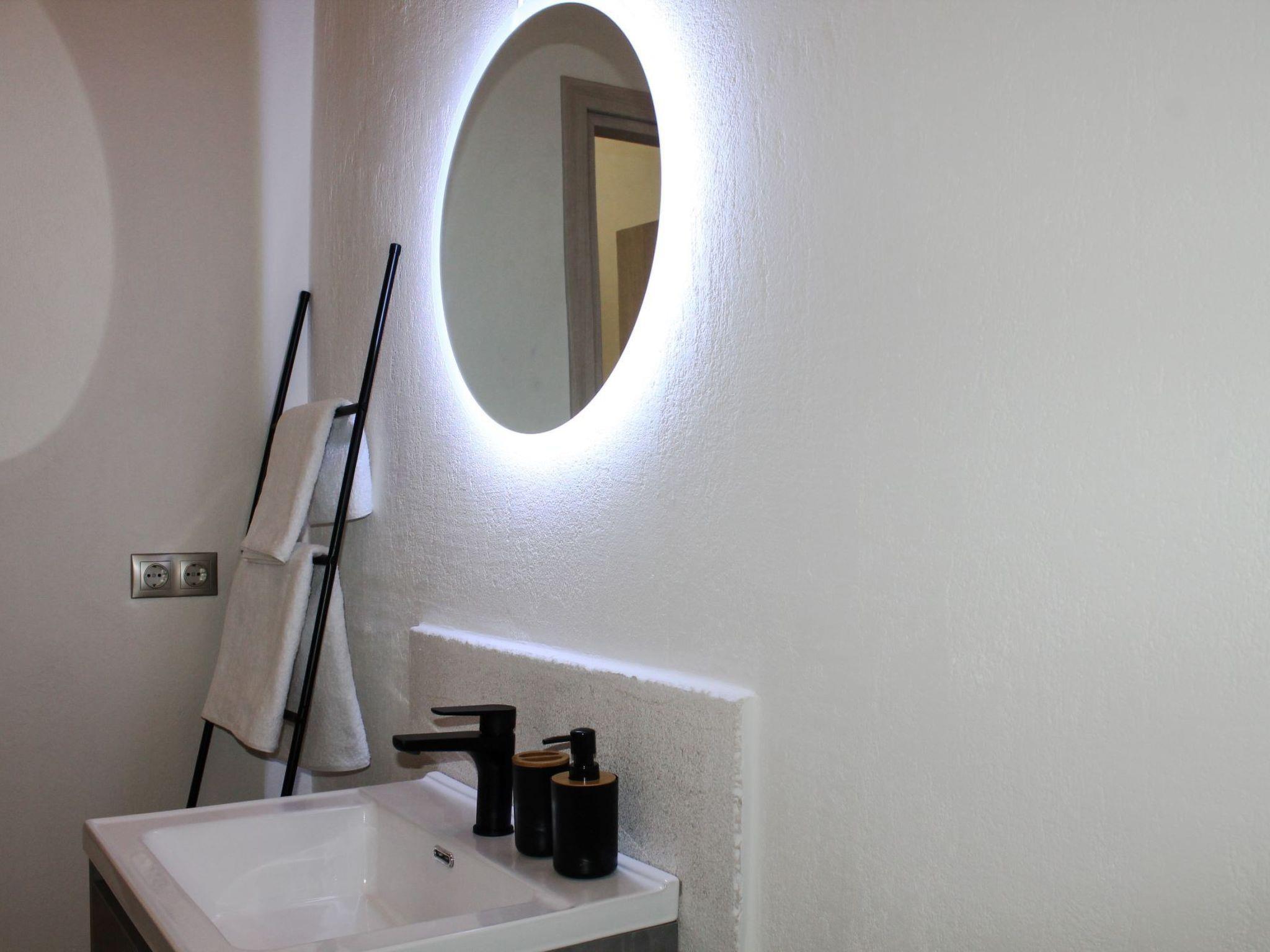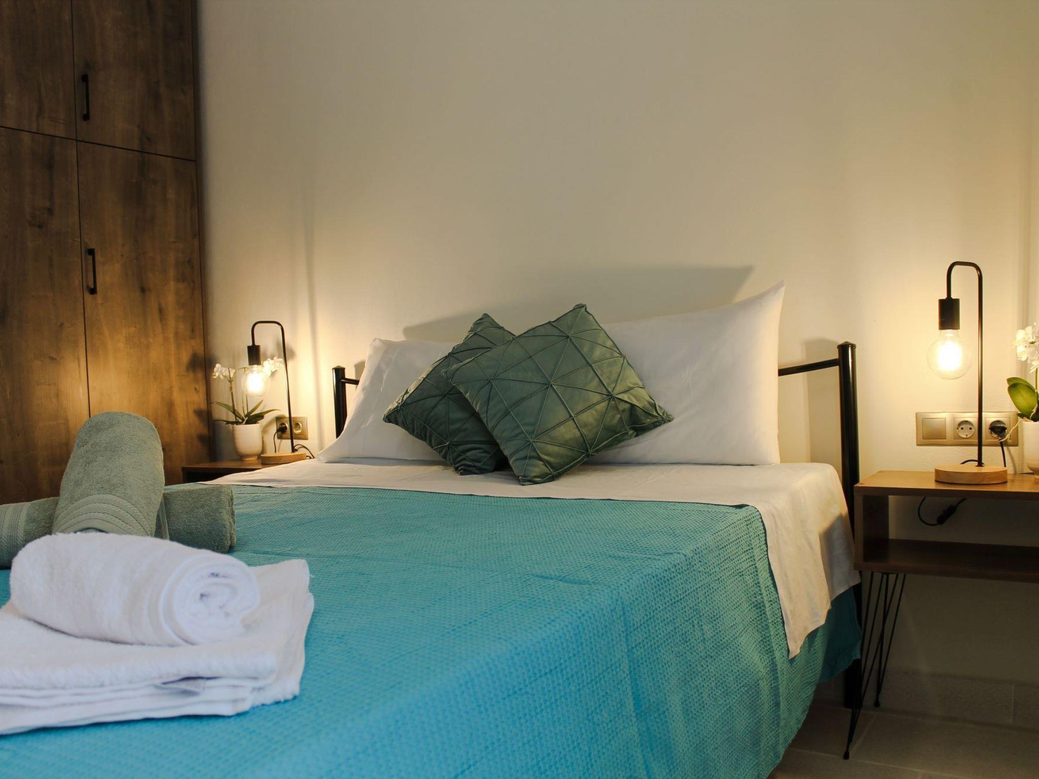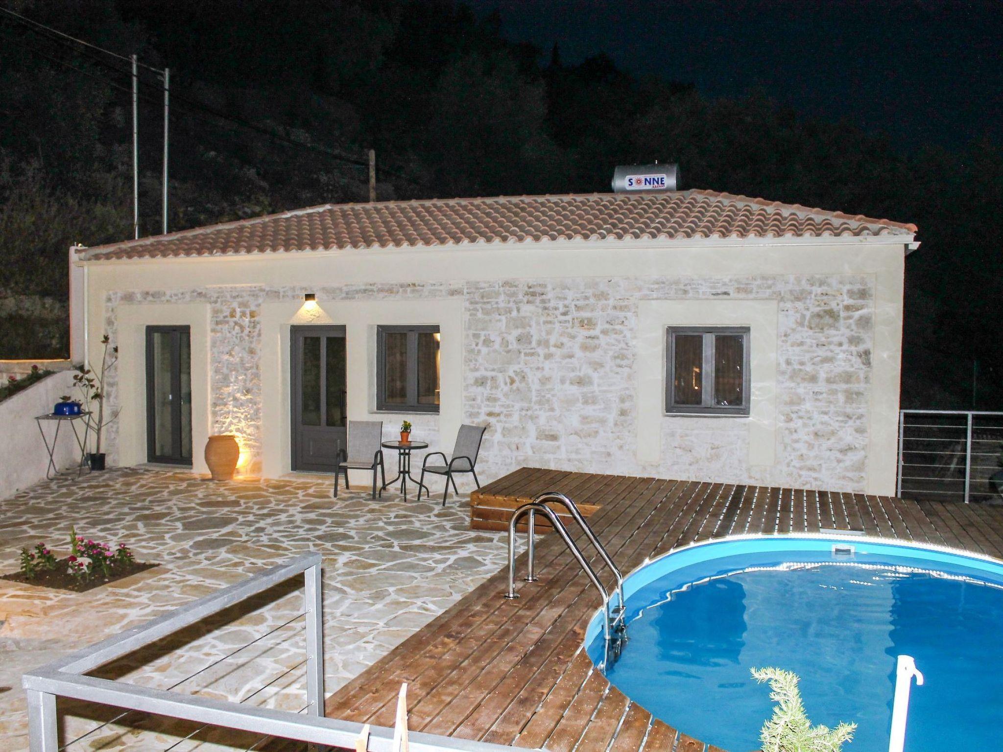 The external staircase from the private parking leads to a lovely and spacious yard with olive trees and greenery.The lovely gazebo with the table where the family can gather and have their meal is situated in such a way that there is always a pleasant breeze. Right next to it there is the house's swimming pool, with sunbeds and a wooden deck.The pool is right next to the stone-built house by the central entrance.The central door leads into a large living room with a sofa and a smart TV, as well as a dining table and a fully equipped kitchen.There are another two bedrooms in the villa, each with a double bed and air conditioning system. The first balcony door leads to the central courtyard, while the second leads to a Juliet balcony. The family bathroom with shower is located right next to the living room.