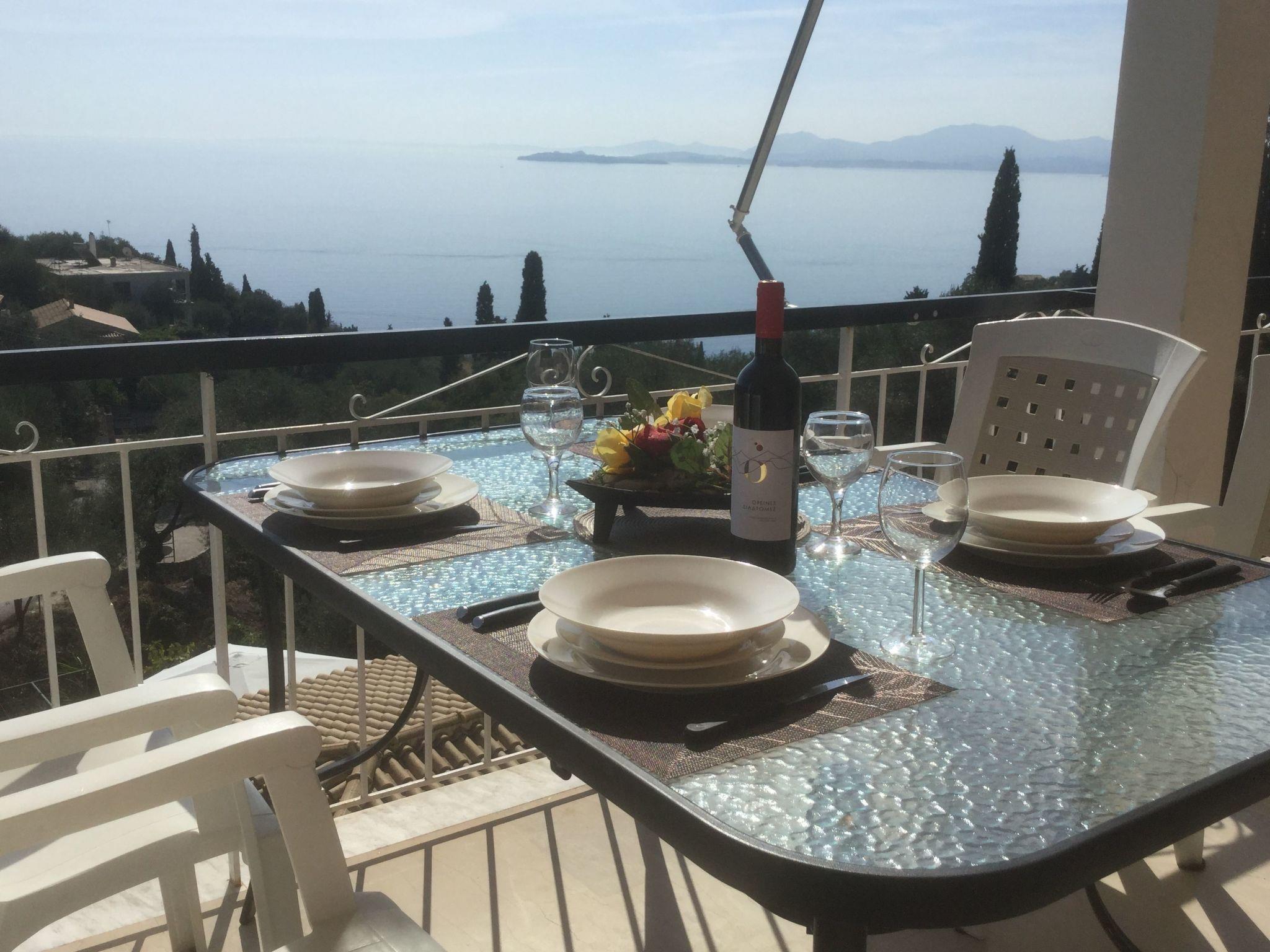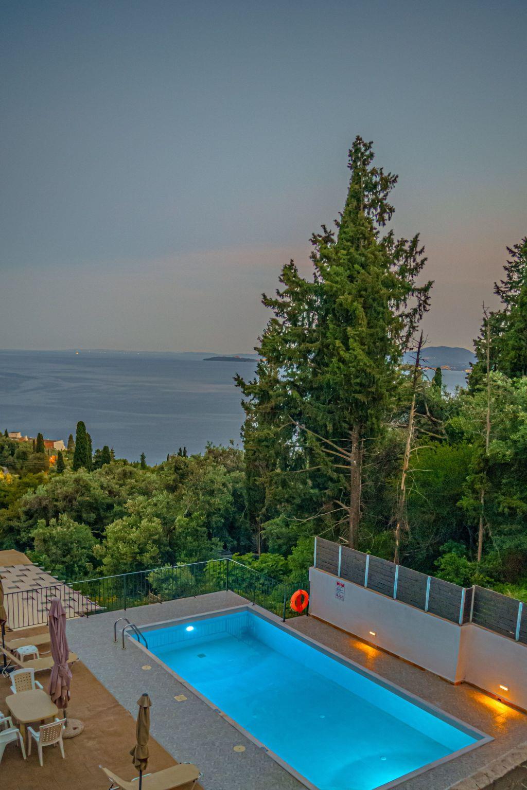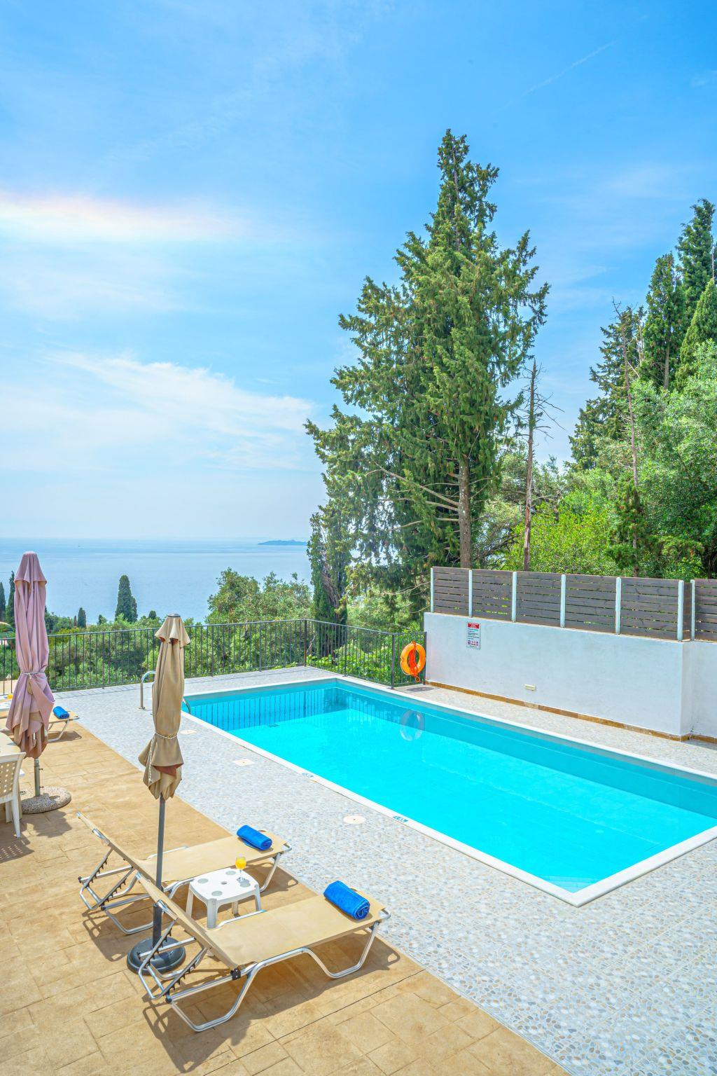 Combining a stunning wide view of the coastiline of Corfu, Zeus apartment has its OWN private use POOL( use only for one apartment) 2 bedrooms, dinning area bathroom, have been lovingly decorated - Fully equiped kitchen,living room, bathroom in perfect spot just 800 meters above Skinos Beach of Nissaki.