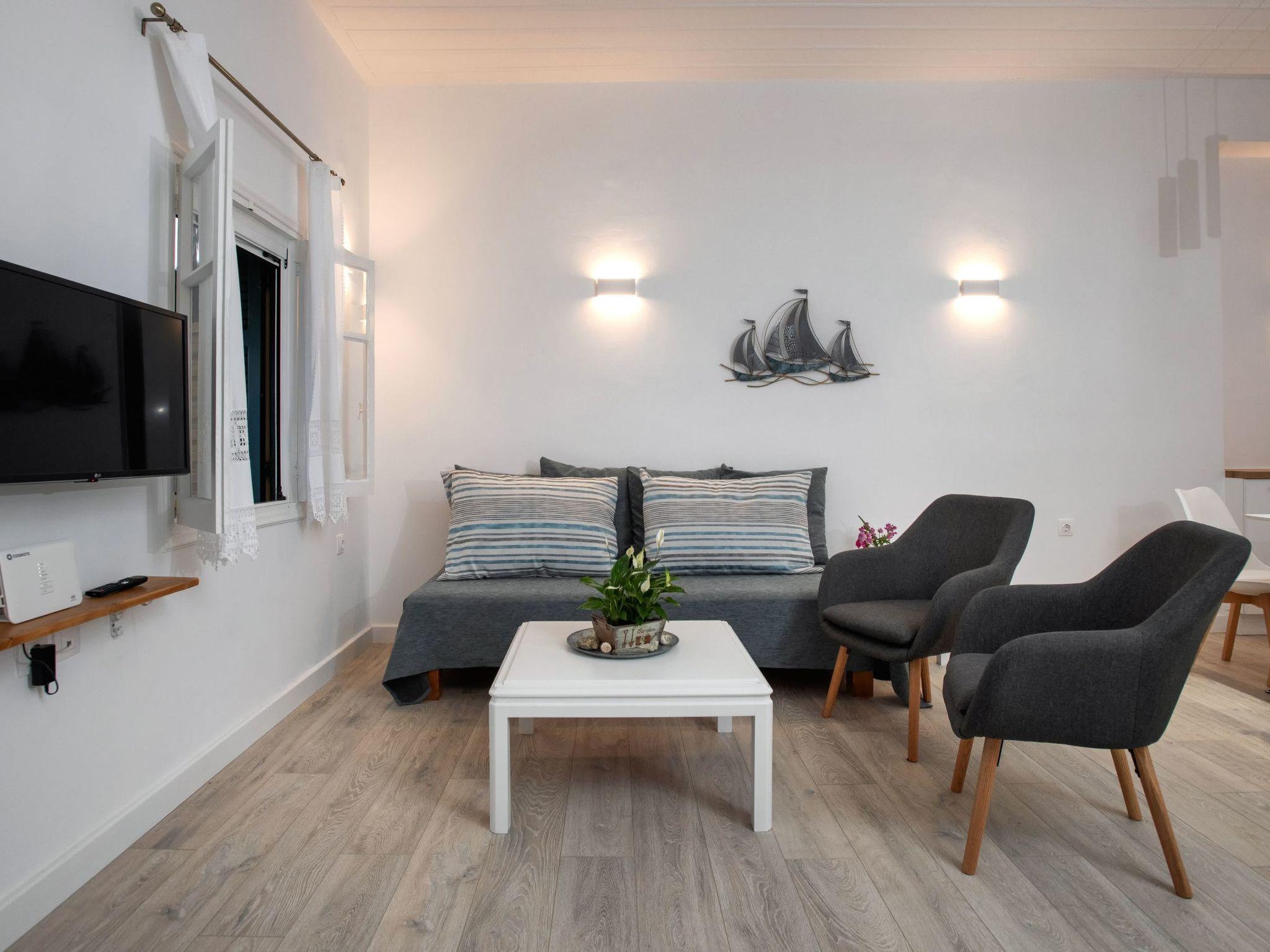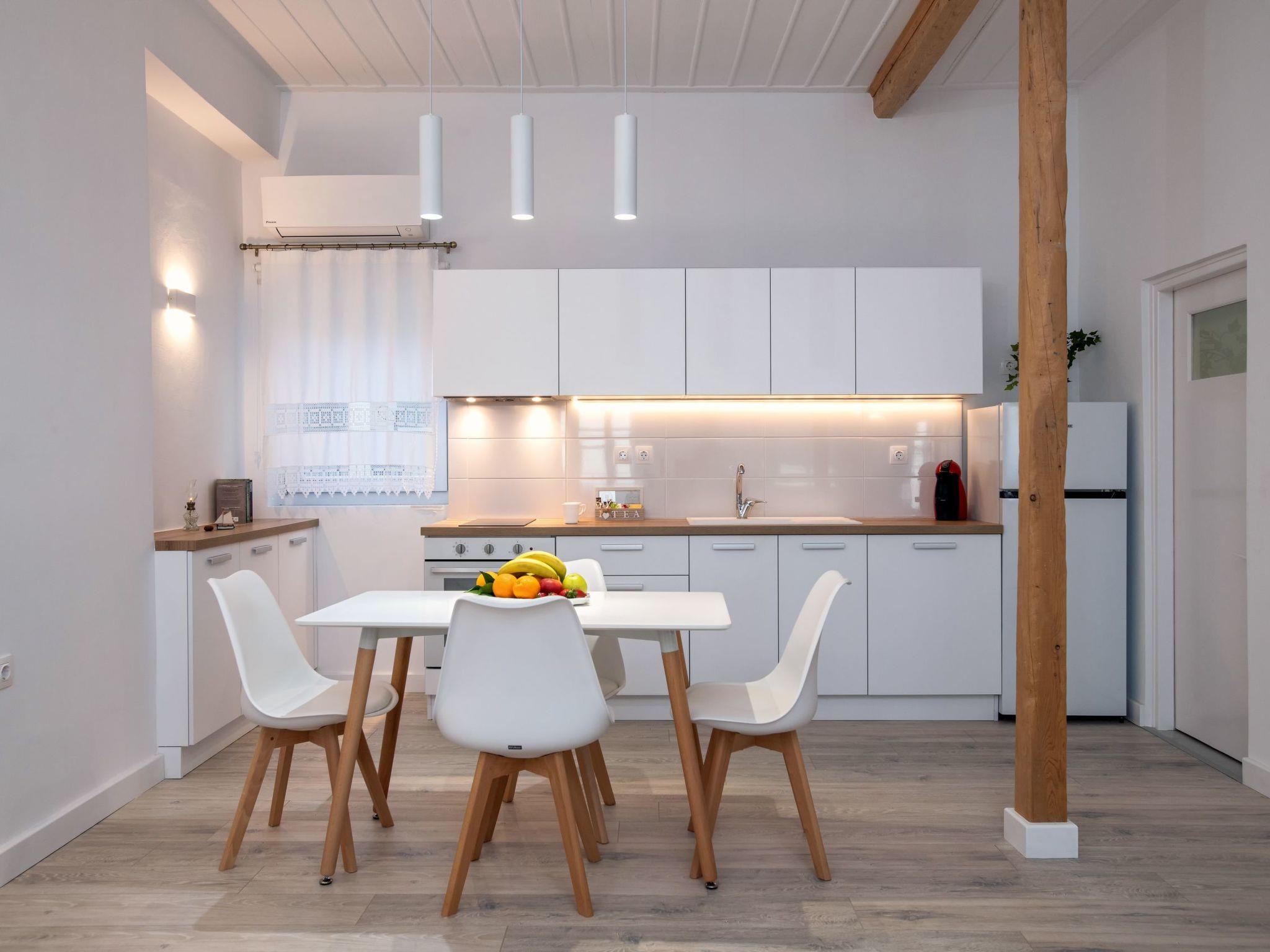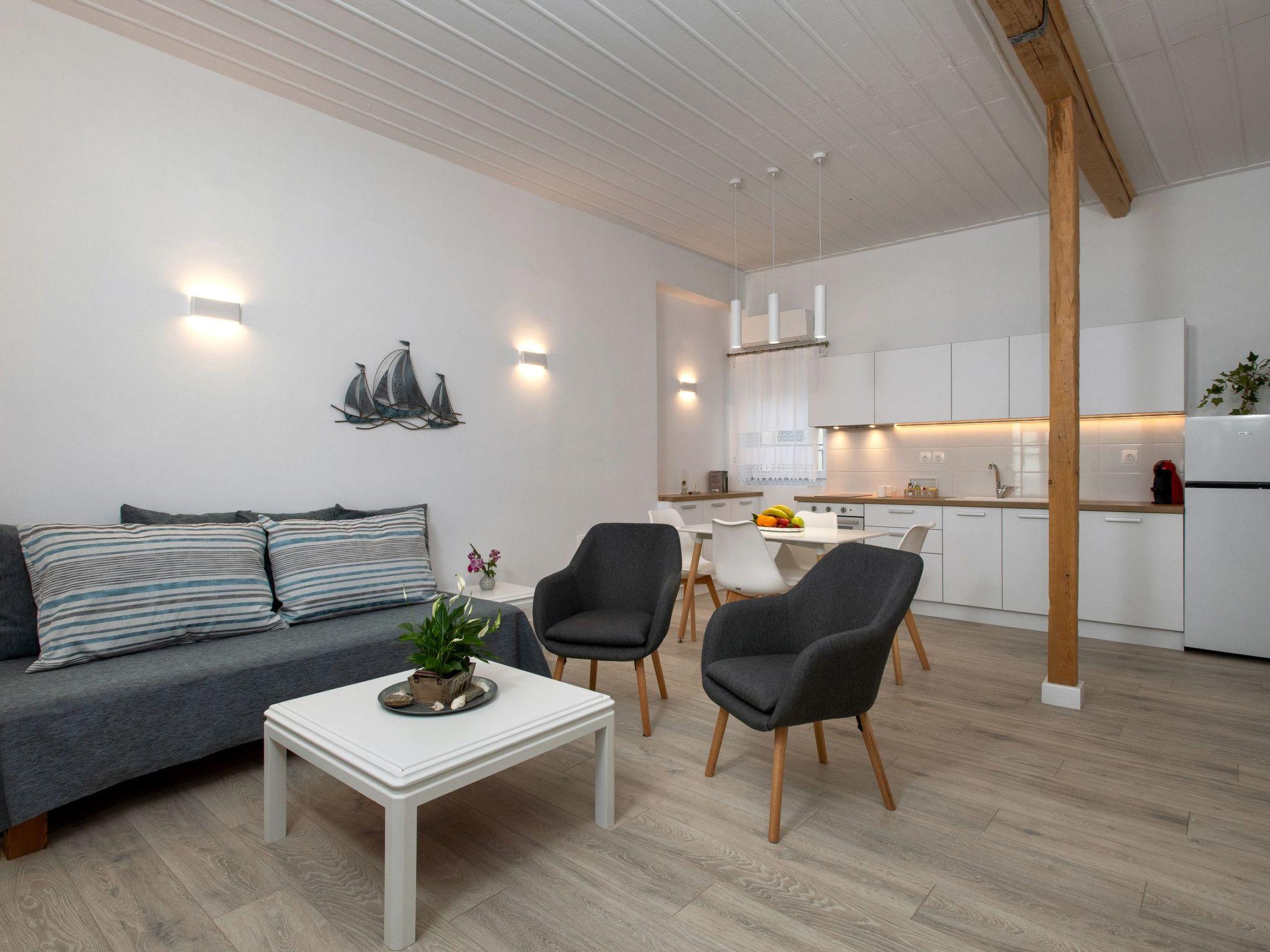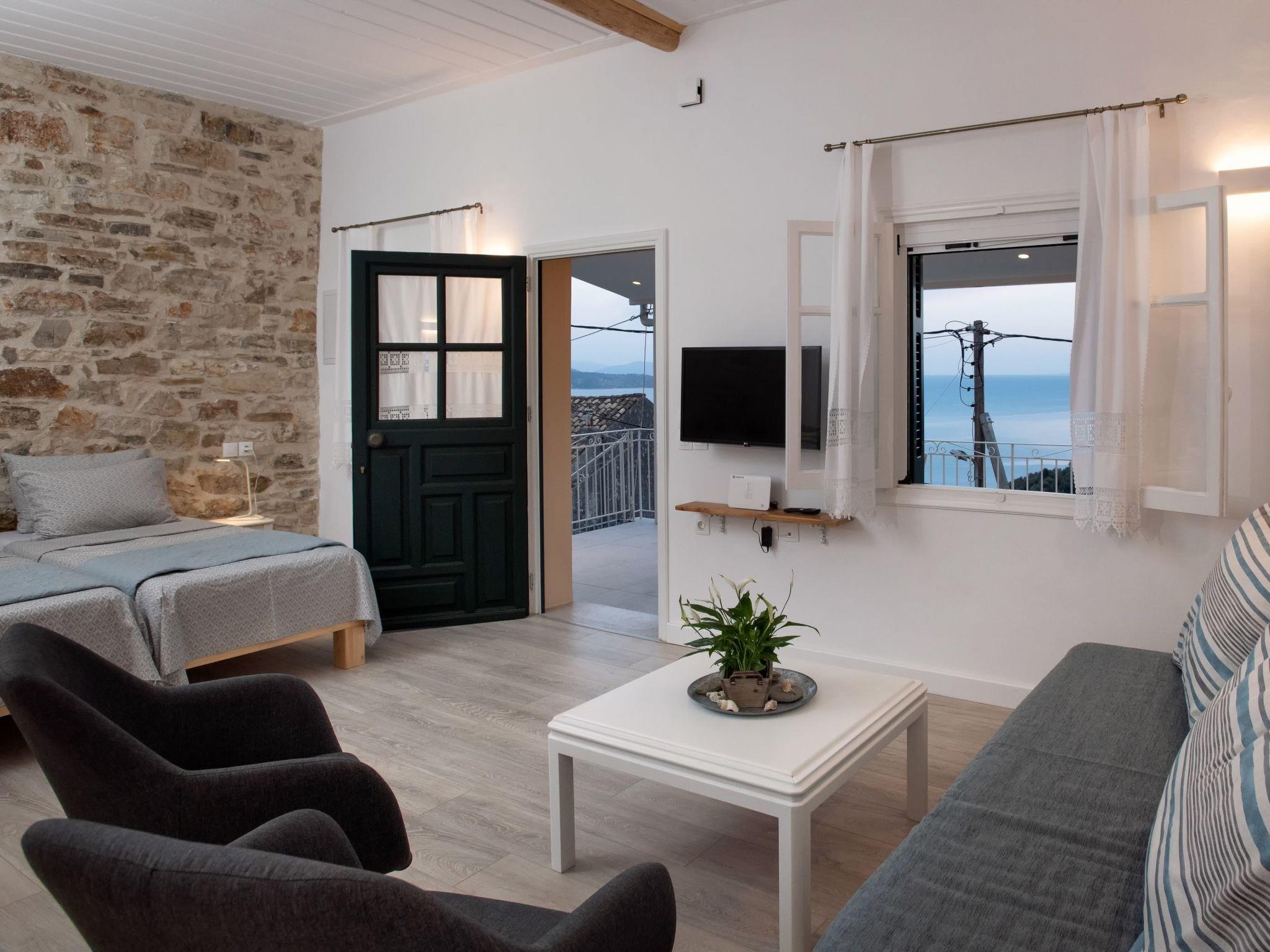 The owners have meticulously combined the traditional components of the house with modern elements of decoration to create a sense of home. The apartment is located on the first floor. The external stairway leads to a covered terrace with panoramic views of the Mediterranean and Albanian coastlines. In clear weather, guests can see all the way to Corfu's Venetian castle and the mainland. On the patio, you can enjoy breakfast and dinner while enjoying the view. The open-plan apartment is furnished with two single beds that can be transformed into a double bed, as well as a comfortable sofa that functions as a third person's or child's bed. In the same area, there is a fully equipped kitchen and a lovely bathroom. The owner has double- paned the windows and balcony doors to offer better soundproofing, and overall increase interior comfort.
