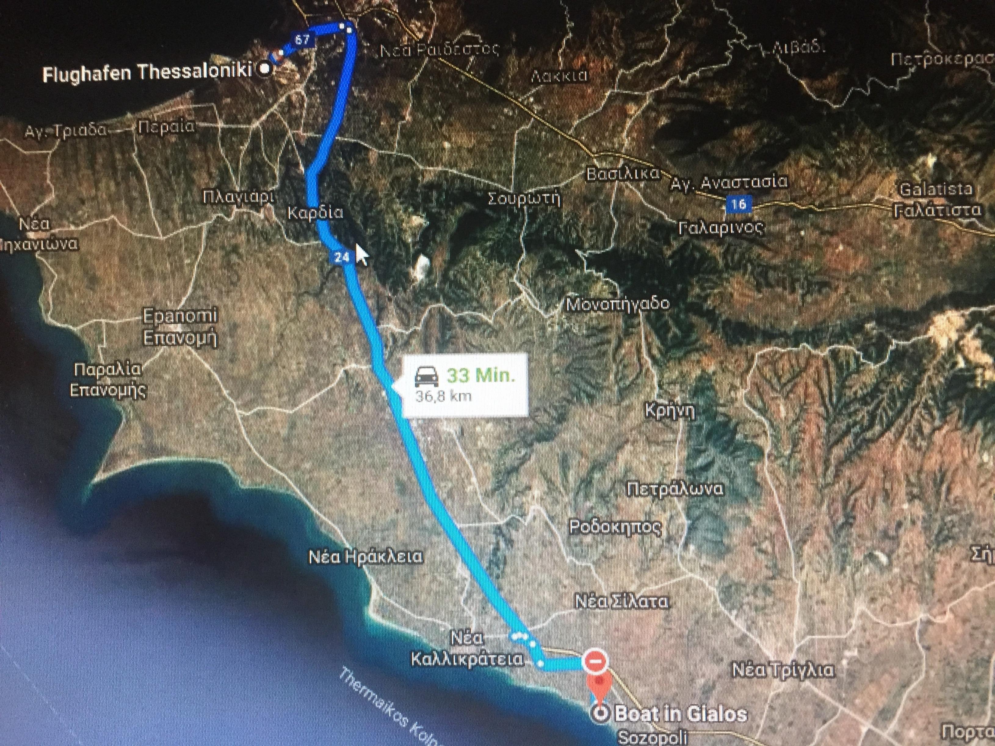 Wichtig zu erwähnen ist, dass sich der Flughafen Thessaloniki nur ca. 40 km von der Wohnung entfernt, befindet. Am Flughafen kann man via Internet im Vorfeld schon das ganze Jahr über bei einem der zahlreichen Autovermieter kostengünstig ein Fahrzeug mieten. Man wird dann von diesen direkt am Flughafen abgeholt und mit Transfer direkt zum gemieteten Fahrzeug verbracht.