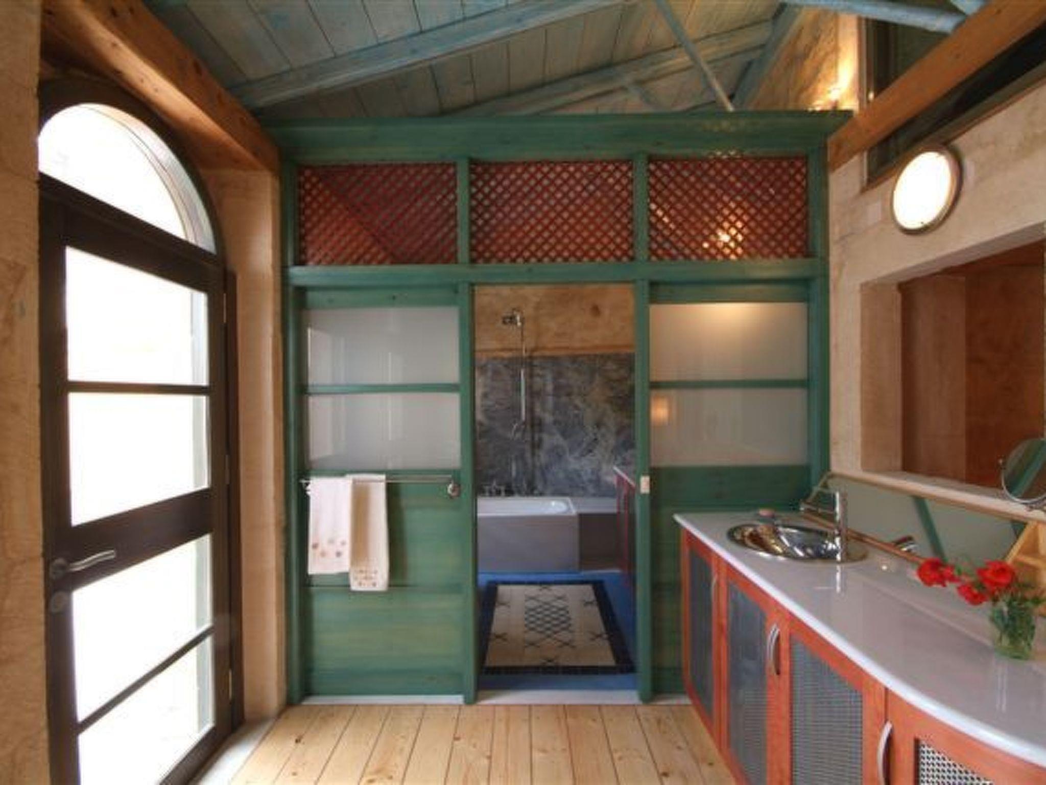 On the north and south-west sides, two courtyards with wooden pergolas and long gardens planted with fruit-bearing trees lend themselves to a direct contact with nature, whereas the small round pool in the south-western courtyard offers some cool during the summer.