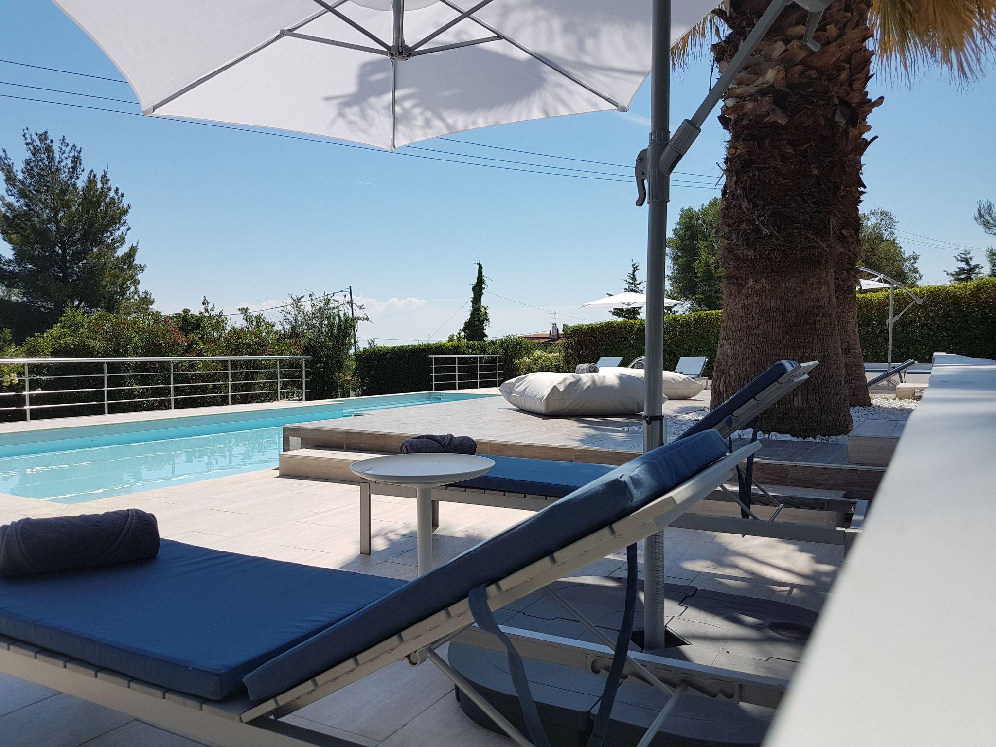 The exterior of the house is amazing. There are 4000 sqm with well maintained lawns, palm trees, pine trees, olive trees and a fully equipped large barbeque kiosk. The villa offers a private pool of 50 square meters.