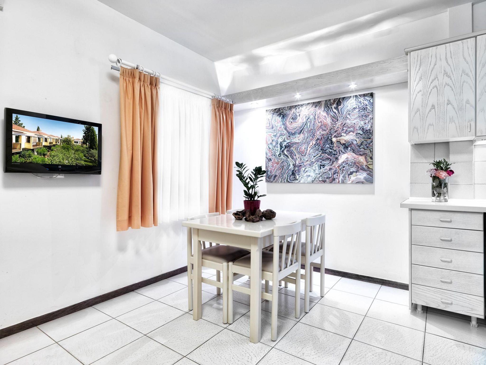 This holiday flat was renovated in 2011 and is located on the ground floor. It has a combined living and dining room, a bedroom and a bathroom. In the living room you will find a cosy sofa, which can be used as a sofa bed. The dining table seats four people. The open-plan kitchen has a 2-ring hob, coffee machine, small fridge, kitchen utensils and a kettle. You will also find a flat-screen satellite TV with local and foreign (some German-language) channels (depending on reception), a telephone, air conditioning and a hire safe. In the bedroom you can prettify yourself in front of the mirror. Next to the double bed (1.60m x 1.90m) you will find a bedside table. The bathroom has a shower, toilet, hairdryer and washbasin. Your air conditioning (bedroom and living area) can provide both cooling and heating. The studios are decorated in different colours, orange or green, take your pick. The speed of the free Wi-Fi in your accommodation depends on the number of other guests who are logged in.