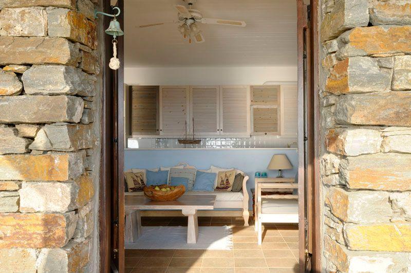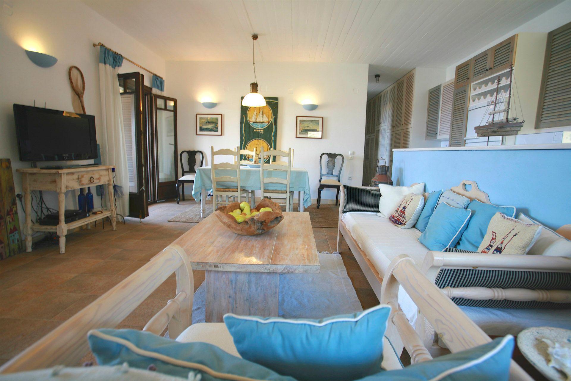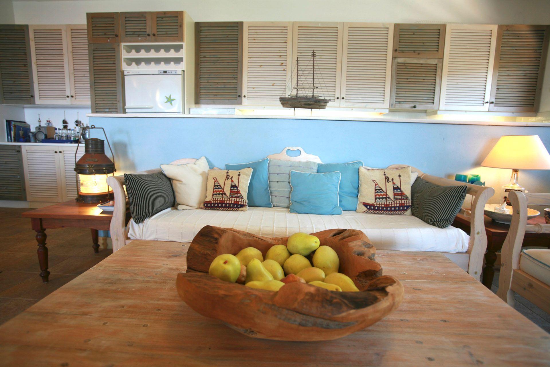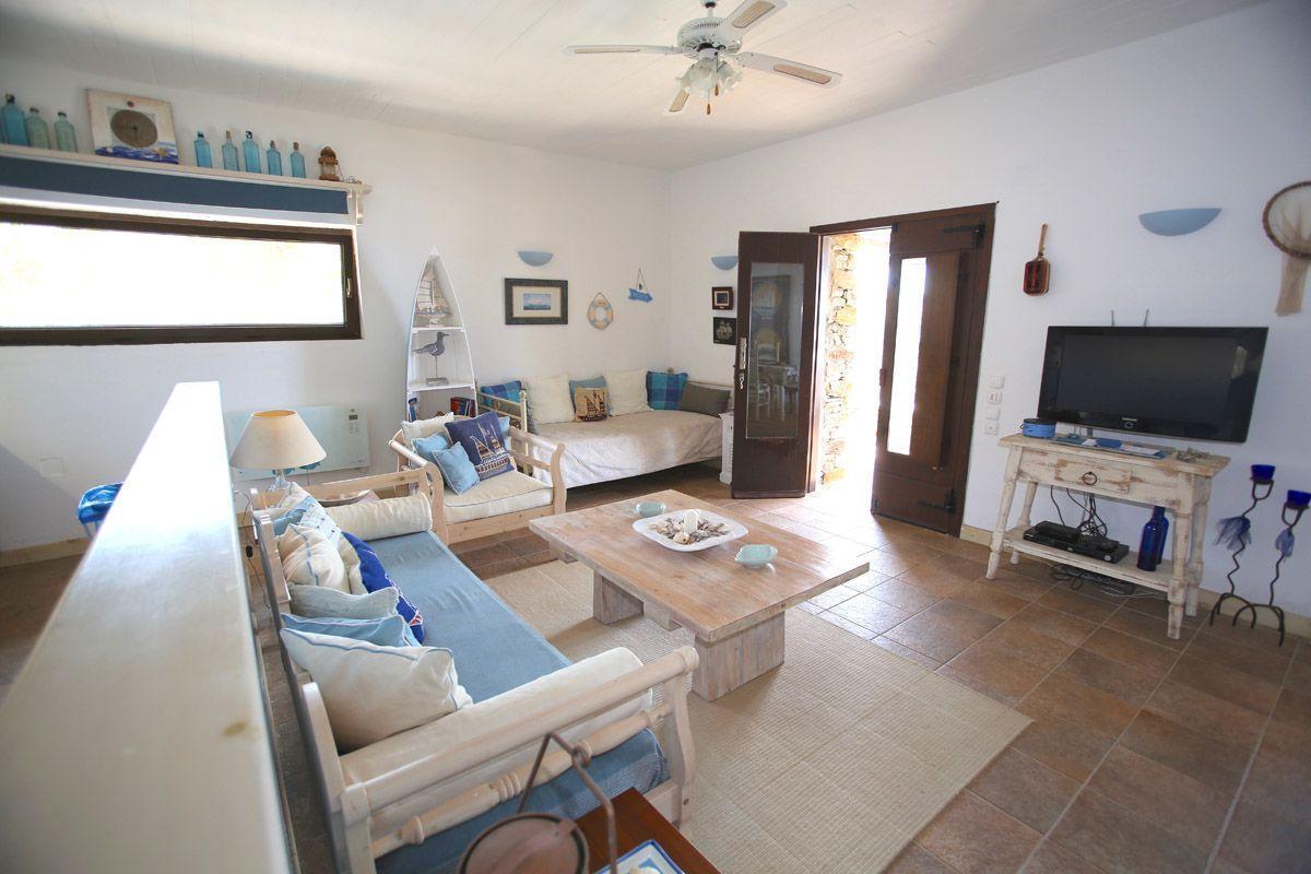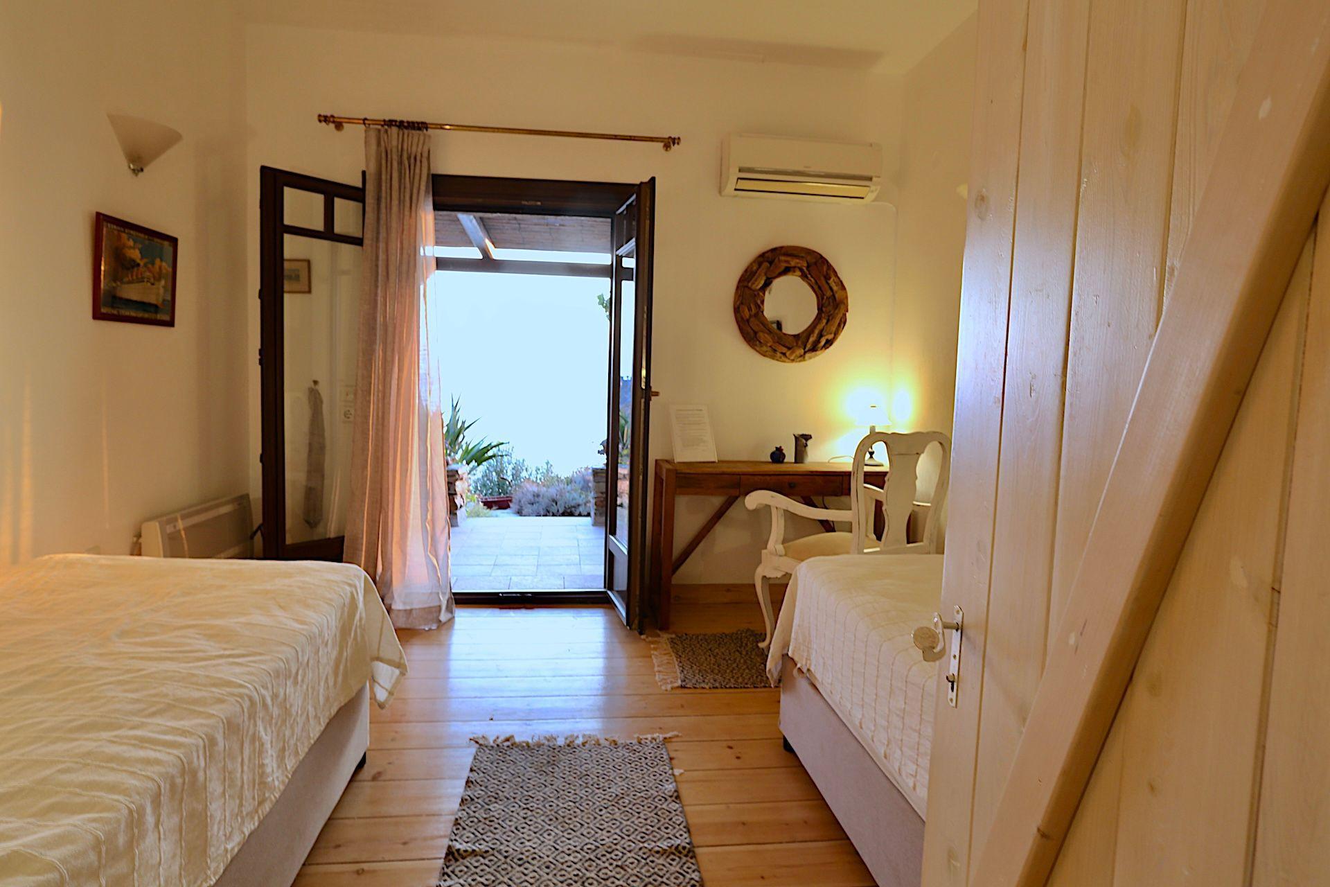 A charming spacious 105 sqm apartment that occupies the entire garden level of the Villa. It is an autonomous house, with its own independent entrance and outside spacious reed-shaded sitting area, offering a unique “on-the-sea”, feet –in-the-water vacation experience and a high level of privacy, a reason why it remains a favorite among our seasoned guests. Not suitable for families with children under 4. This is a self contained apartment 2 bedroom, 1 bathroom (110 sm.), VERY close to the water (17 m!), very private, a stupendous terrace, with an amazing view and quality furnishing & decorations. Sweeping 180 degree sea and sunset view Property with high quality furnishings Immediate beach access (3 min walk)- Maria Beach House (BH) is a luxurious, charming spacious apartment that occupies the whole lower level of the Villa Phil. Maria BH is a completely independent house, with its own independent entrance and outside reed-shaded sitting areas, offering a unique “on-the-sea”, feet –in-the-water vacation experience, a high level of privacy and remaining a favorite among seasoned guests. The upper level of the unit is occupied by the owners who provide daily support Inside: Large living nautically themed living room with single bed-divan (80X200cm) and immediate access to sea-viewing terrace & garden, dining hall, open plan fully equipped kitchen, master bedroom (queen size, built bed), guest bedroom (two singles), one large bathroom with shower. Equipment: 32” LCD HD TV, DVD, mini Hi-Fi, ceiling fans in all rooms, quality bedroom anatomic mattresses, kitchen with quality appliances by NEFF & BOSCH, refrigerator, oven, hood, dishwasher, microwave, mixer, blender, coffee machine, espresso maker, toaster, solar water heater, vacuum cleaner, clothes washer (shared), outside shower (shared), water softener. 1 GB wifi per week. Outside: 70 sq meters of reed-shaded terrace in the garden with sea view, teak wood outside furniture, sun/lounge chairs, American gas-lava rock outside BBQ, open air parking, succulent/ Mediterranean garden.