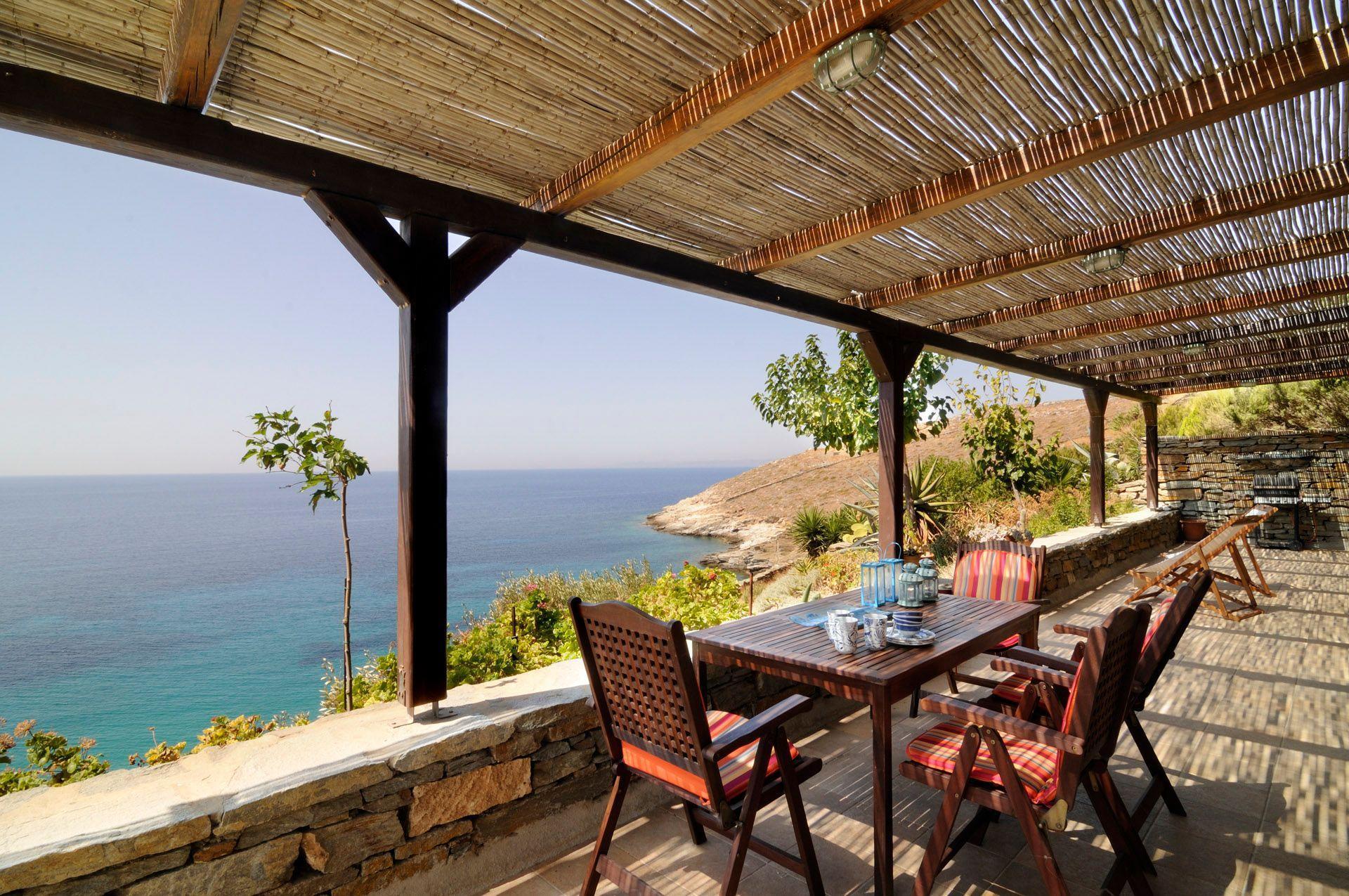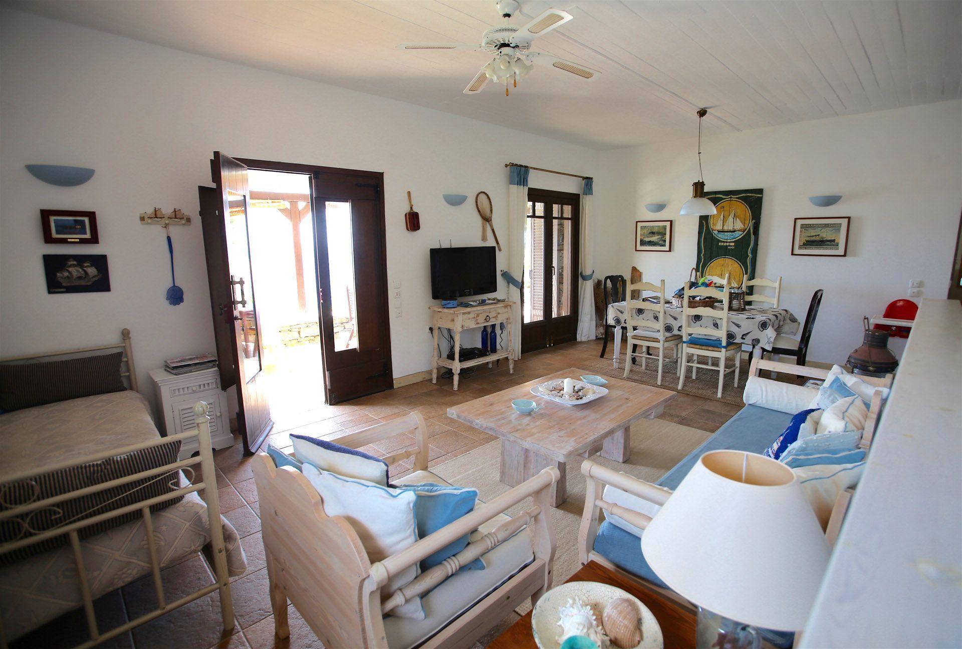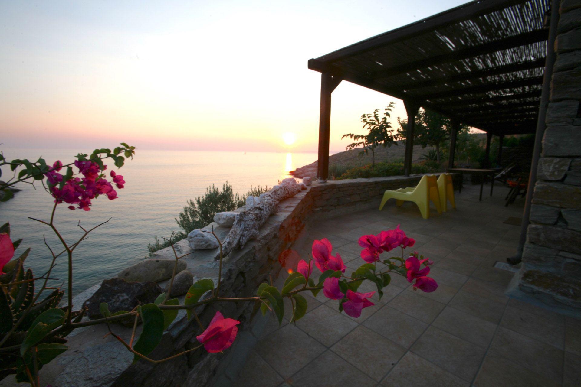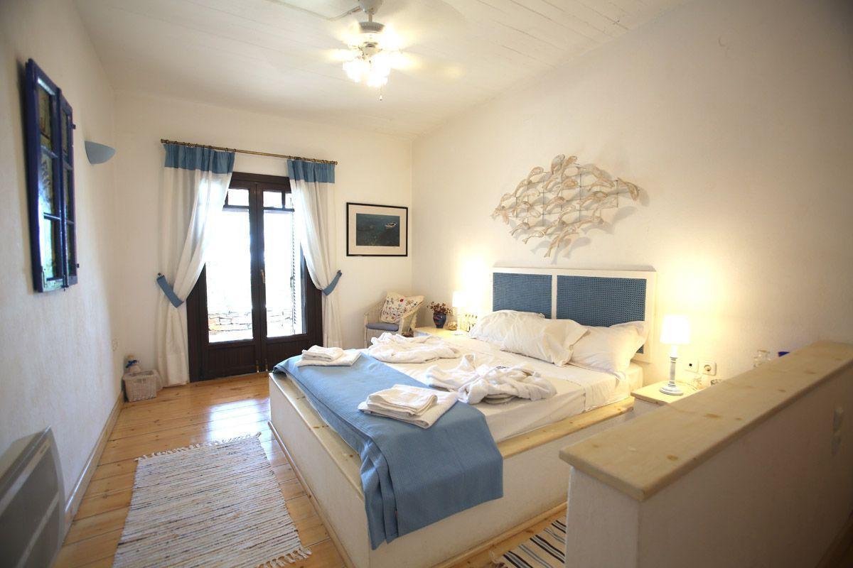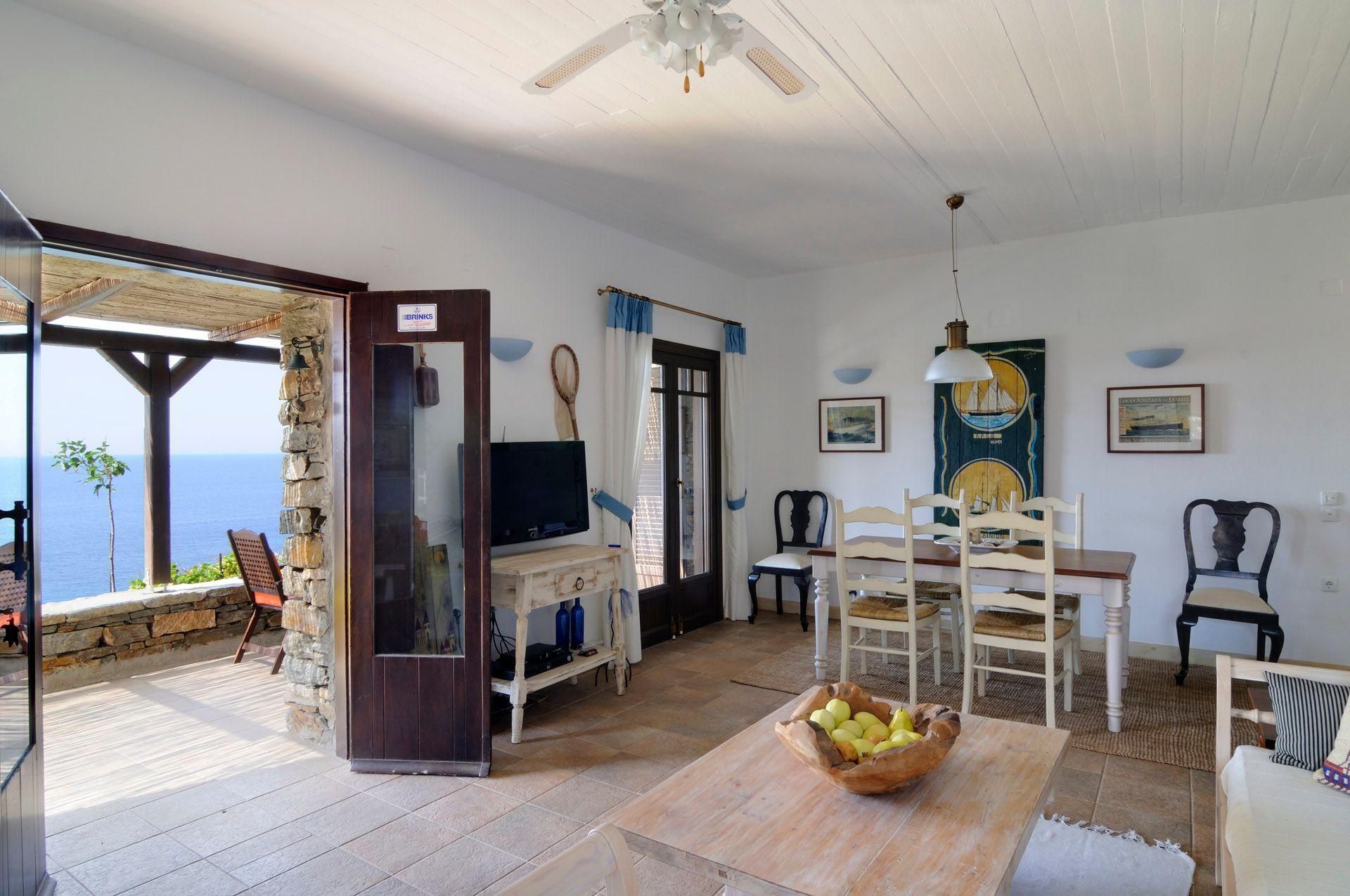 A charming spacious 105 sqm apartment that occupies the entire garden level of the Villa. It is an autonomous house, with its own independent entrance and outside spacious reed-shaded sitting area, offering a unique “on-the-sea”, feet –in-the-water vacation experience and a high level of privacy, a reason why it remains a favorite among our seasoned guests. Not suitable for families with children under 4. This is a self contained apartment 2 bedroom, 1 bathroom (110 sm.), VERY close to the water (17 m!), very private, a stupendous terrace, with an amazing view and quality furnishing & decorations. Sweeping 180 degree sea and sunset view Property with high quality furnishings Immediate beach access (3 min walk)- Maria Beach House (BH) is a luxurious, charming spacious apartment that occupies the whole lower level of the Villa Phil. Maria BH is a completely independent house, with its own independent entrance and outside reed-shaded sitting areas, offering a unique “on-the-sea”, feet –in-the-water vacation experience, a high level of privacy and remaining a favorite among seasoned guests. The upper level of the unit is occupied by the owners who provide daily support Inside: Large living nautically themed living room with single bed-divan (80X200cm) and immediate access to sea-viewing terrace & garden, dining hall, open plan fully equipped kitchen, master bedroom (queen size, built bed), guest bedroom (two singles), one large bathroom with shower. Equipment: 32” LCD HD TV, DVD, mini Hi-Fi, ceiling fans in all rooms, quality bedroom anatomic mattresses, kitchen with quality appliances by NEFF & BOSCH, refrigerator, oven, hood, dishwasher, microwave, mixer, blender, coffee machine, espresso maker, toaster, solar water heater, vacuum cleaner, clothes washer (shared), outside shower (shared), water softener. 1 GB wifi per week. Outside: 70 sq meters of reed-shaded terrace in the garden with sea view, teak wood outside furniture, sun/lounge chairs, American gas-lava rock outside BBQ, open air parking, succulent/ Mediterranean garden.