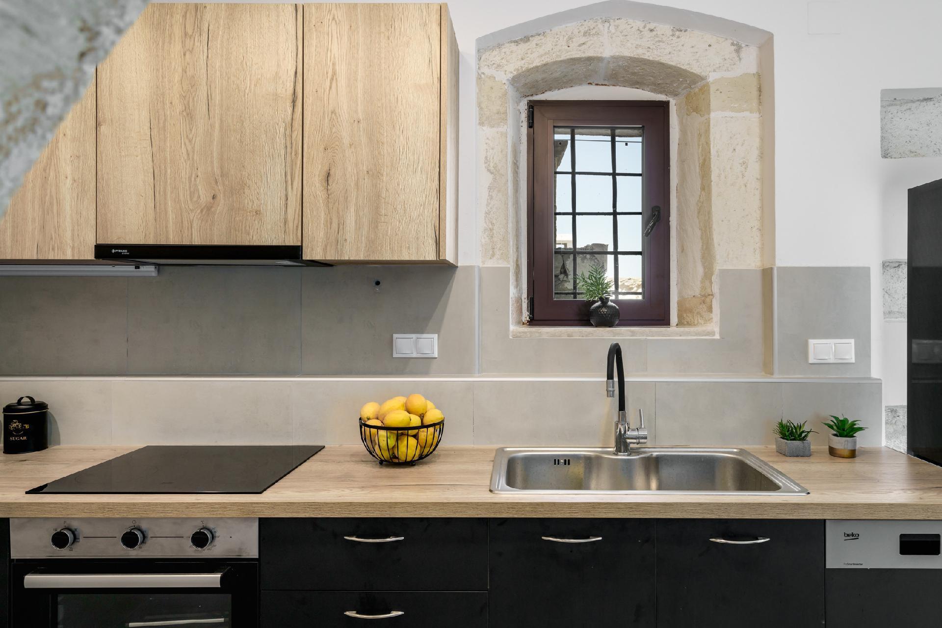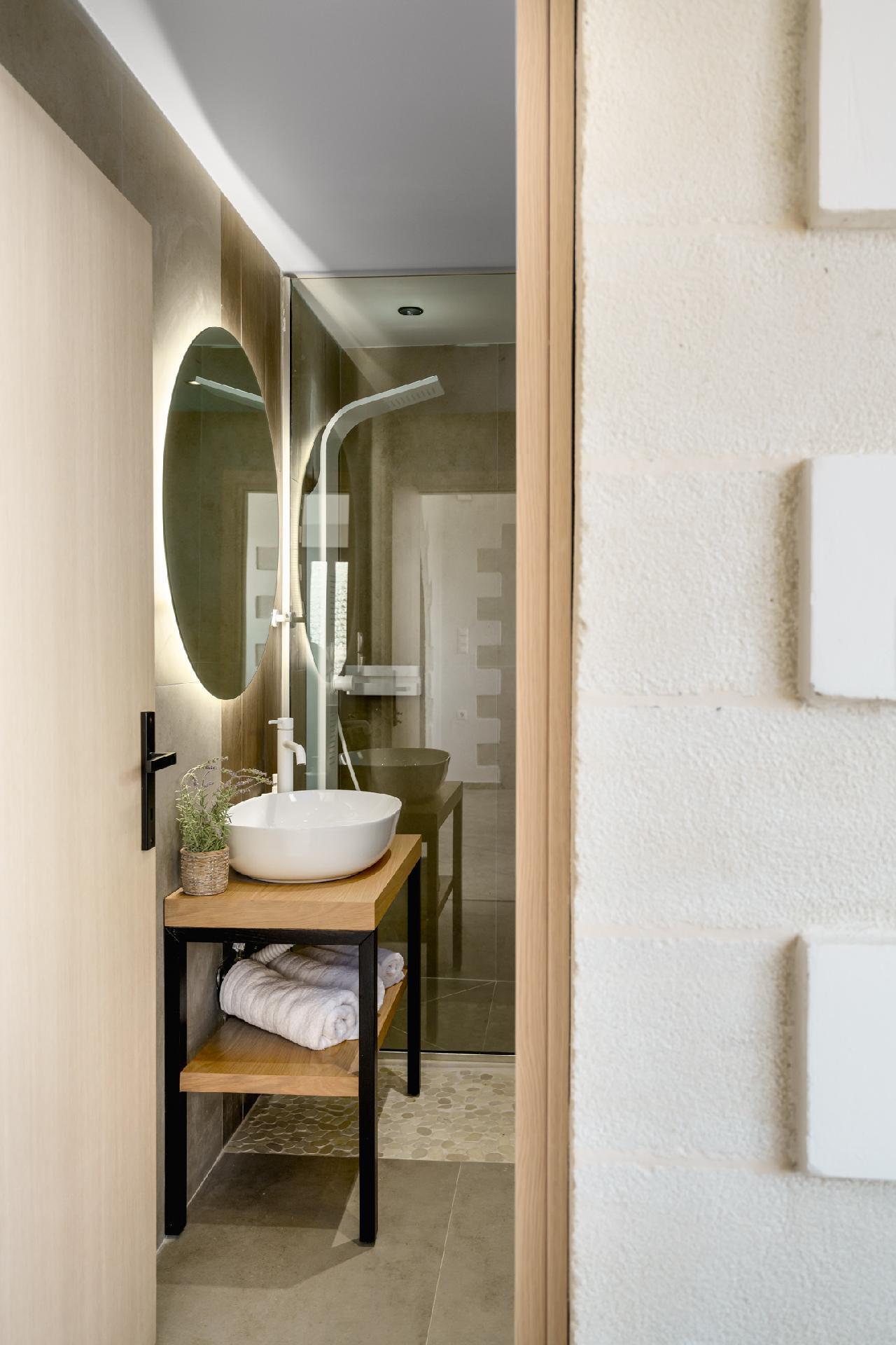 Inside, the house speaks in a quiet, confident voice. Restored on 150-year-old foundations, its open-plan layout flows from one zone to the next with intention. The kitchen and living area are joined under a hand-carved stone arch — part of the original structure — with clean lines, muted tones, and elemental simplicity anchoring the design.