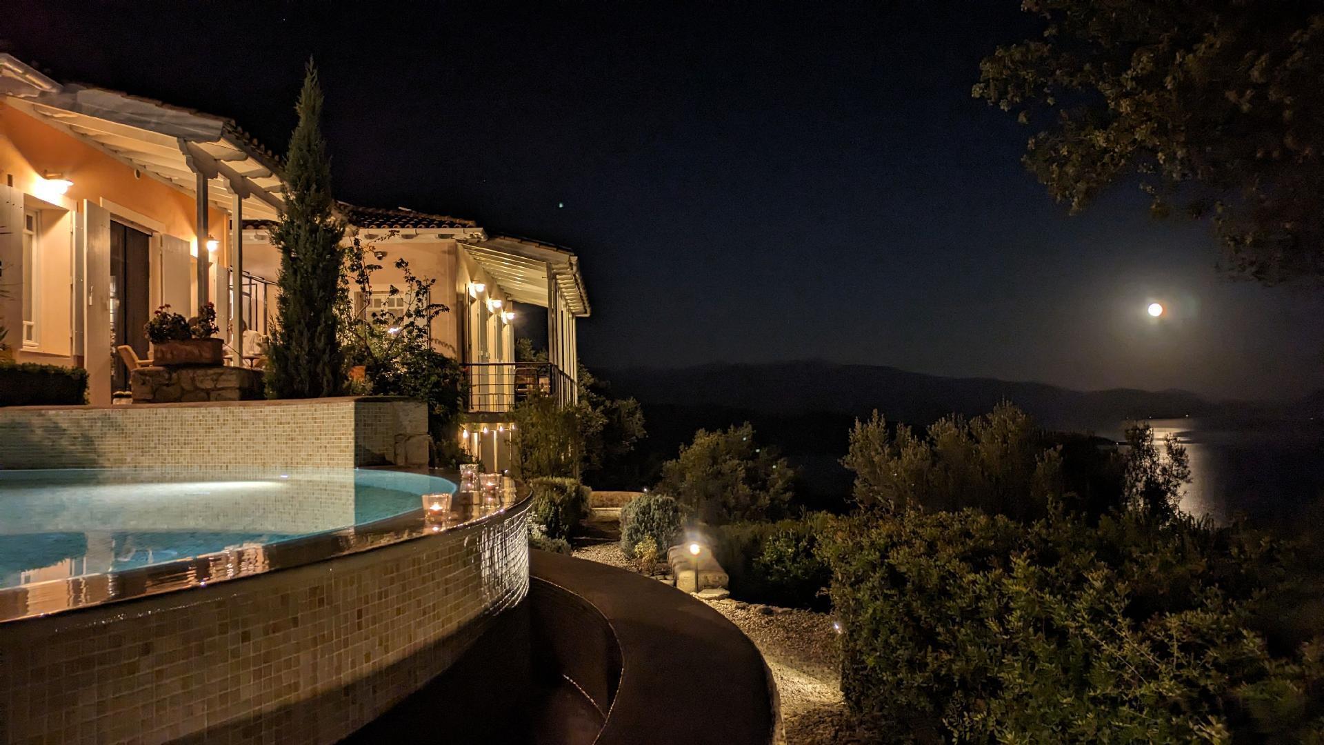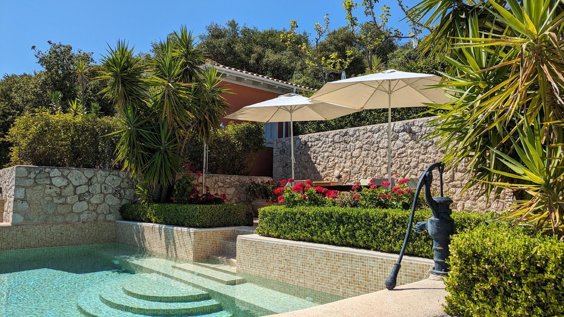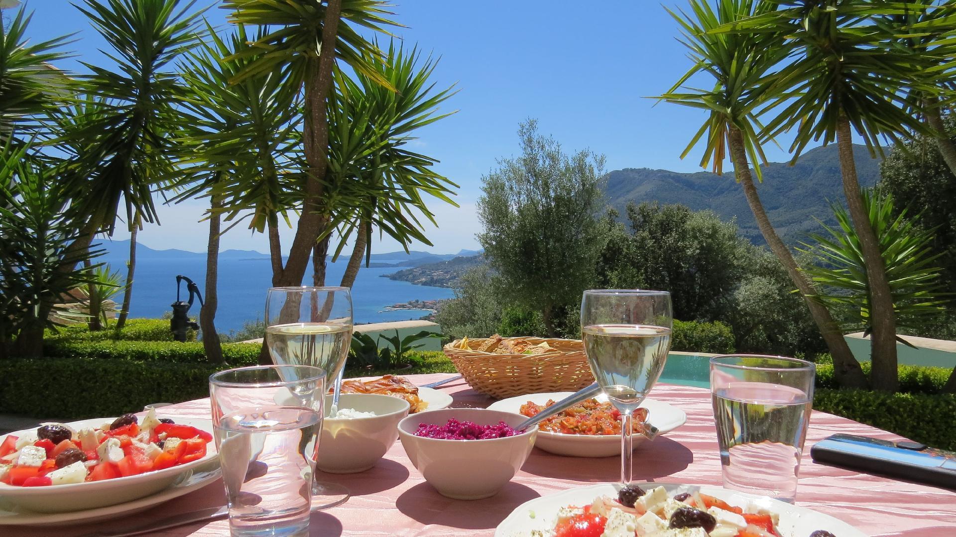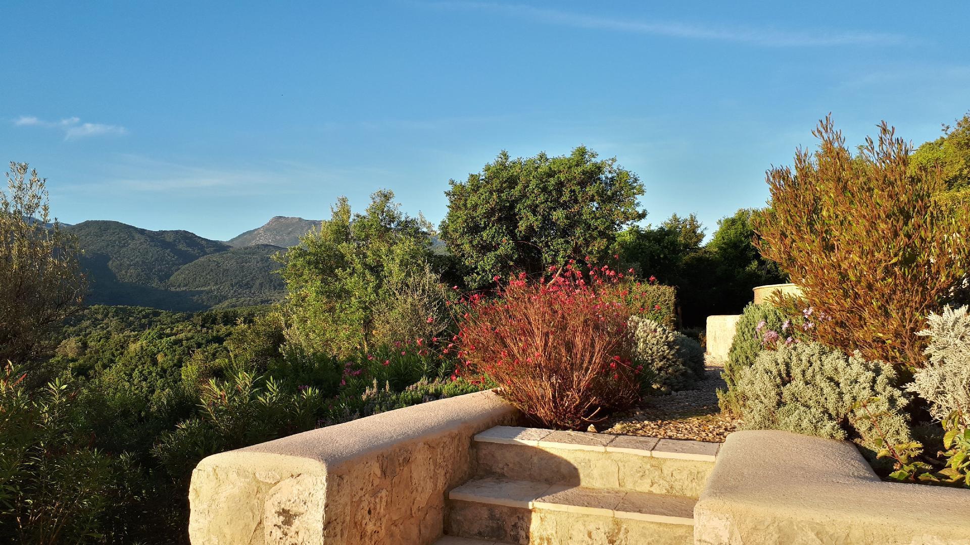 In the two-storey main house you will find the large living room with integrated, fully equipped kitchen, a dining table for 6 people, the couch group by the fireplace and the balcony from which you can enjoy a fantastic view. On the lower floor there is an additional bathroom. There is also our bedroom, which is not rented out. Of course, we are not present while you are renting the property, so you can enjoy the wonderful privacy of the house undisturbed. In the Wing - which is connected to the upper floor of the main house by a glazed passage - on the sea side you will find a bedroom (walk-through room with a comfortable sofa bed) which can also be used as a second living room, a separate toilet room with washbasin and another bedroom with its own master-bathroom. This makes the Wing ideal for a couple or parents with one child. On the opposite side of the pool terrace (which offers the most beautiful views towards the sea and mountains) there is a detached studio with integrated living/bedroom, en-suite bathroom and mini-kitchen as well as its own small terrace. This is ideal for two adults or teenagers.
