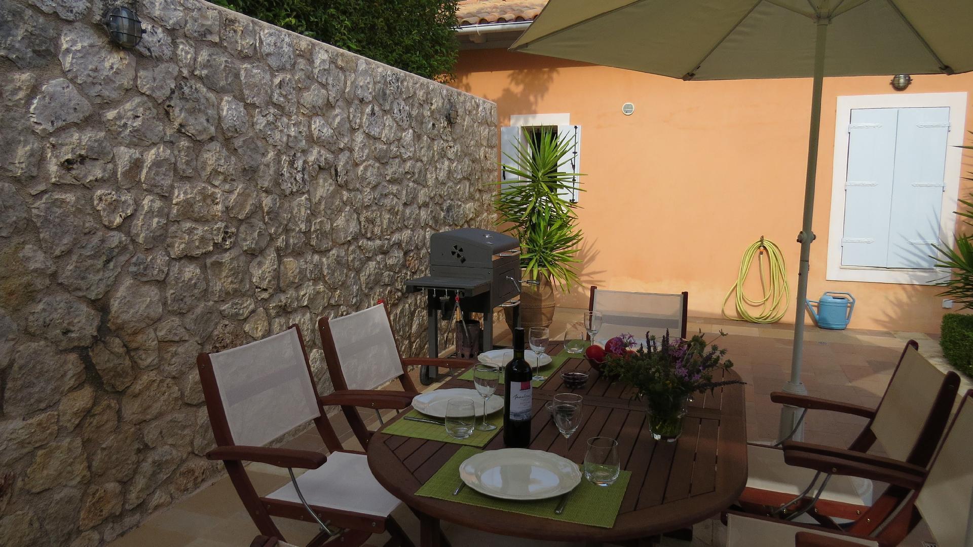- tiled pool terrace with dining table, 6 chairs, parasols, barbecue