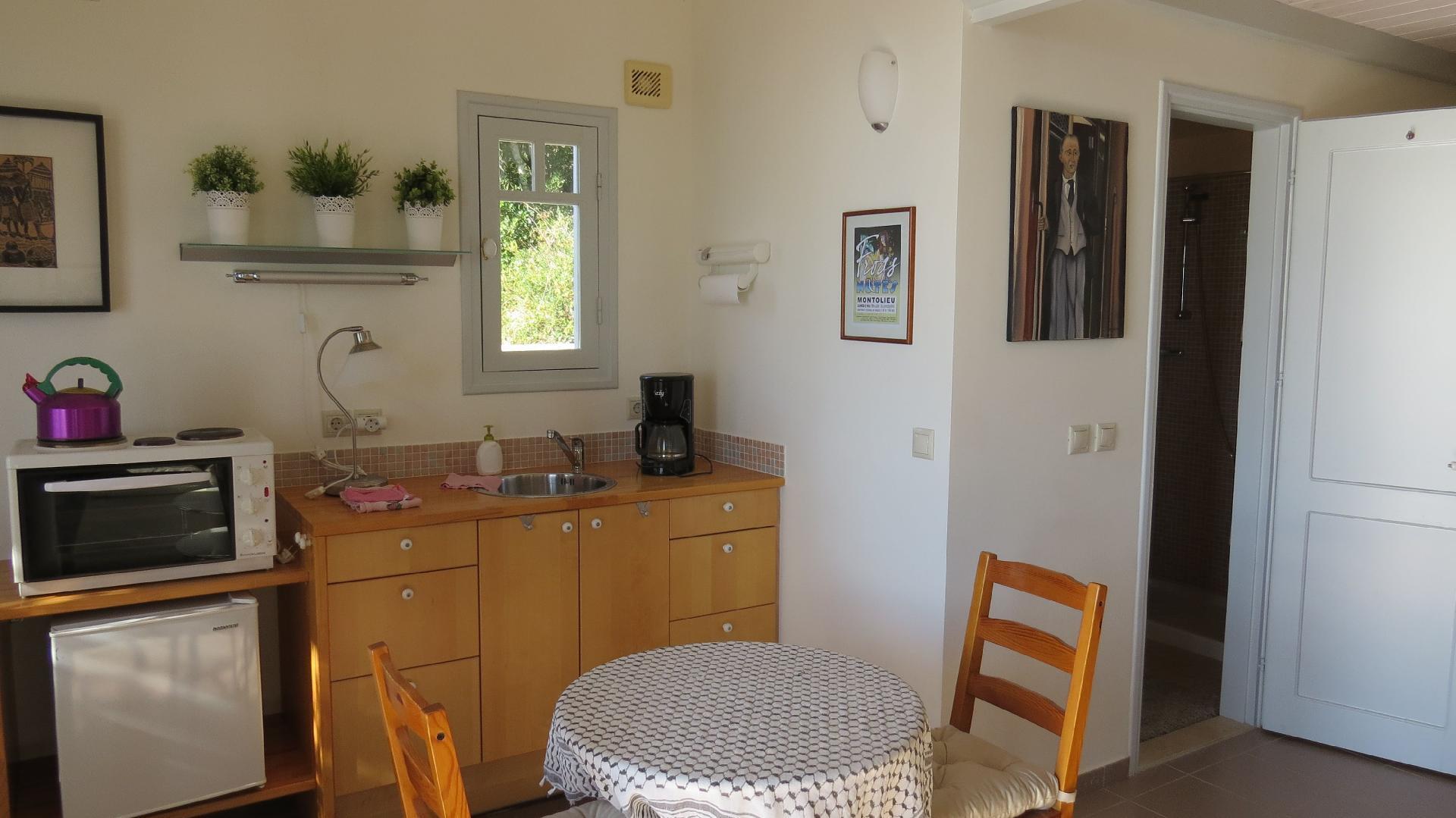 - Bedroom 3 (this is the bedroom in the studio): AC, insect nets in all windows and the patio door, refrigerator, coffee maker, mini-kitchen with mini-oven, couch, armchairs, table, chairs, wardrobe, books, TV (satellite).