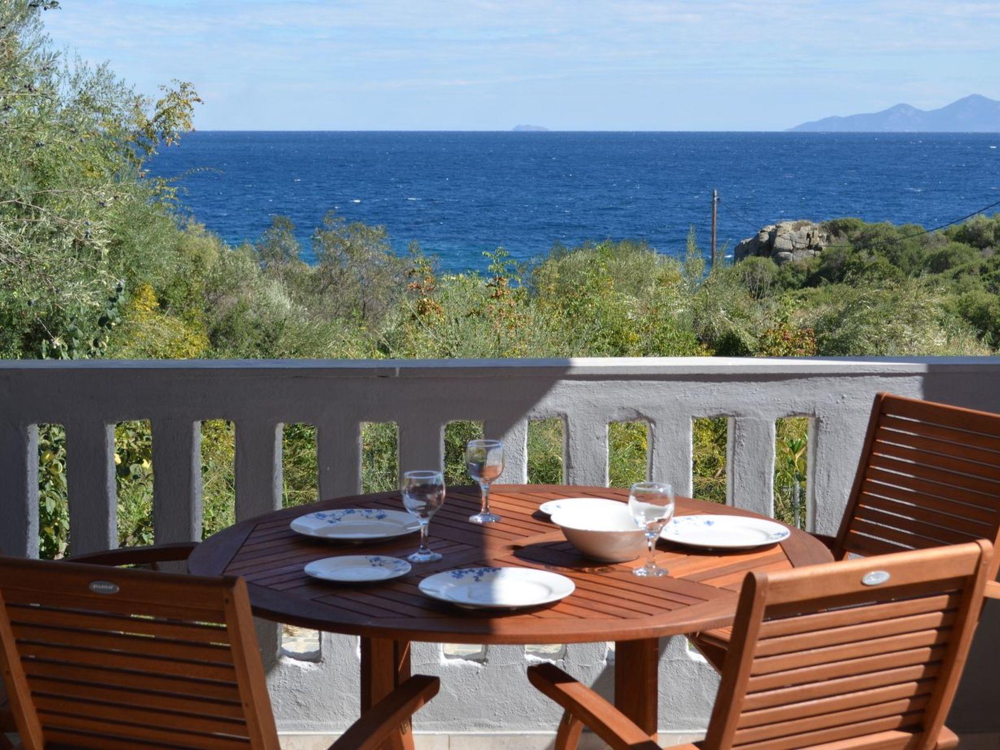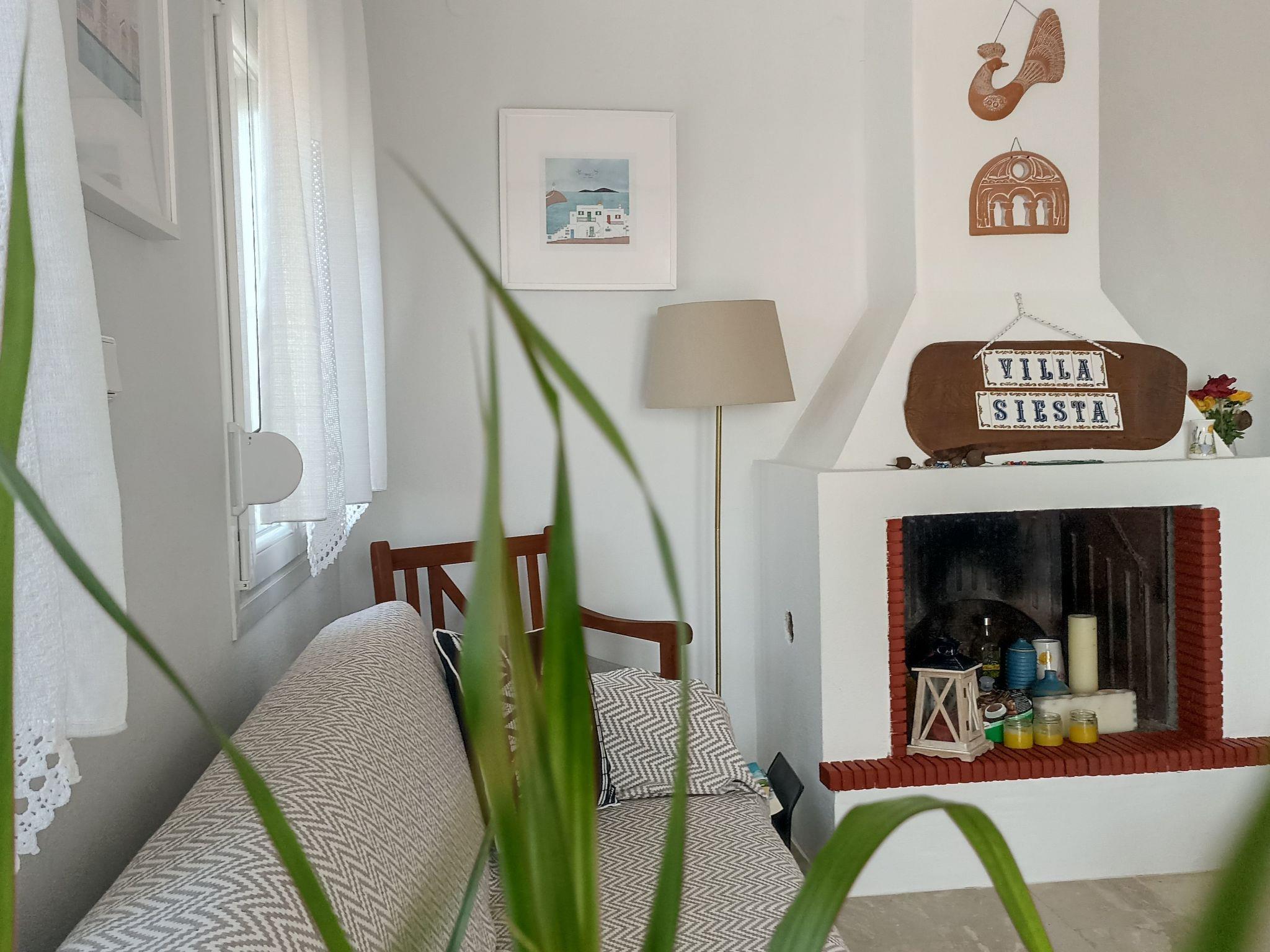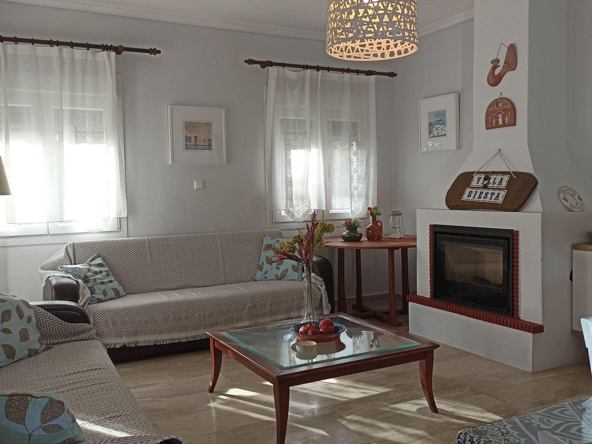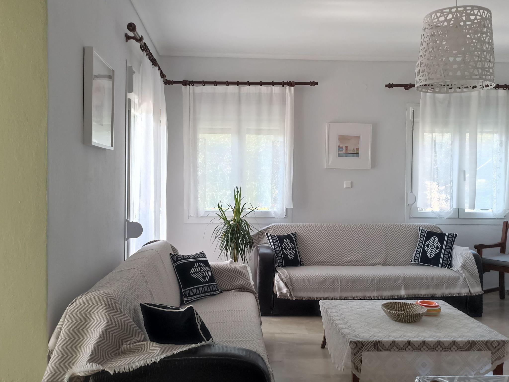 L'intérieur de la villa comprend deux chambres confortables, un salon spacieux, une cuisine entièrement équipée et une salle de bains. Chaque pièce a été meublée avec goût, mêlant pièces originales et décoration élégante pour créer une atmosphère chaleureuse, reflet du style grec local. Le balcon, offrant une vue directe sur la mer, complète cet intérieur harmonieux et accueillant.