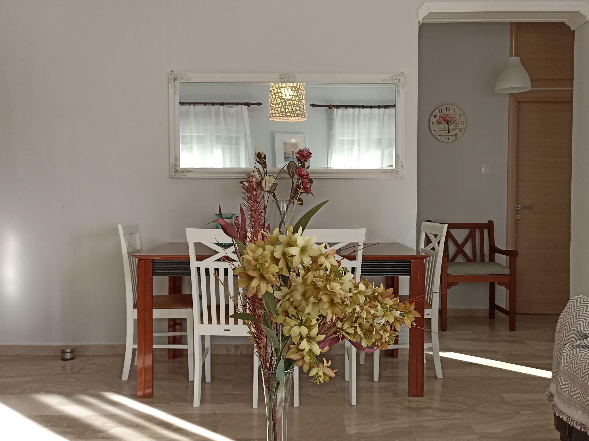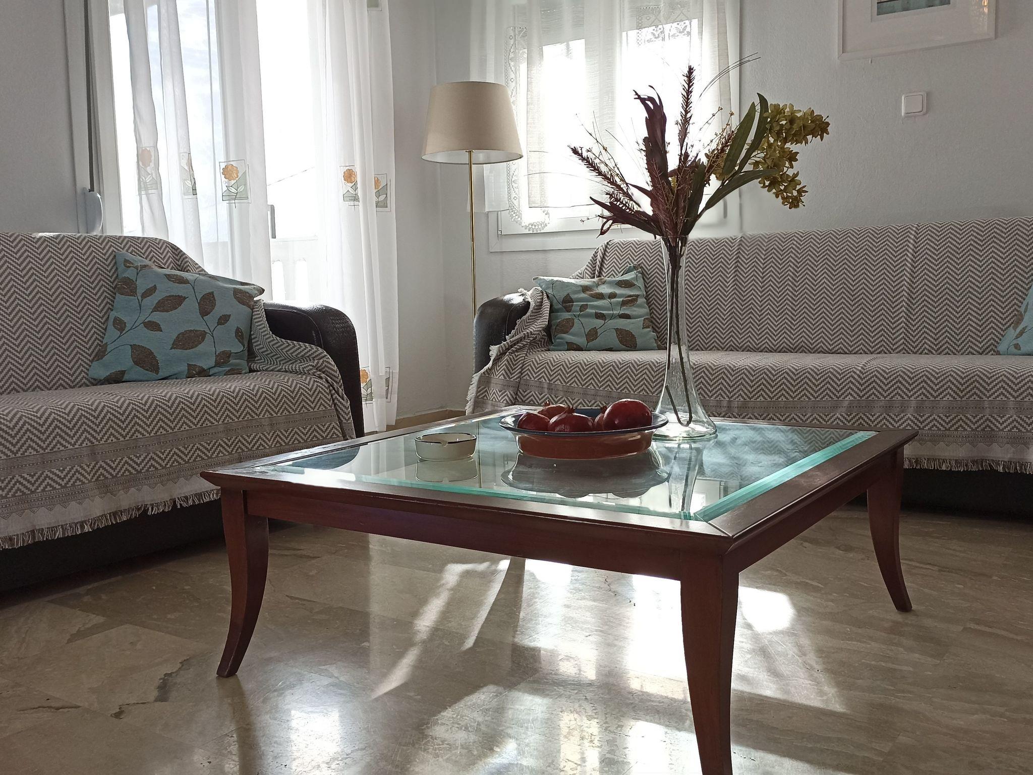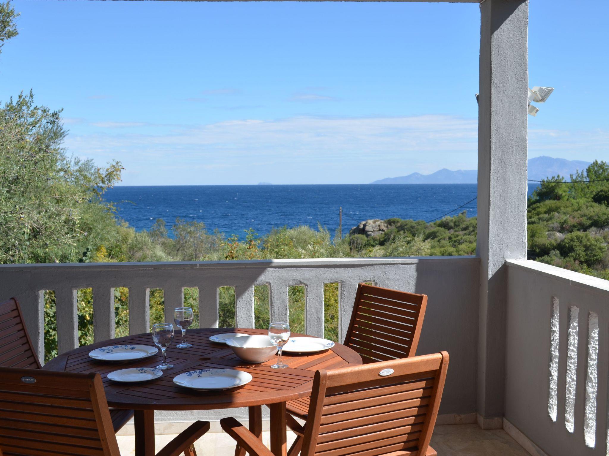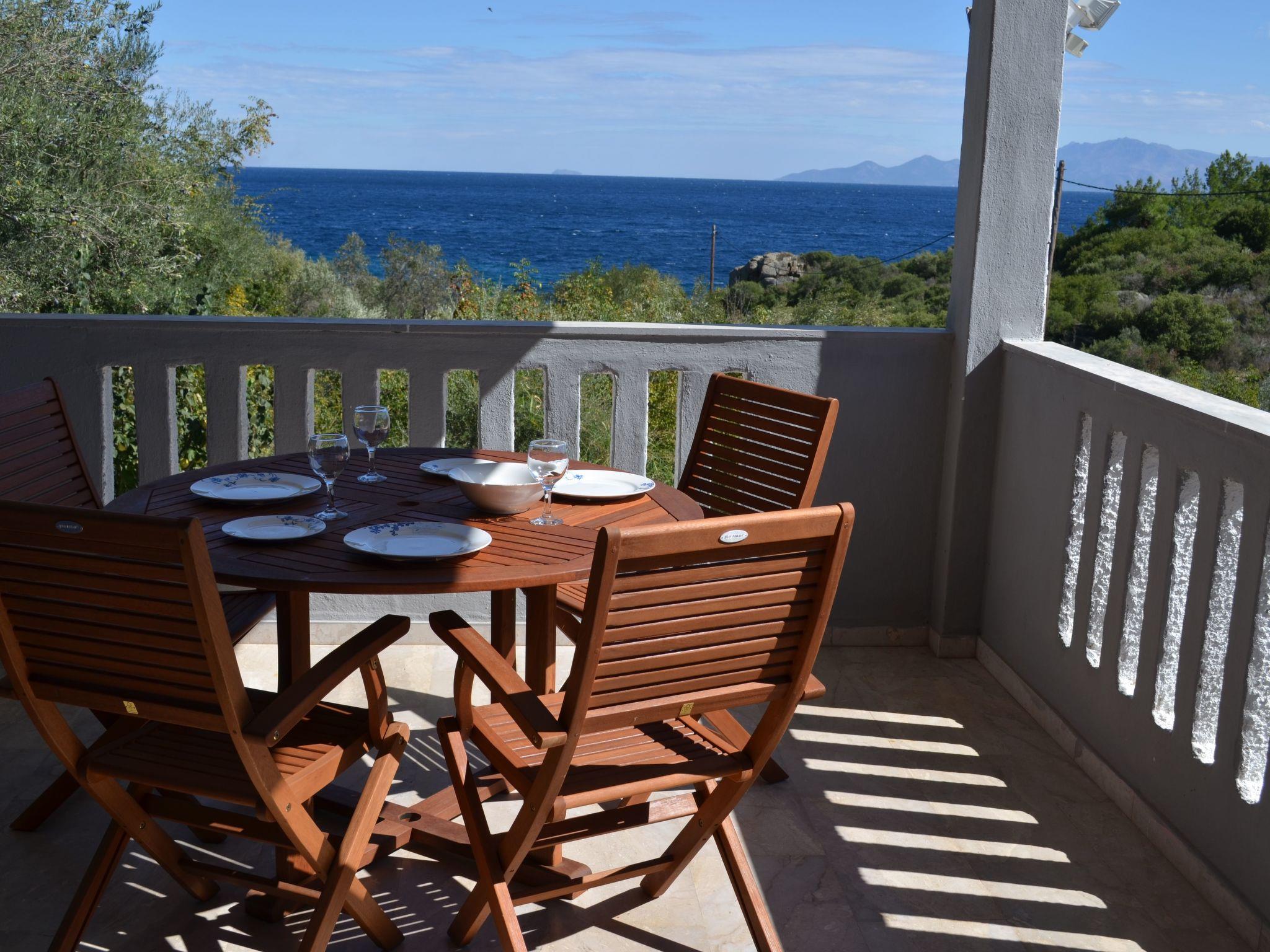 L'intérieur de la villa comprend deux chambres confortables, un salon spacieux, une cuisine entièrement équipée et une salle de bains. Chaque pièce a été meublée avec goût, mêlant pièces originales et décoration élégante pour créer une atmosphère chaleureuse, reflet du style grec local. Le balcon, offrant une vue directe sur la mer, complète cet intérieur harmonieux et accueillant.