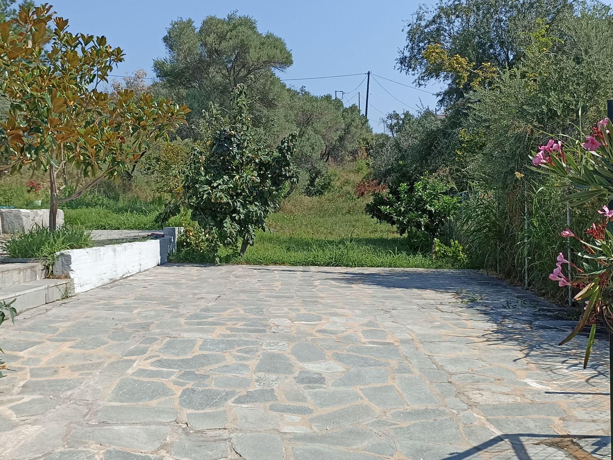À l'outside, Villa Siesta has'un grand jardin, véritable oasis de tranquillité où la nature luxuriante vous invite à la détente parmi les oliviers, avec la mer Égée en toile de fond. Le jardin est un lieu idéal pour se retrouver en famille ou entre amis et profiter du calme environnant, loin de l'tourist hustle and bustle, just 100 metres from the beach.