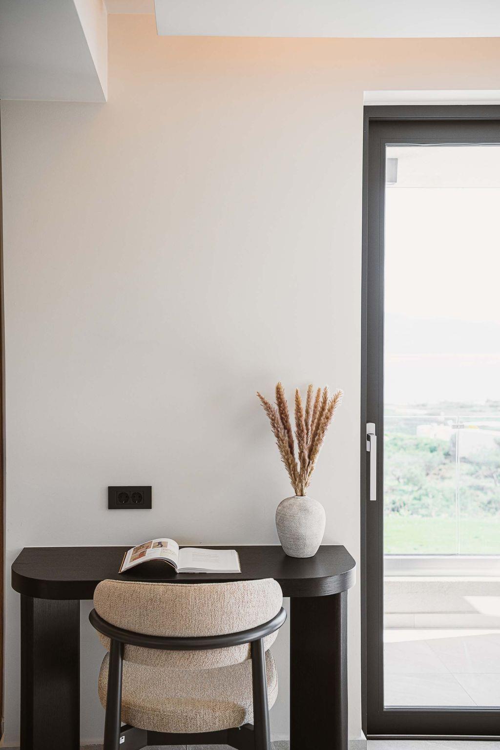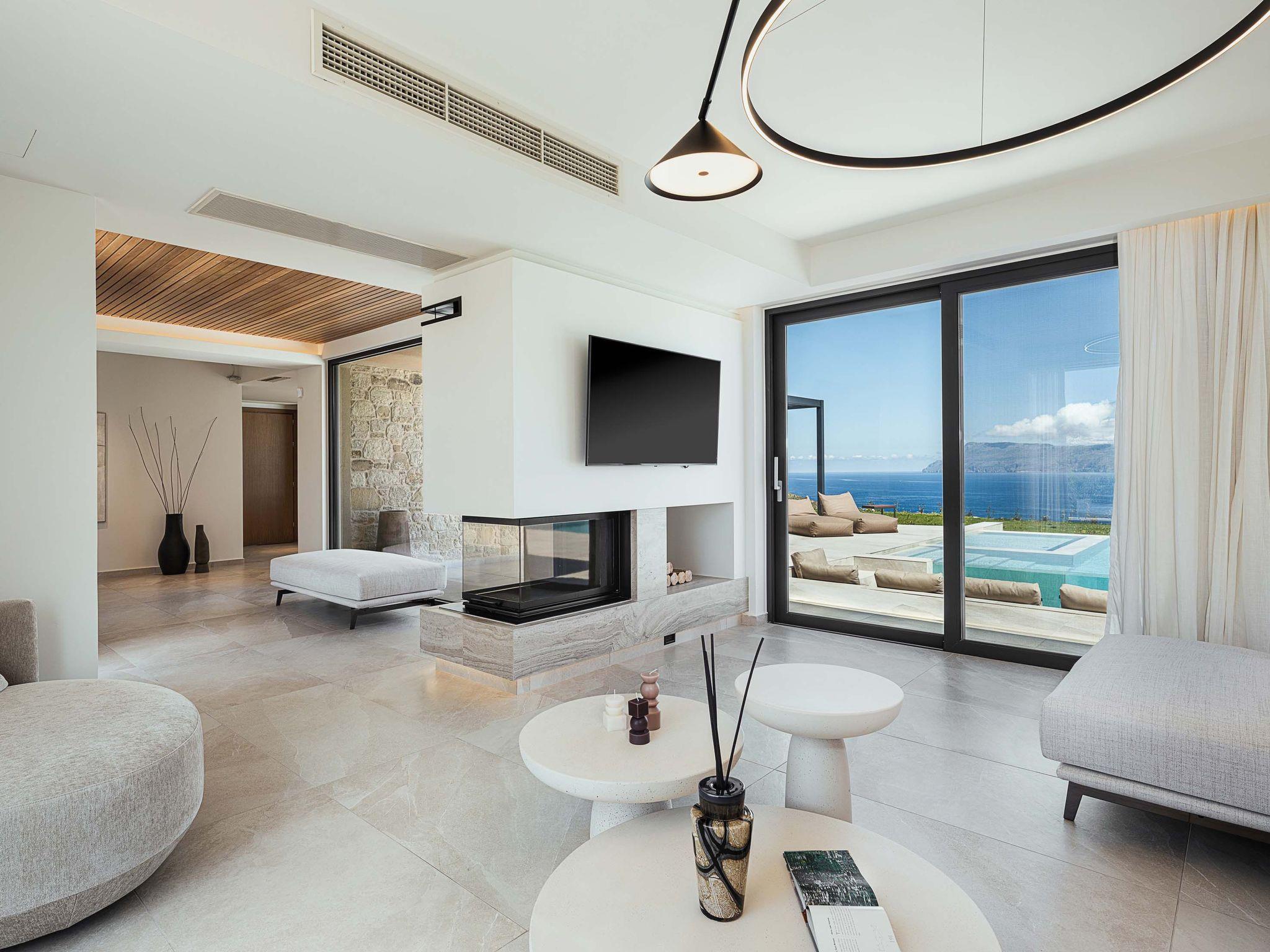 Luxury and modern design complete the scenery of contemporary architecture and high-quality products. Entering the villa on the ground floor you will find a spacious open area with a fully equipped contemporary kitchen that has branded appliances and facilities, making holiday cooking a most pleasurable experience. The area is completed with a dining room and a living room with a 55’’ smart Satellite TV and a fireplace. The large windows create the illusion of transparency and provide a seamless transition between the indoor and outdoor areas.