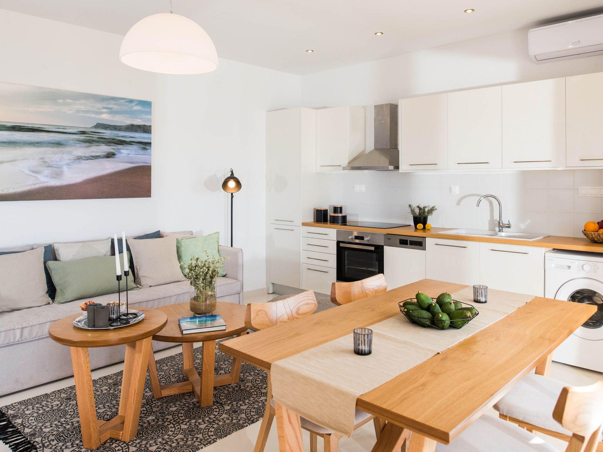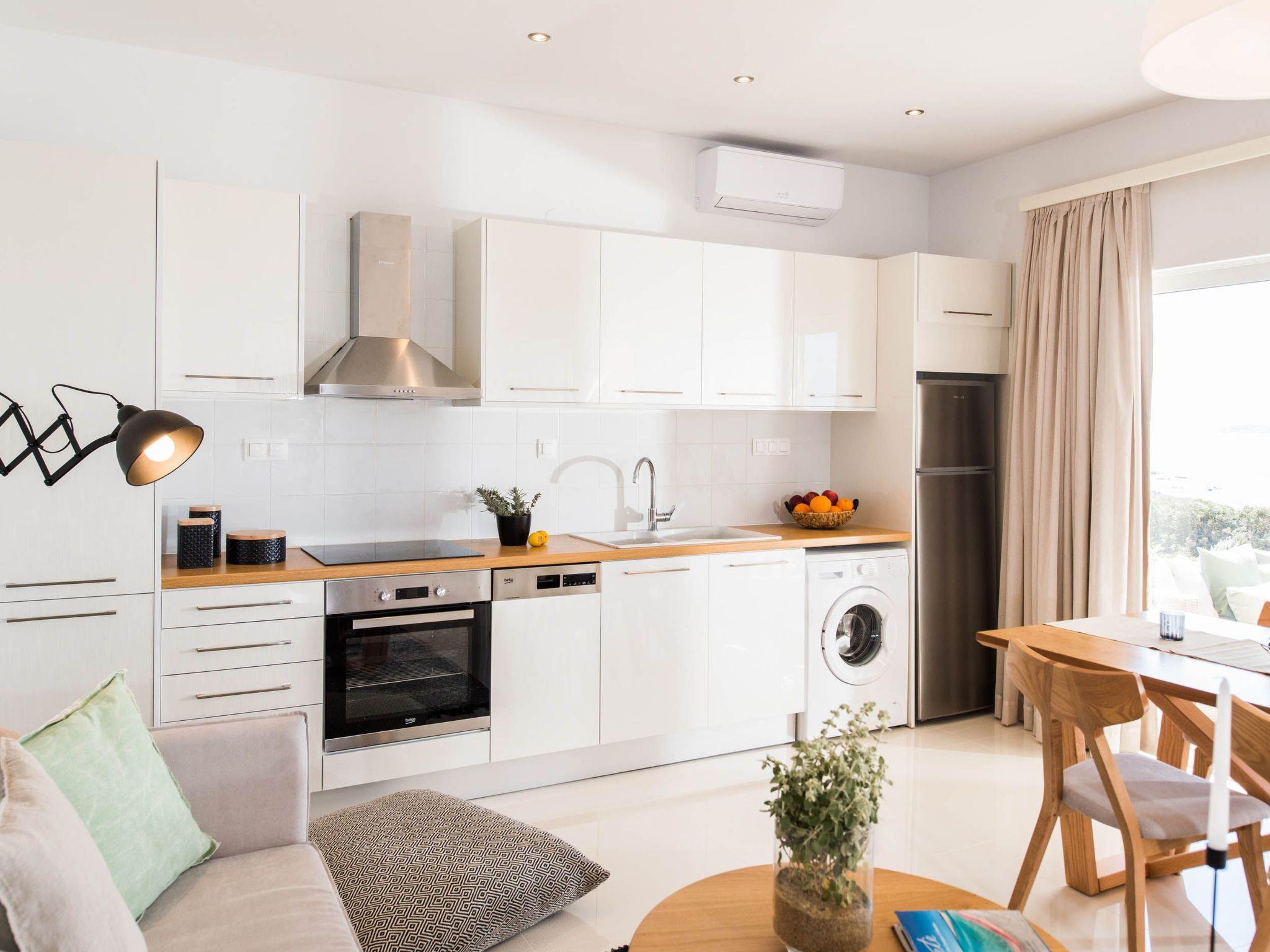 Open plan fully equipped kitchen with a dining area for 4 guests and a washing machine