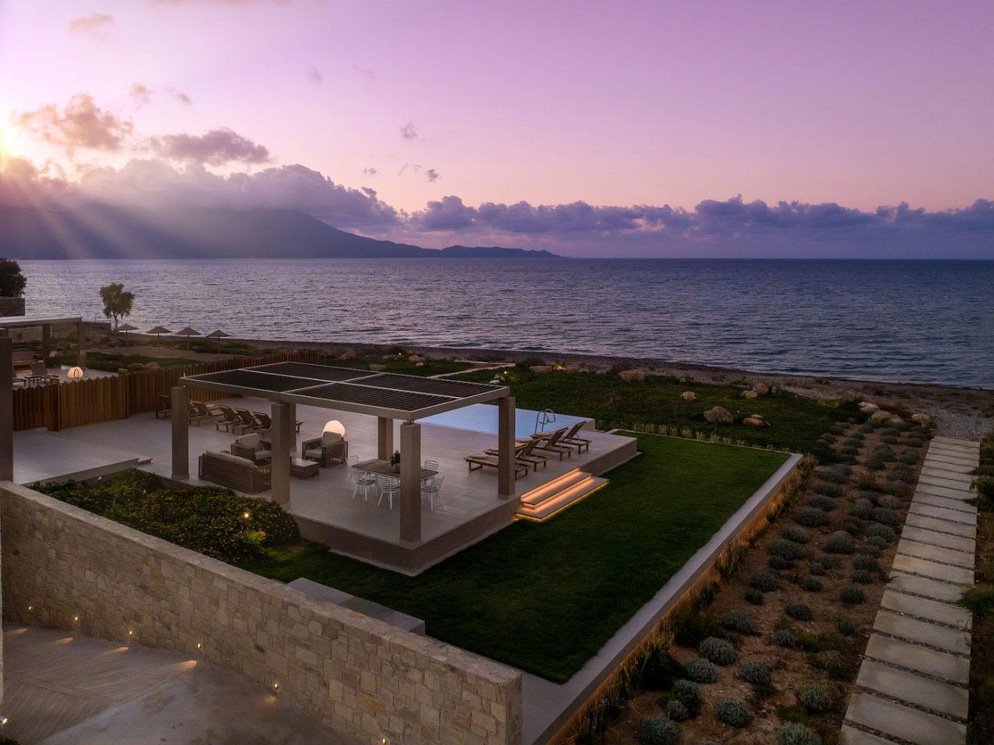The exterior of Votsalo is just as impressive as its interior. The property features a stunning infinity pool that blends with the horizon of the Aegean Sea, an al fresco dining area for unforgettable meals under the stars, and beautifully landscaped gardens that lead to a 150-meter beachfront. Here, guests can experience the private luxury of stepping directly from the villa across a pebble walkway into the inviting waters, where day meets night with the magical shoreline aura created by seductively lit rocks.