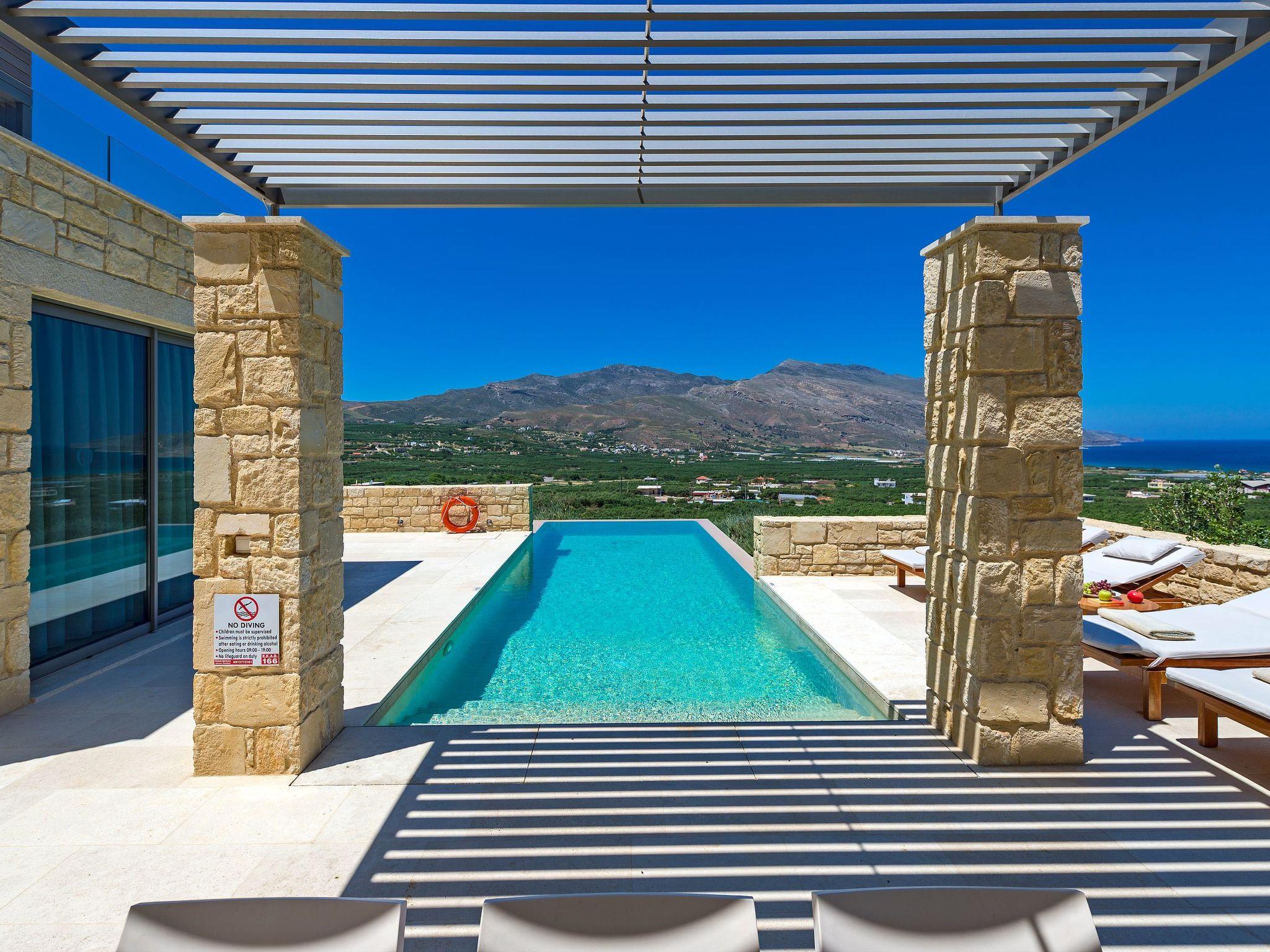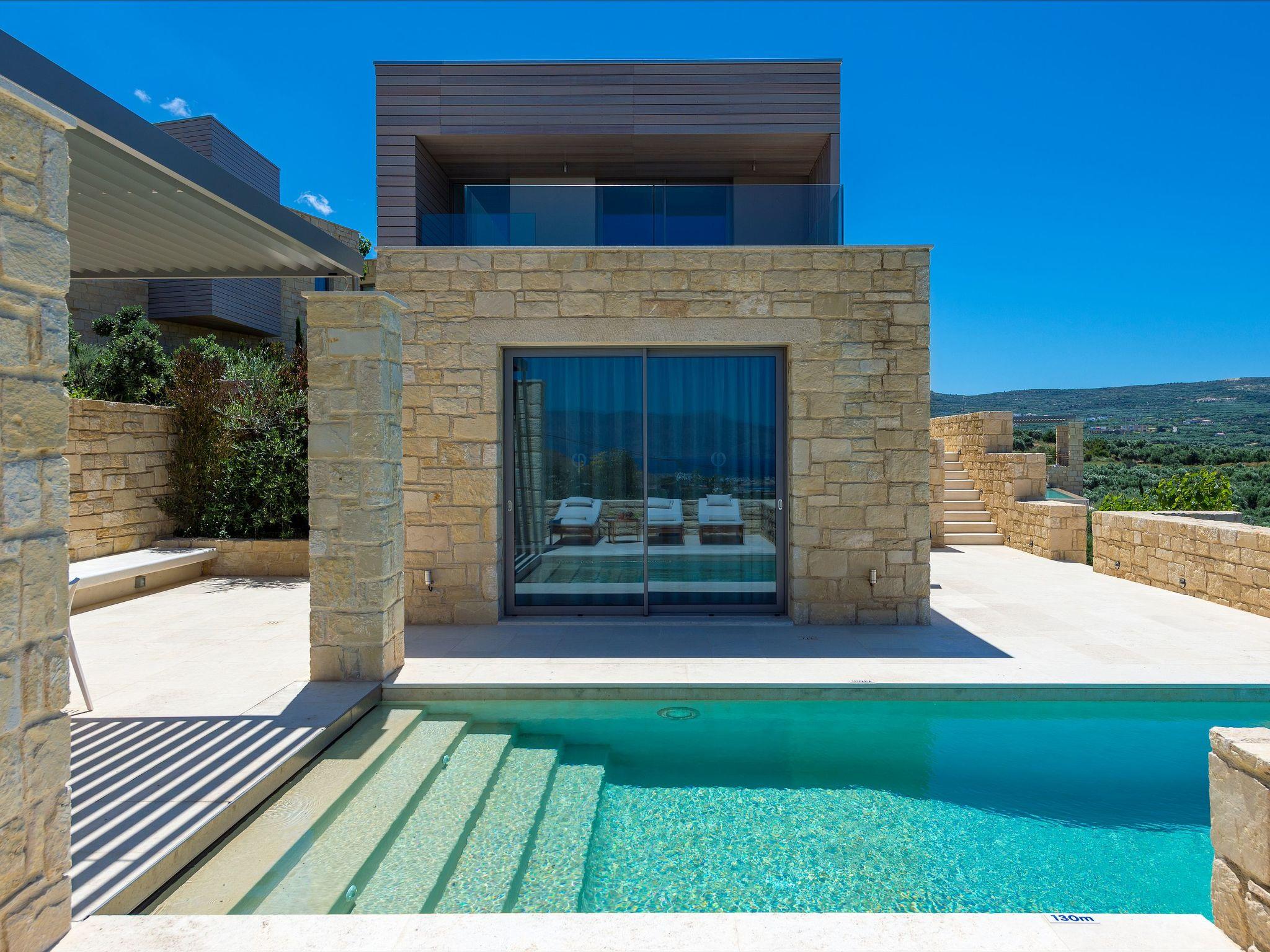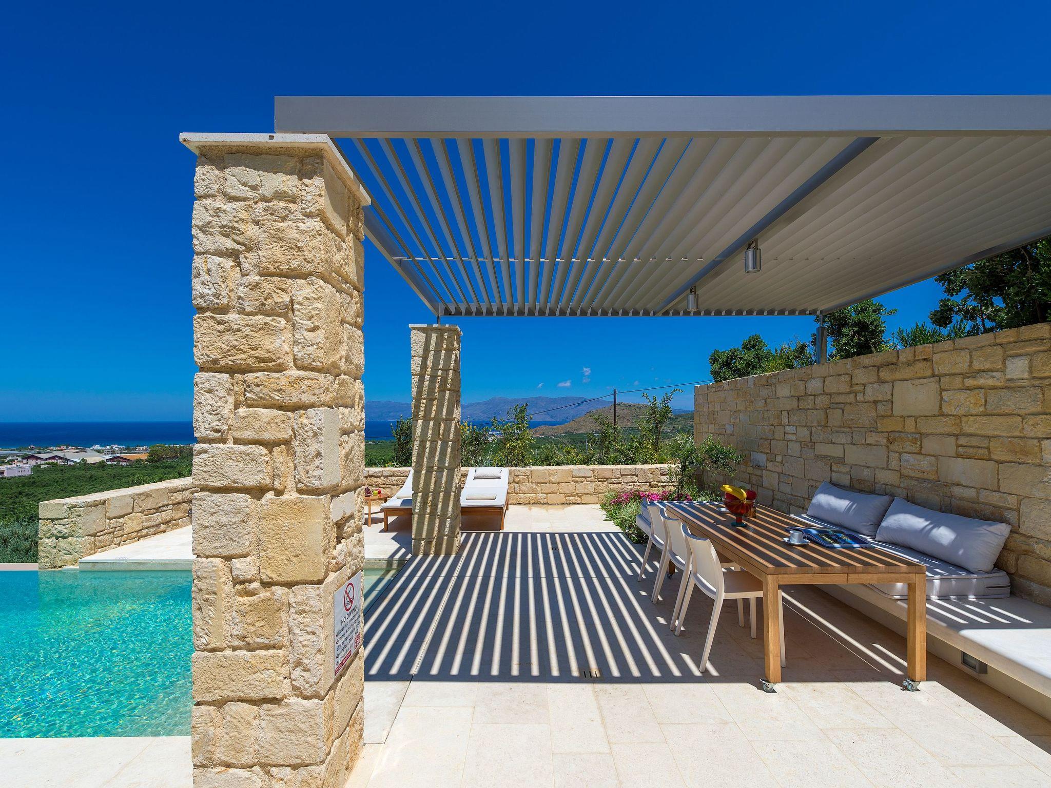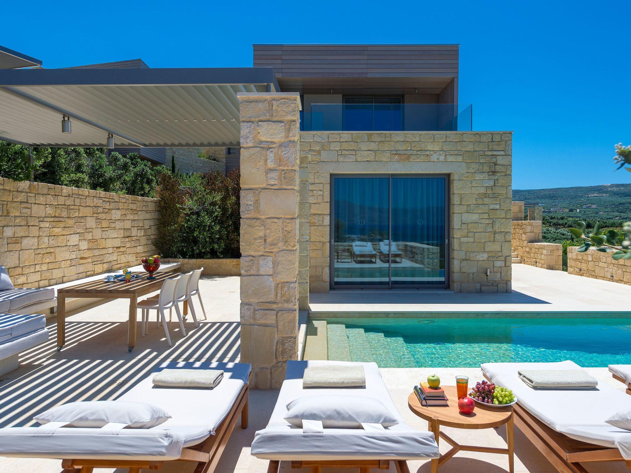 The exterior of villa Oneiro is nothing short of breathtaking. The centerpiece is a private infinity pool where guests can immerse themselves in the tranquil waters under the sun with views stretching across to the Gramvousa Peninsular and Kissamos Bay. A stylish outdoor dining area under a specially-designed pergola allows for al fresco feasts amid a garden lush with endemic Mediterranean flora. Such a setting promises serene mornings and enchanting evenings under the Crete sky, designed to amplify the island's natural charm.