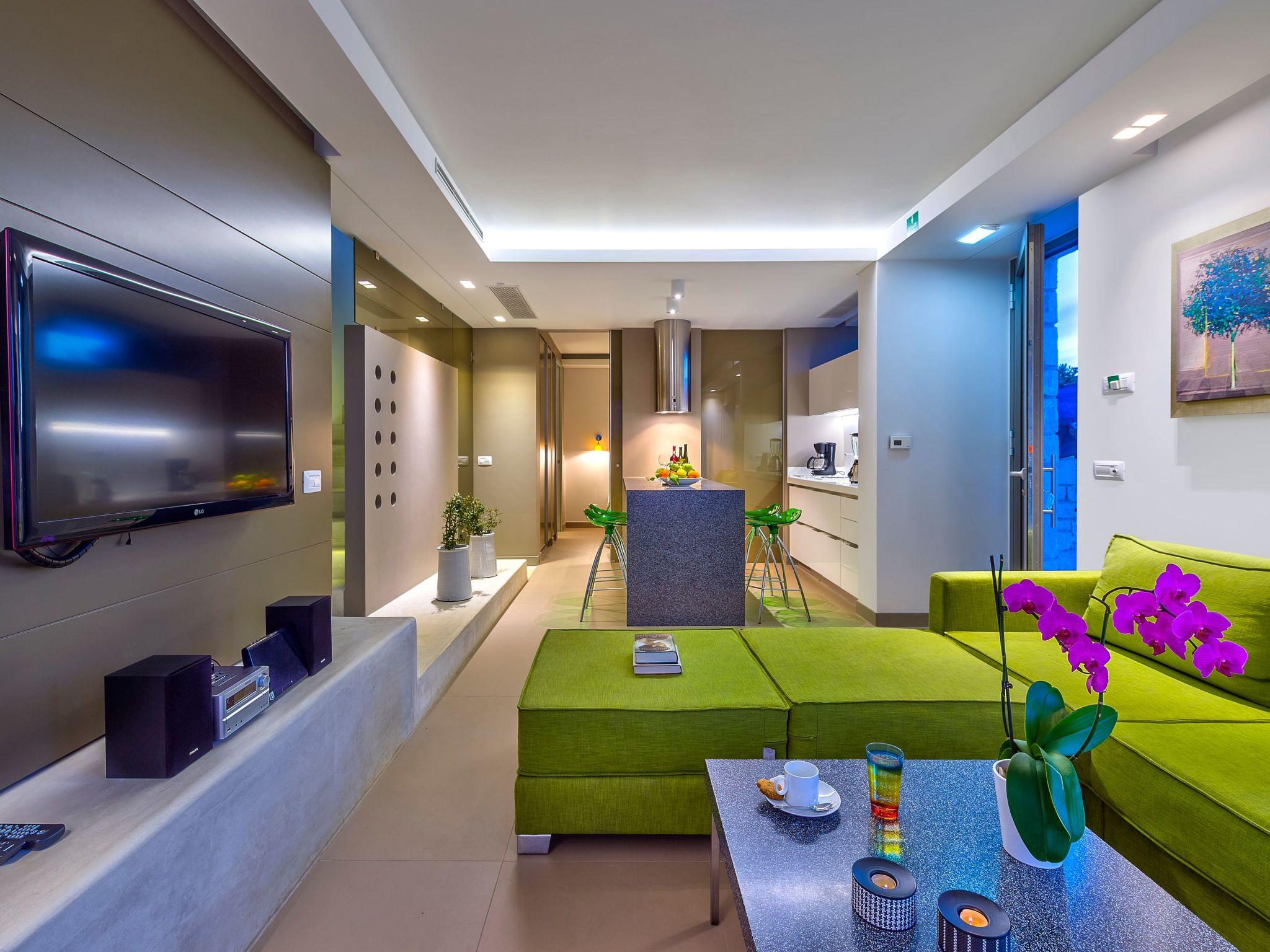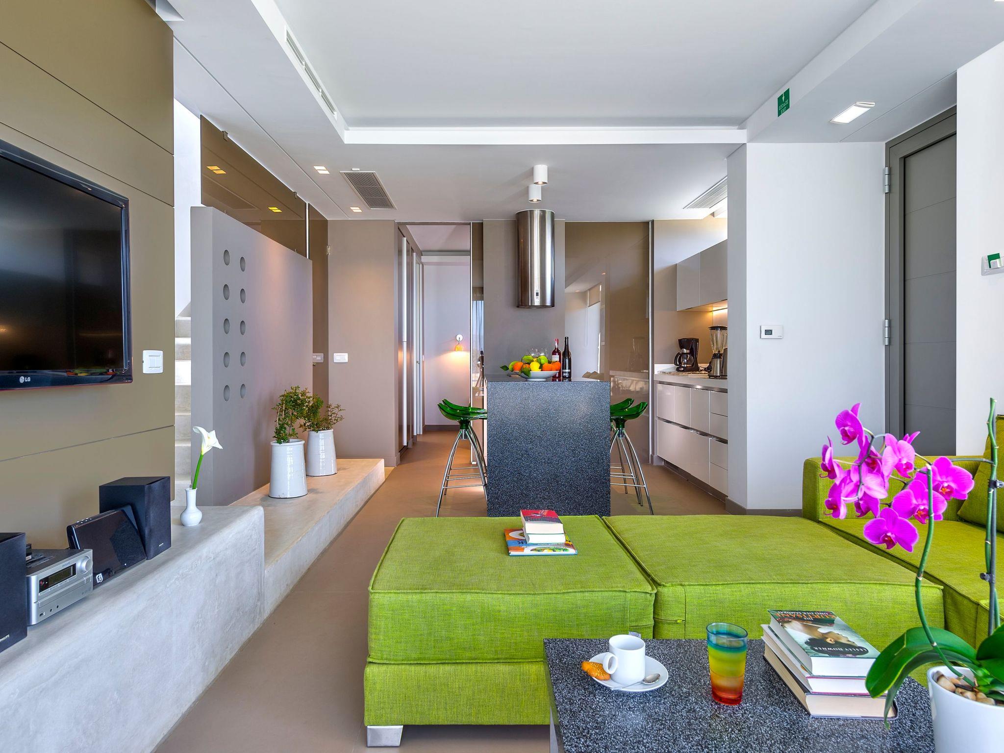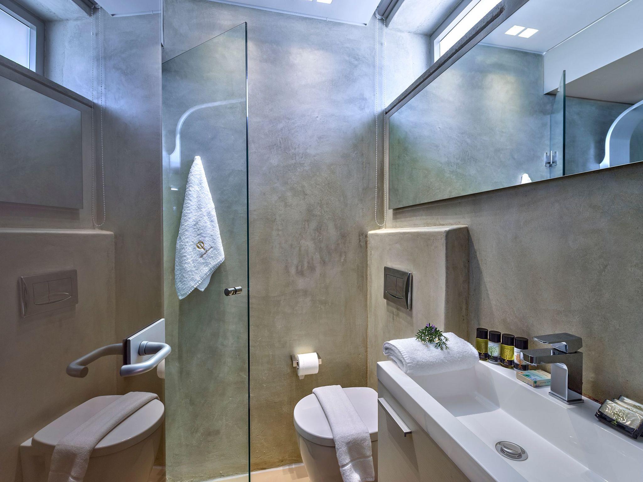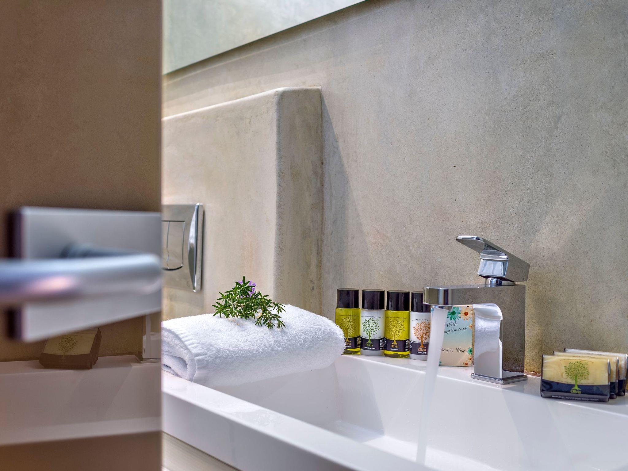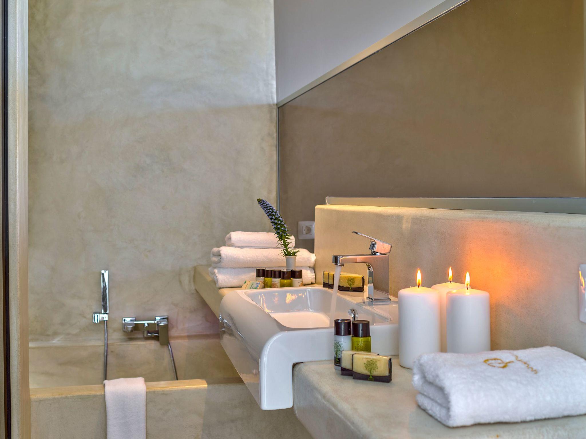 Inside, villa Oneiro dazzles with its meticulous attention to comfort and style. The living spaces spread over two floors bathe in natural sunlight, pouring in through expansive windows that not only illuminate but also offer panoramic views of the lush surroundings. The exclusive Cimentogonia surfaces in the living area and bathrooms heighten the sense of luxury, while the open-plan kitchen comes fully equipped with Corian work surfaces and a comprehensive range of appliances for your culinary exploits. Not to mention, the ground floor hosts a double/twin bedroom with an en-suite spa shower, and the upper floor introduces a master bedroom with a large balcony overlooking the Aegean, and an open-plan bathroom to enjoy the view from the bath.