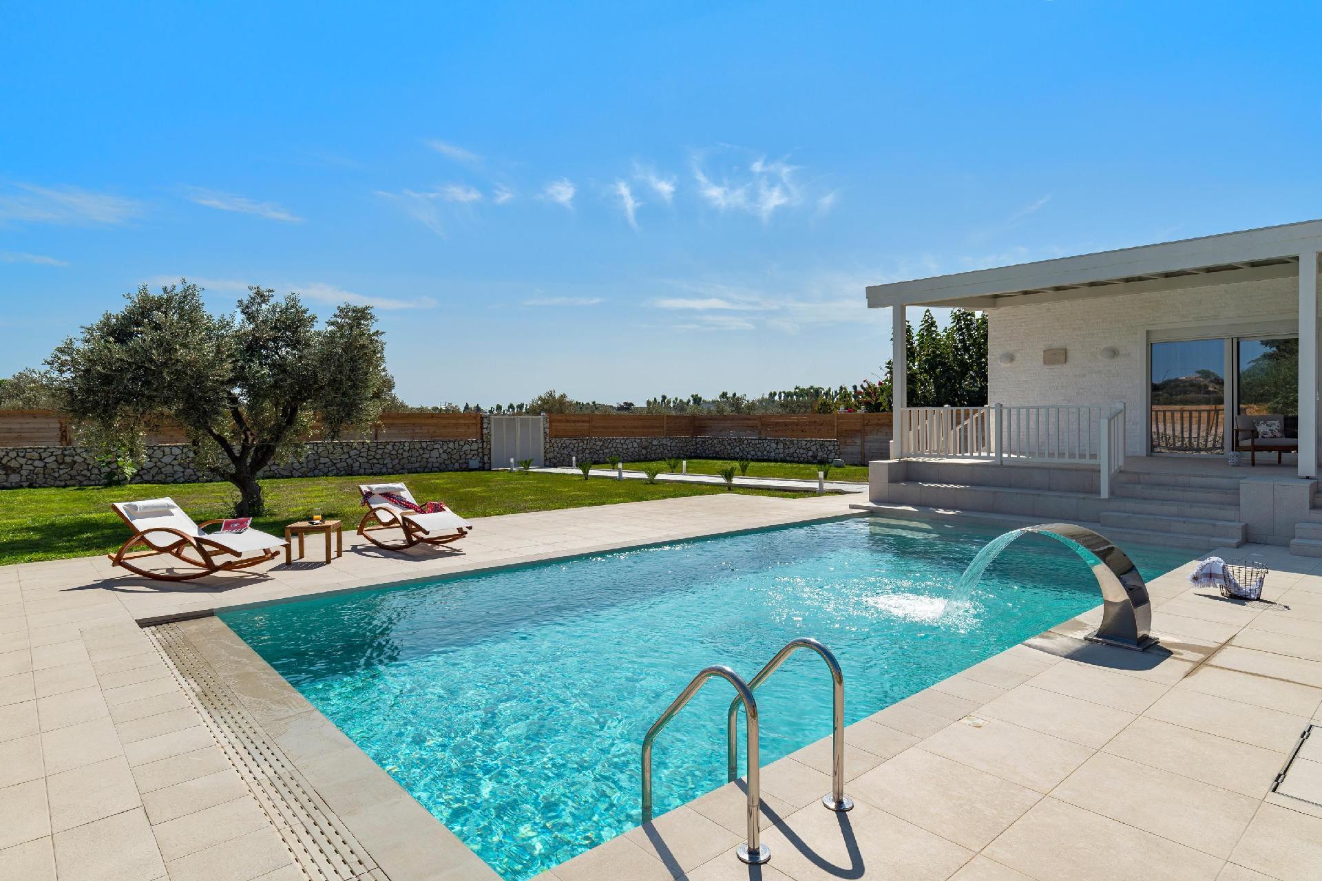 The Villa is located in Kolympia Village. In the village you will find shops, cafes, restaurants and bars. The distance to Rhodes town is found within a driving distance of 35 minutes. You should not miss visiting Lindos Village and its incredible Acropolis at a distance of 30 minutes. Also, Tsampika beach, which is considered to be the most beautiful sandy beach in Rhodes, is only 5 minutes away by car. One of the most charming locations in Rhodes, the Seven Springs forest is only 3km away. The area of Seven Springs and the nearby forests are suitable for hiking. The airport of Rhodes is found at a distance of only 30 minutes.