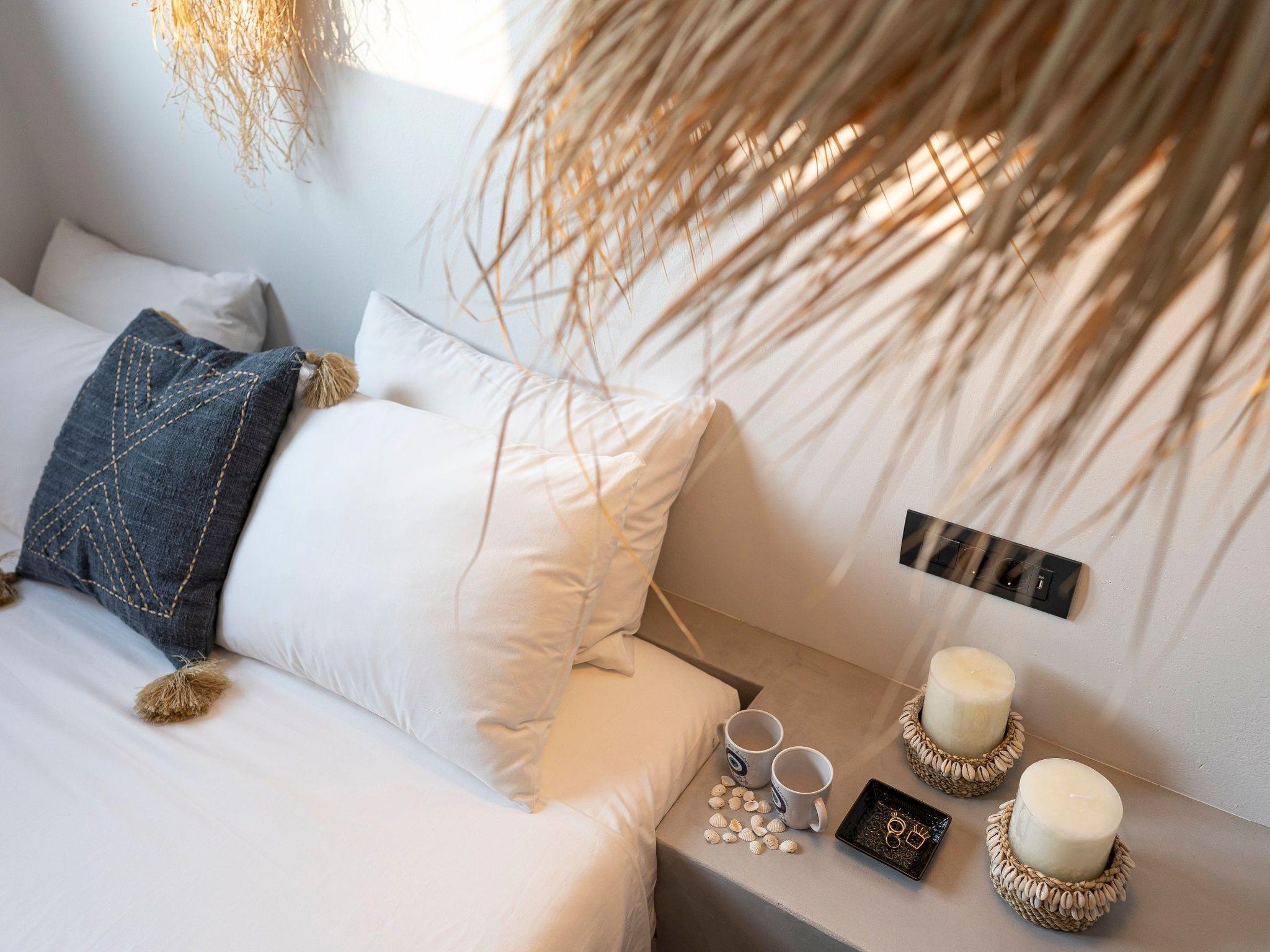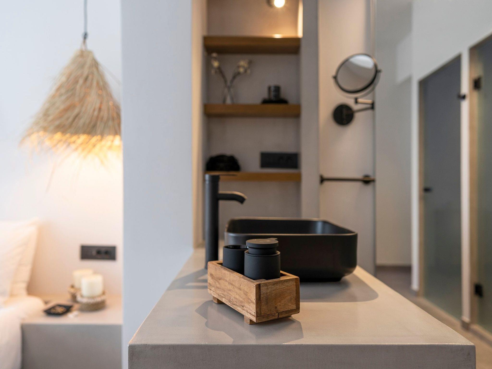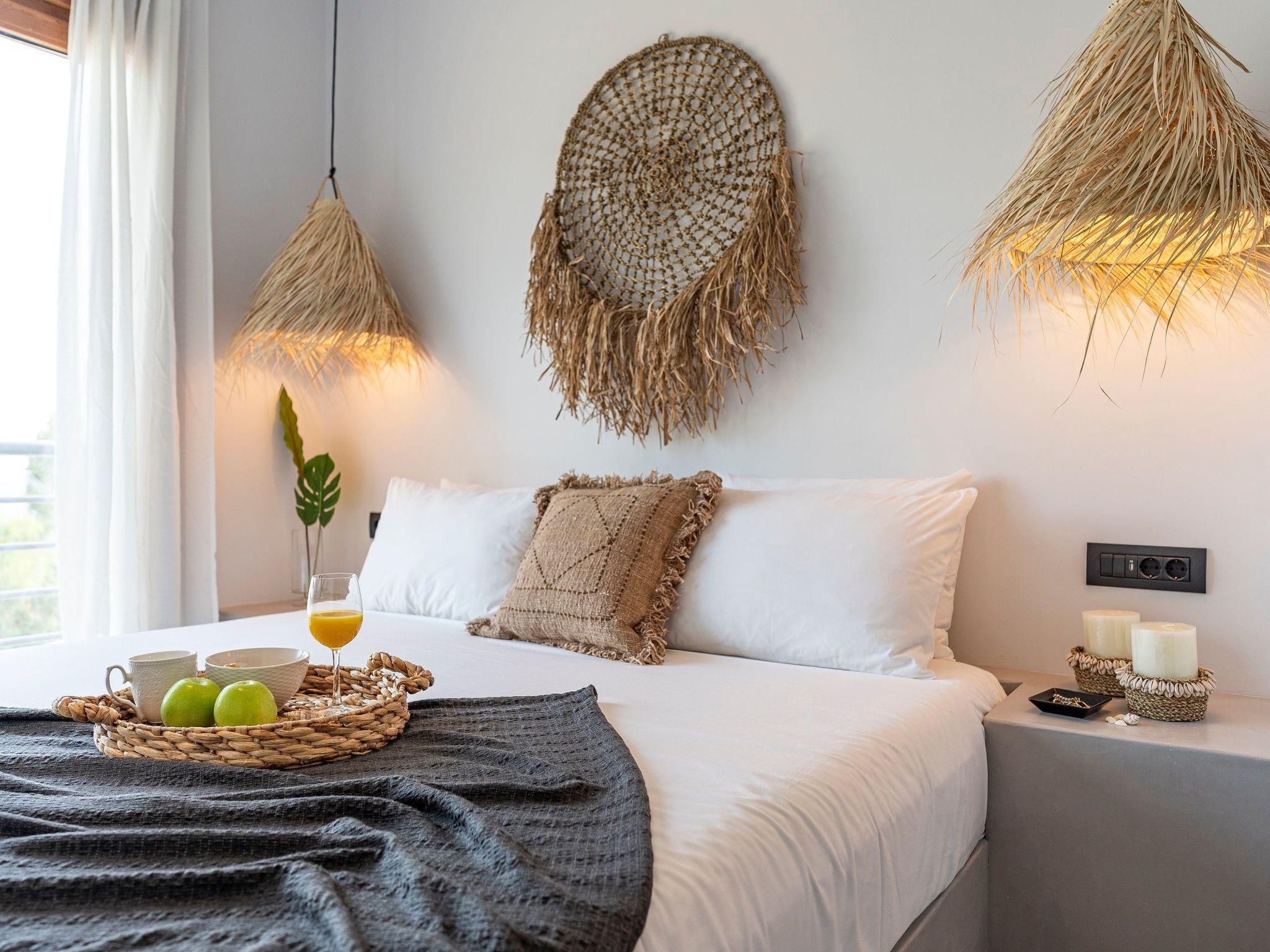 A marble staircase takes you up to the first floor where the three exquisite suites are located. Each suit has a king size bed with luxury mattress, and super modern ensuite bathroom. Two of the suites have stunning sea views and the third has mountain views. The suites are all beautifully furnished and provide a wonderfully relaxing experience for guests staying here.