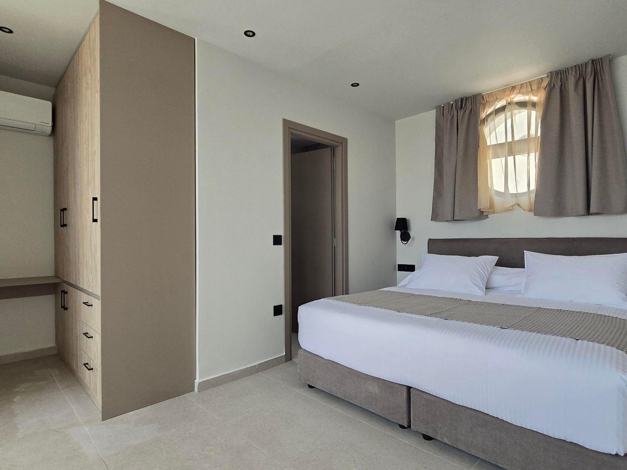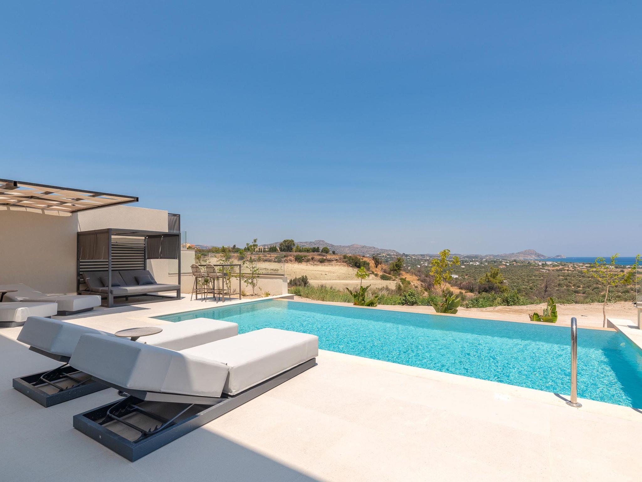 Welcome to the magic luxury living of Trapezia Villas. Trapezia Luxury Living boasts a stunning design that combines modern aesthetics with timeless elegance. Every detail is meticulously crafted to create a sophisticated and luxurious atmosphere. They offers expansive living spaces, including large living rooms, dining areas, and three fully equipped bedrooms with en-suite. The high ceilings and open floor plan enhance the sense of grandeur and provide ample room for relaxation and entertainment. All Trapezia villas are equipped with top-of-the-line amenities to ensure an unparalleled experience of luxury. From a fully-equipped outdoor gourmet kitchen to a private swimming pool and spa, every aspect of comfort and indulgence is taken care of. Trapezia Luxury Living is the epitome of opulence and sophistication, offering a truly exceptional living experience for those seeking the finest in accommodation.Type A villas are two floor luxury detached villas that hosts up to 6 guests.There are 3 fully air-conditioned bedrooms with unique decorations. All of the bedrooms offer ensuite bathrooms with a shower. There’s a fully equipped kitchen in warm colors, suitable for any meal preparation accompanied by the seating area and the living room. There’s a smart TV and free WIFI access throughout the property. Outdoors, there’s a private swimming pool and jacuzzi with sunbeds and a seating area where you can relax under the rays of the Aegean sun. The amazing outdoor kitchen with the dinning are promises memorable dinner’s under the Greek sky. You can spend your time by your private swimming pool or enjoy a fresh meal prepared in the BBQ installation. This amazing property and the beautiful location make the perfect match for a memorable stay and unforgettable holidays in Rhodes!