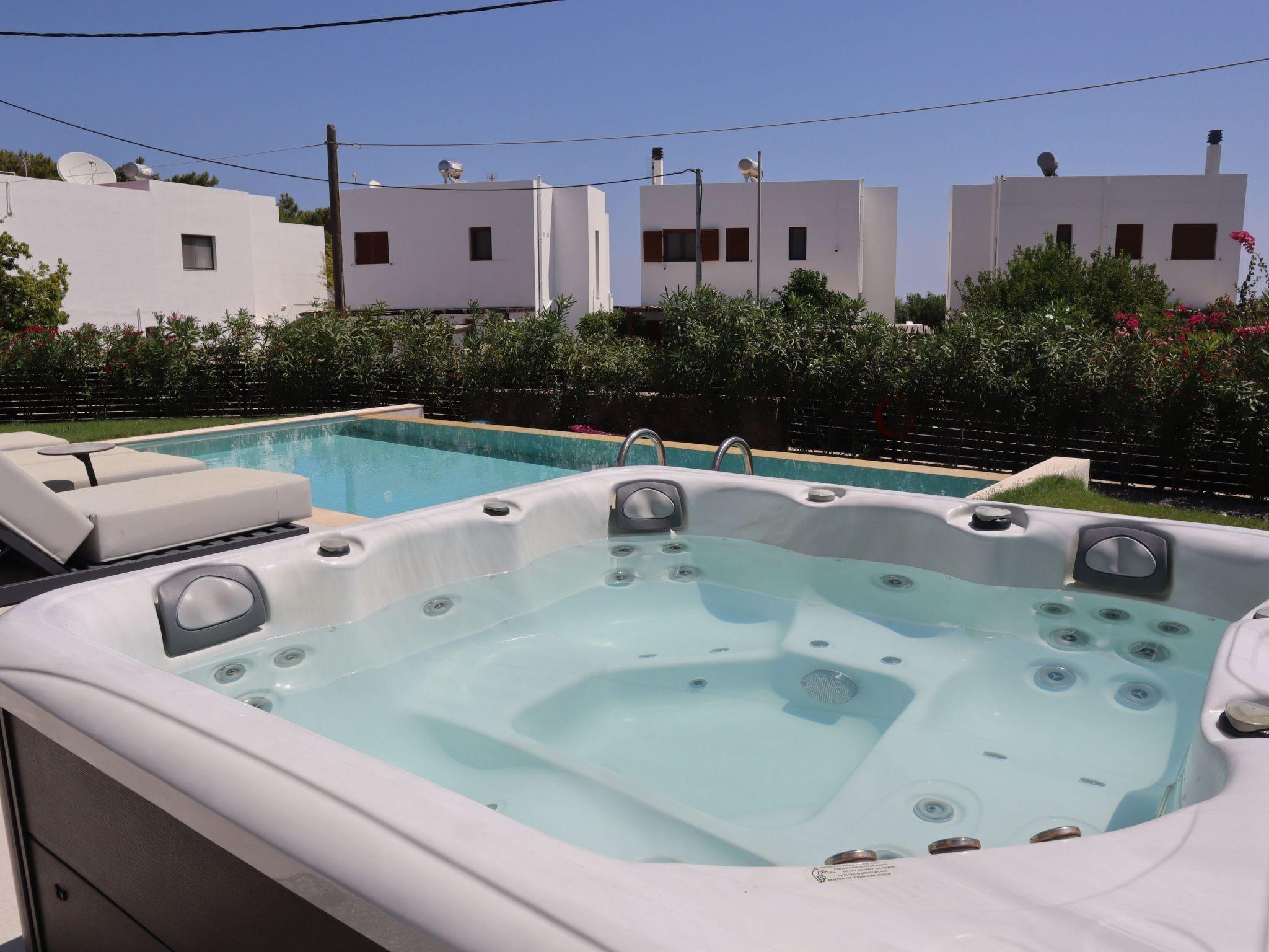 Welcome to the magic luxury living of Trapezia Villas. Trapezia Luxury Living boasts a stunning design that combines modern aesthetics with timeless elegance. Every detail is meticulously crafted to create a sophisticated and luxurious atmosphere. They offers expansive living spaces, including large living rooms, dining areas, and three fully equipped bedrooms with en-suite. The high ceilings and open floor plan enhance the sense of grandeur and provide ample room for relaxation and entertainment. All Trapezia villas are equipped with top-of-the-line amenities to ensure an unparalleled experience of luxury. From a fully-equipped outdoor gourmet kitchen to a private swimming pool and spa, every aspect of comfort and indulgence is taken care of. Trapezia Luxury Living is the epitome of opulence and sophistication, offering a truly exceptional living experience for those seeking the finest in accommodation.Type A villas are two floor luxury detached villas that hosts up to 6 guests.There are 3 fully air-conditioned bedrooms with unique decorations. All of the bedrooms offer ensuite bathrooms with a shower. There’s a fully equipped kitchen in warm colors, suitable for any meal preparation accompanied by the seating area and the living room. There’s a smart TV and free WIFI access throughout the property. Outdoors, there’s a private swimming pool and jacuzzi with sunbeds and a seating area where you can relax under the rays of the Aegean sun. The amazing outdoor kitchen with the dinning are promises memorable dinner’s under the Greek sky. You can spend your time by your private swimming pool or enjoy a fresh meal prepared in the BBQ installation. This amazing property and the beautiful location make the perfect match for a memorable stay and unforgettable holidays in Rhodes!