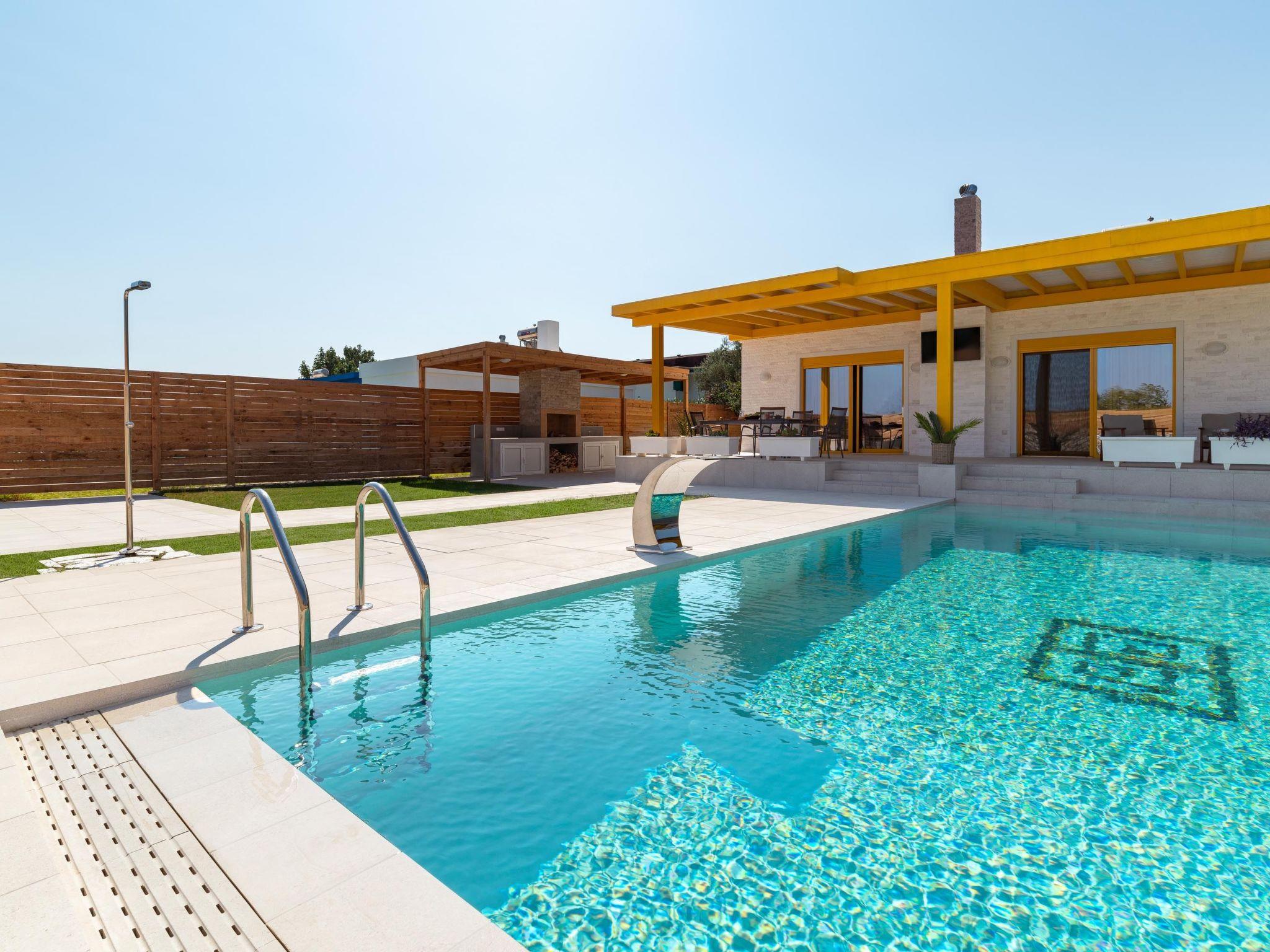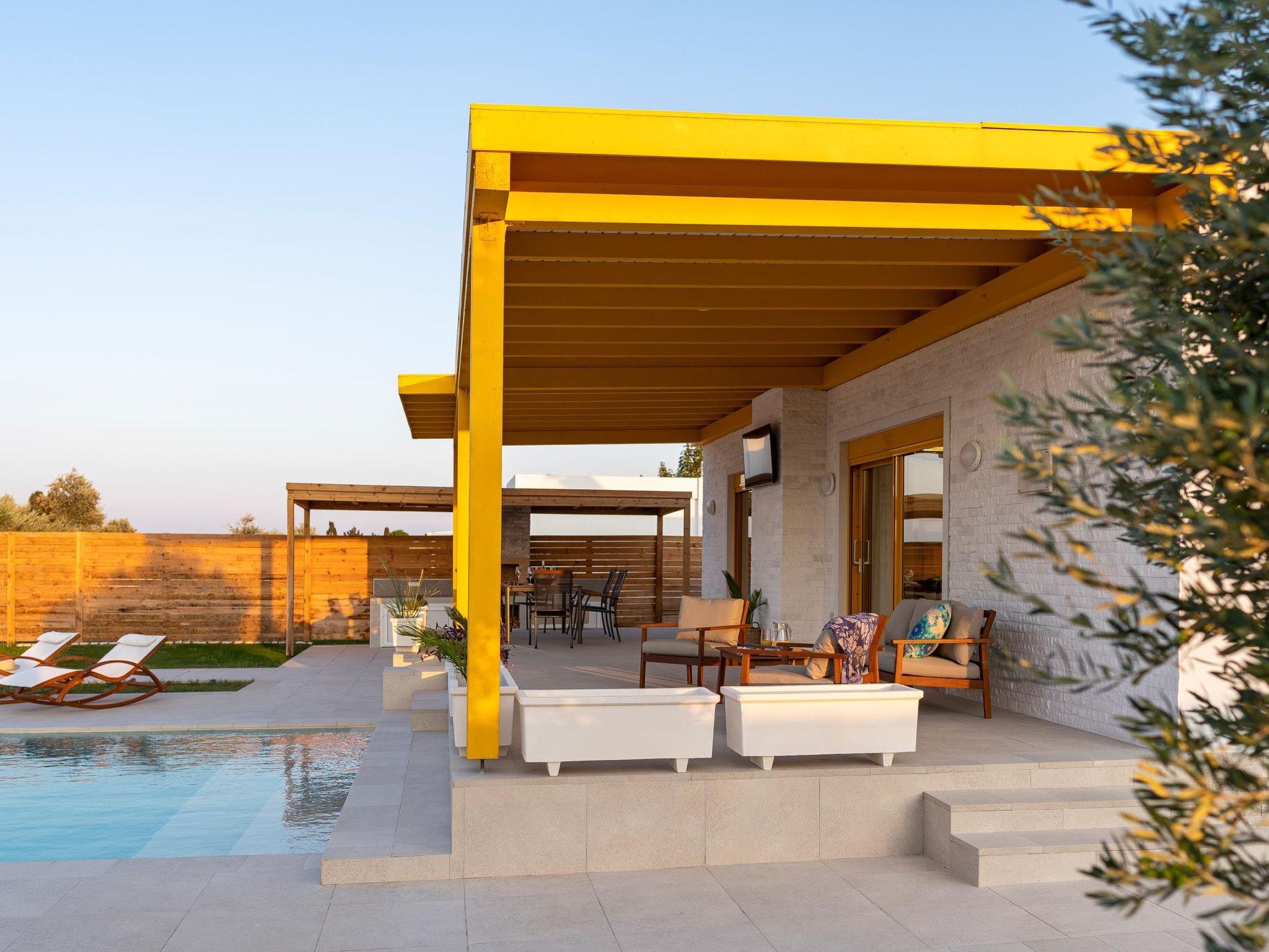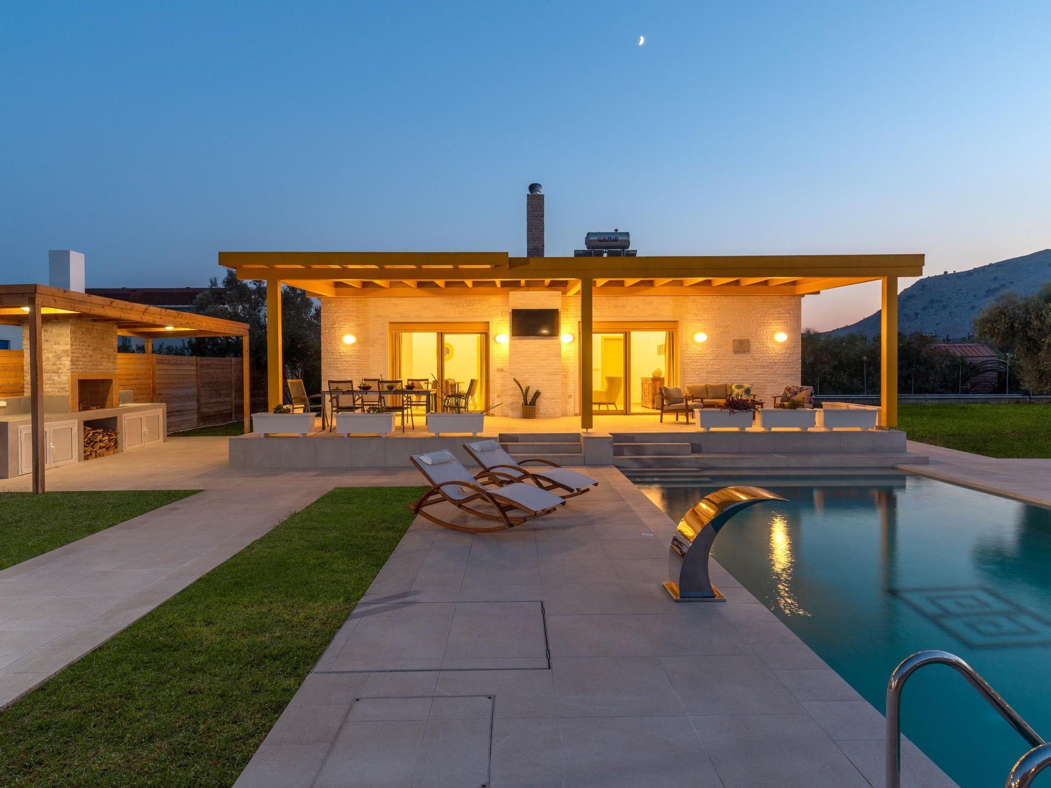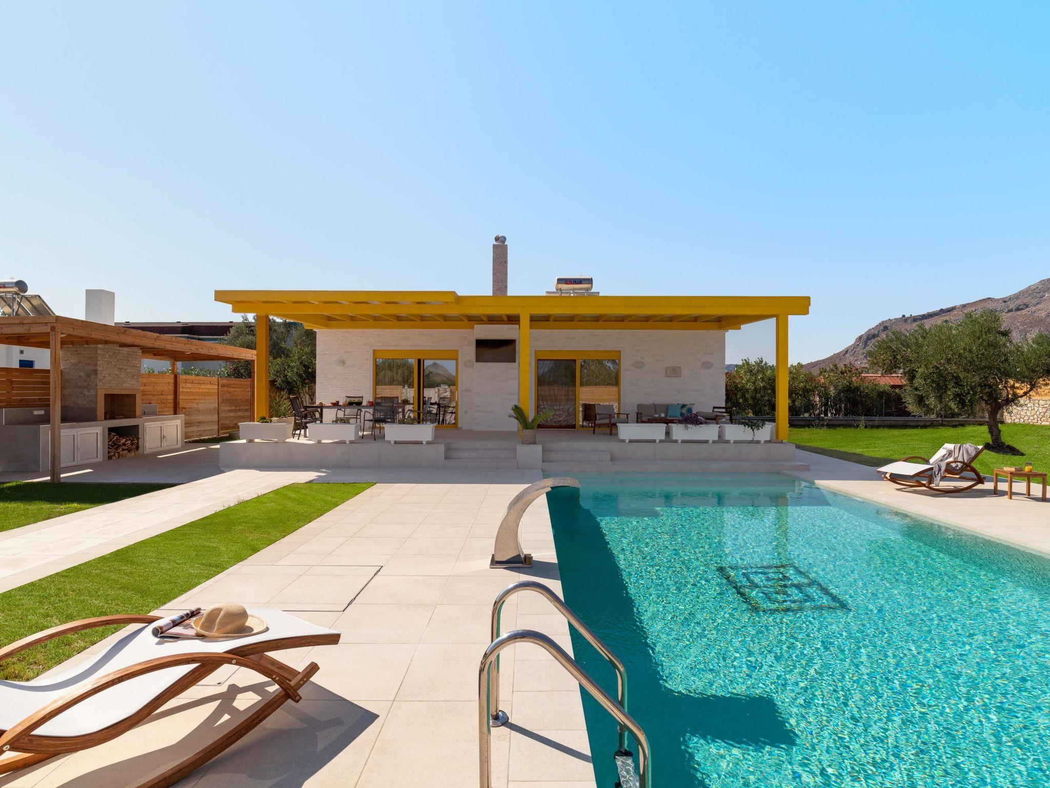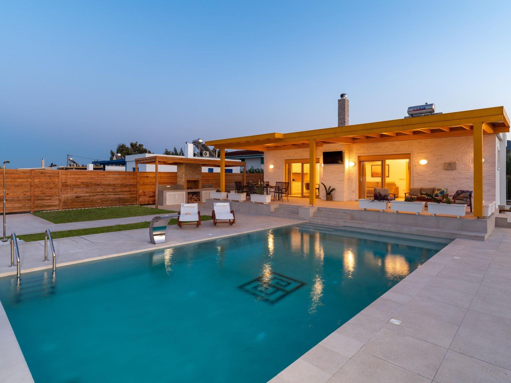 Villa Ilios has two fully air-conditioned bedrooms with ensuite bathrooms with showers and a comfy double sofa-bed in the living room. There is also one bathroom with a shower next to the living room. The kitchen is fully equipped, suitable for any meal preparation accompanied by the sitting area. The interior design is absolutely incredible with a tasteful decoration. Guests will find flat screen TVs and free Wi-Fi access throughout the property. Outdoors, there’s a magnificent private swimming pool and sitting areas to relax under the Aegean sun. The BBQ facility and utensils offer you the opportunity to enjoy outdoor al fresco dinners by the pool.