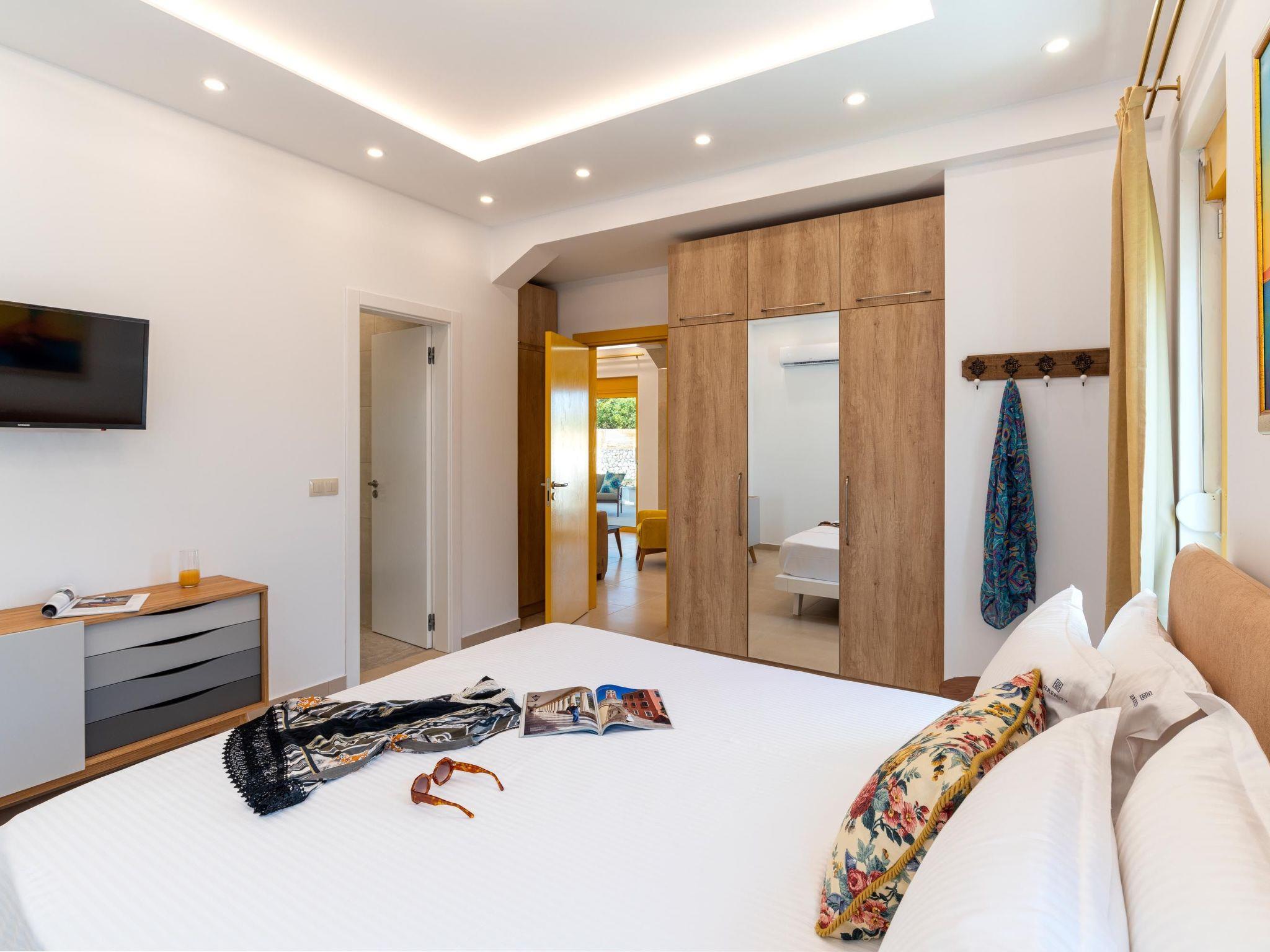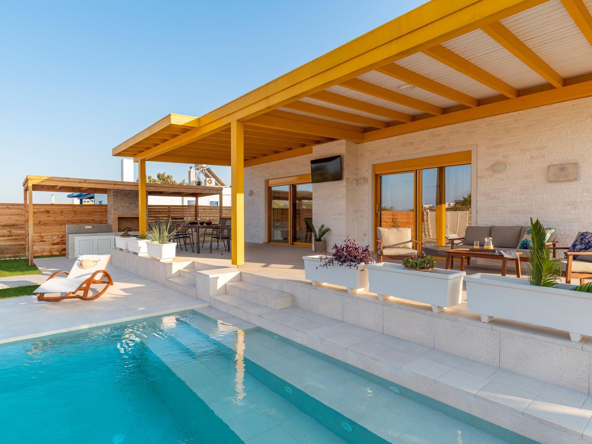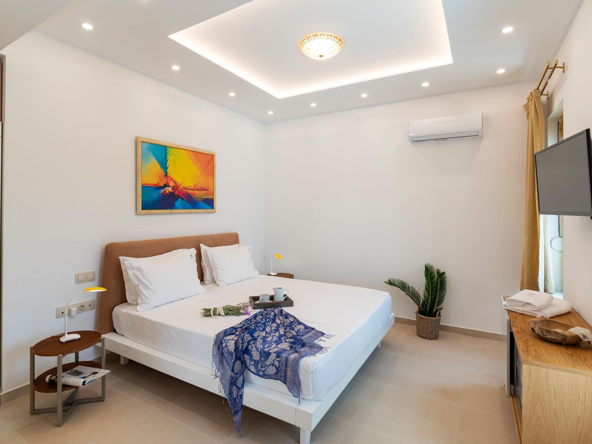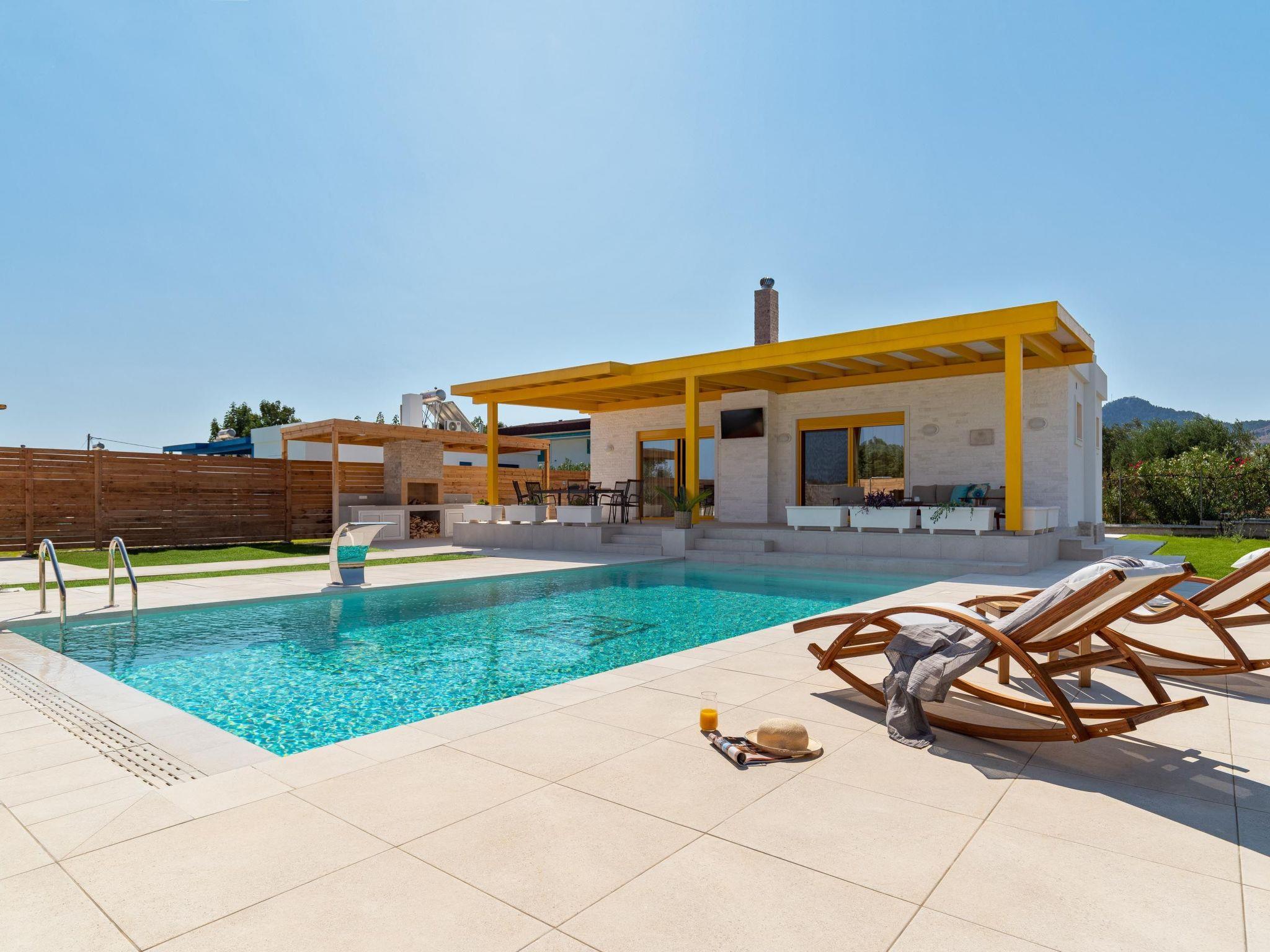 Villa Ilios has two fully air-conditioned bedrooms with ensuite bathrooms with showers and a comfy double sofa-bed in the living room. There is also one bathroom with a shower next to the living room. The kitchen is fully equipped, suitable for any meal preparation accompanied by the sitting area. The interior design is absolutely incredible with a tasteful decoration. Guests will find flat screen TVs and free Wi-Fi access throughout the property. Outdoors, there’s a magnificent private swimming pool and sitting areas to relax under the Aegean sun. The BBQ facility and utensils offer you the opportunity to enjoy outdoor al fresco dinners by the pool.