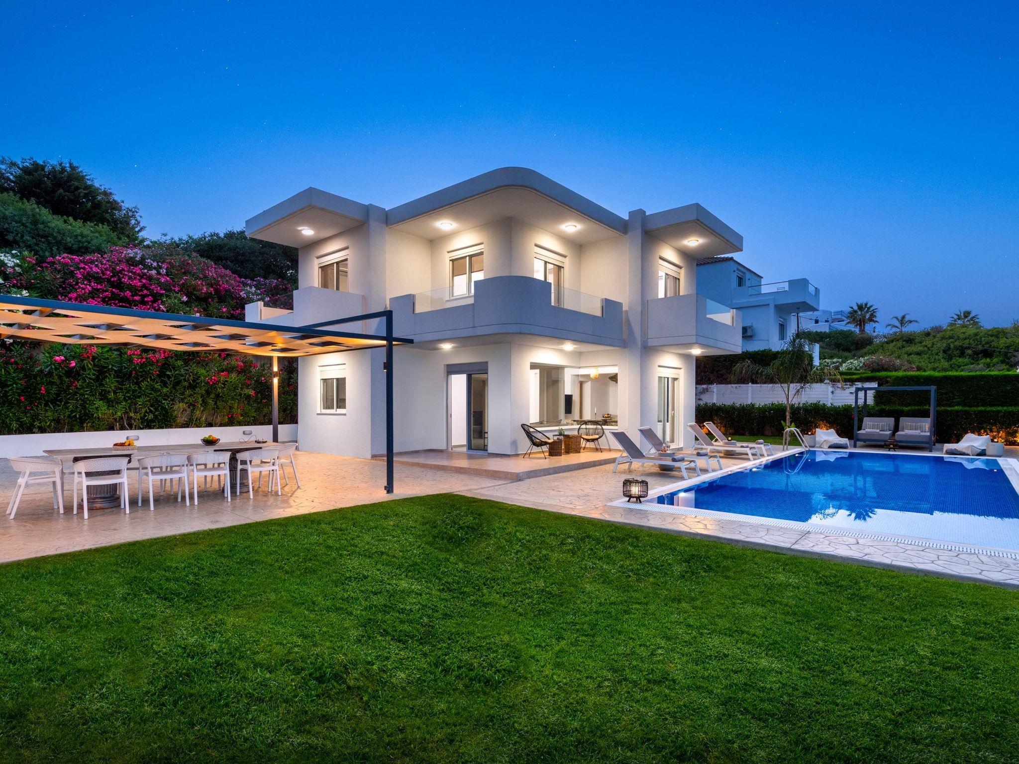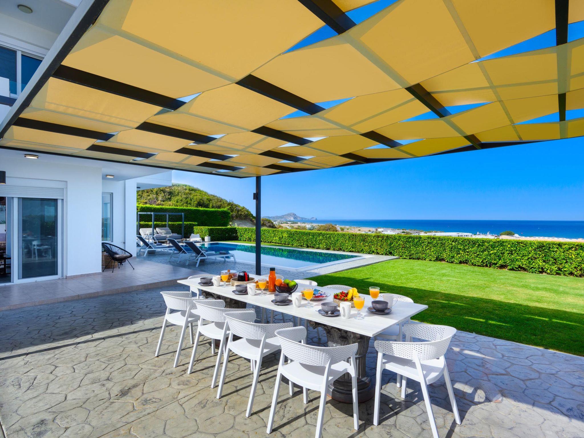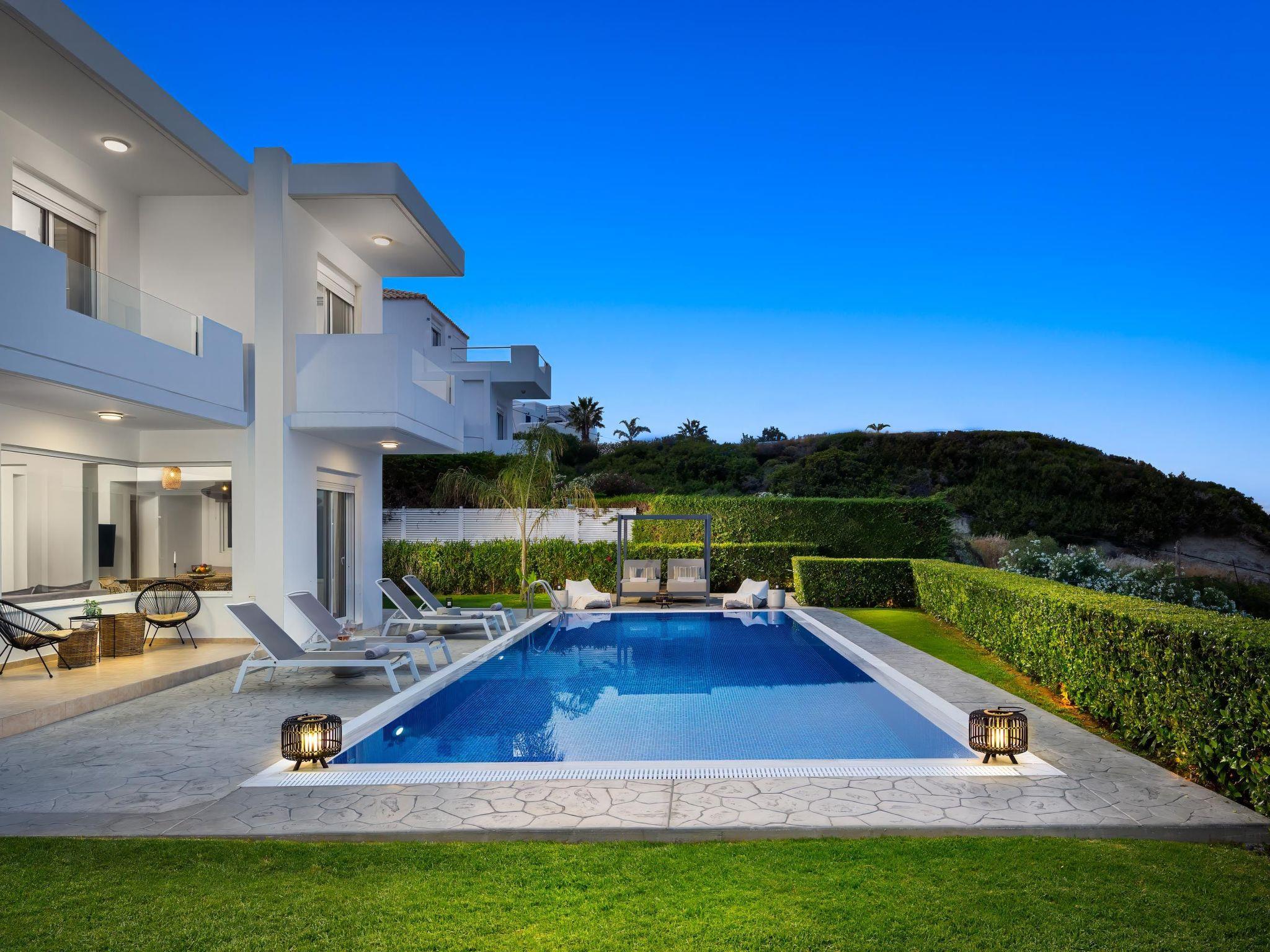 Hill & sea view Villa is brand new and has a tasteful decorating approach that magnetizes you as soon as you arrive to the property. Villa has 5 modern bedrooms and 3 bathrooms, 2 of them are included in the bedrooms, also there is a wc. There is a separate fully equipped kitchen for any meal preparation as well as a luxurious dining area with a window viewing the emerald waters of the island. The living area is quite inviting in its warm colors and the screen TV. There’s free Wi-Fi access throughout the property. Outdoors, guests will find their private swimming pool and the sunbeds, everything designed in a minimal style. The surrounding area of the pool is pretty pleasant, as long as you gaze to this extraordinary view it will offer you peace. Also, you can enjoy the BBQ facilities and the modern sitting area.