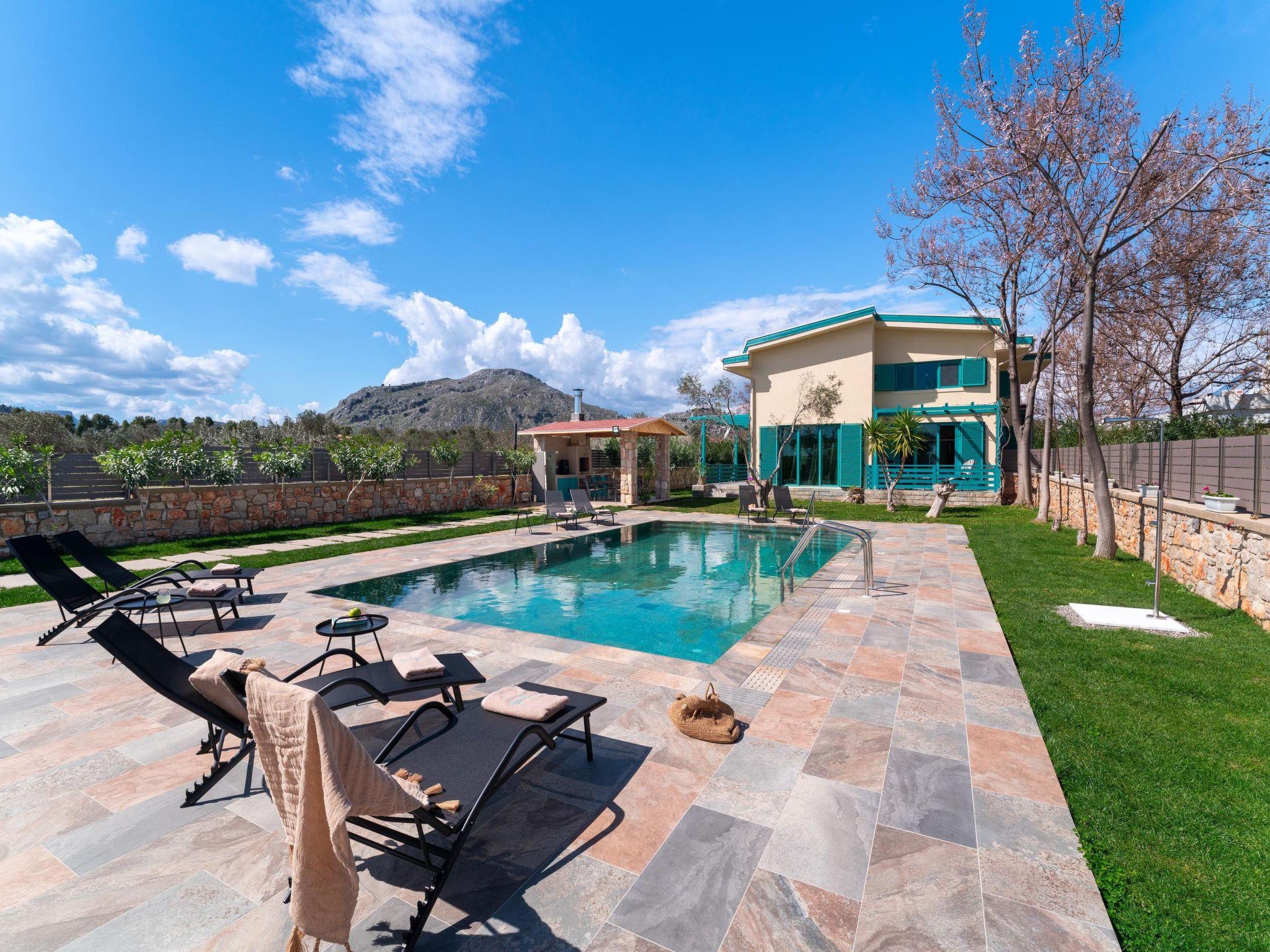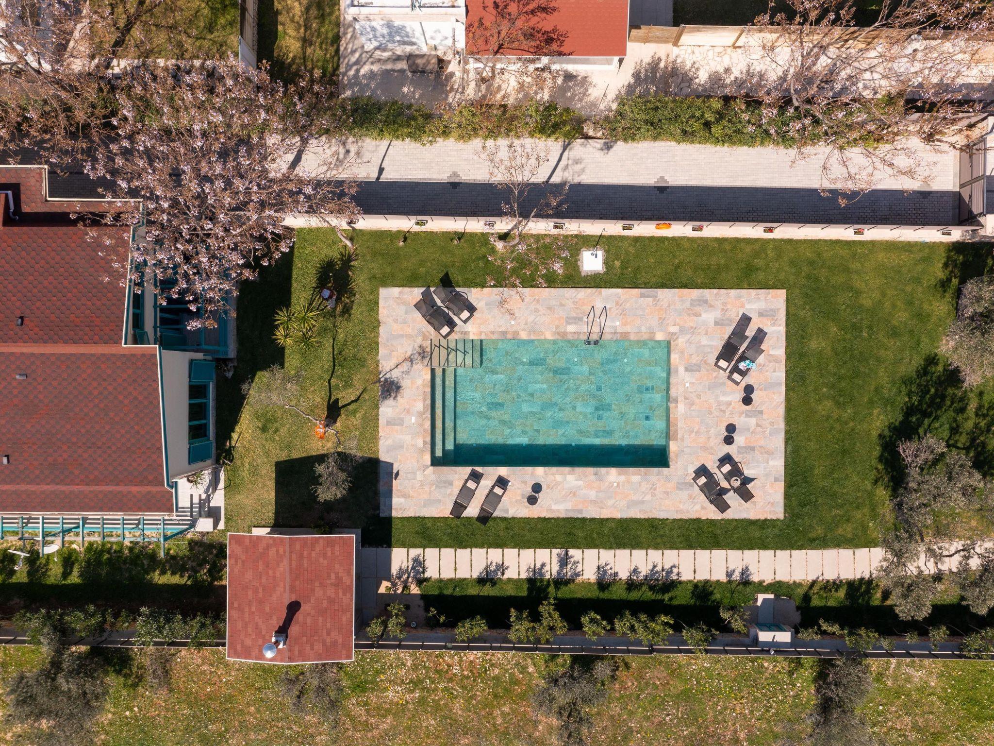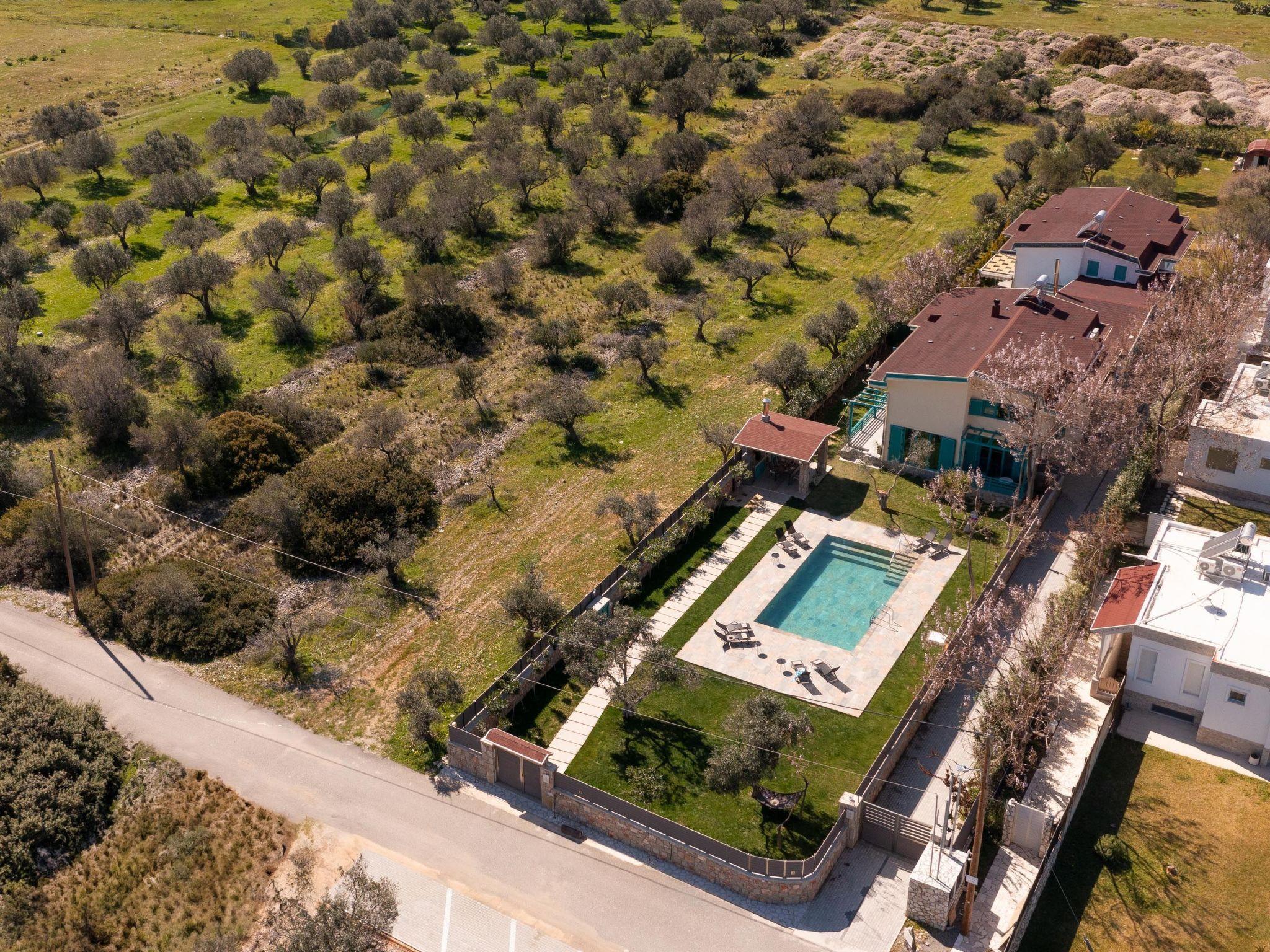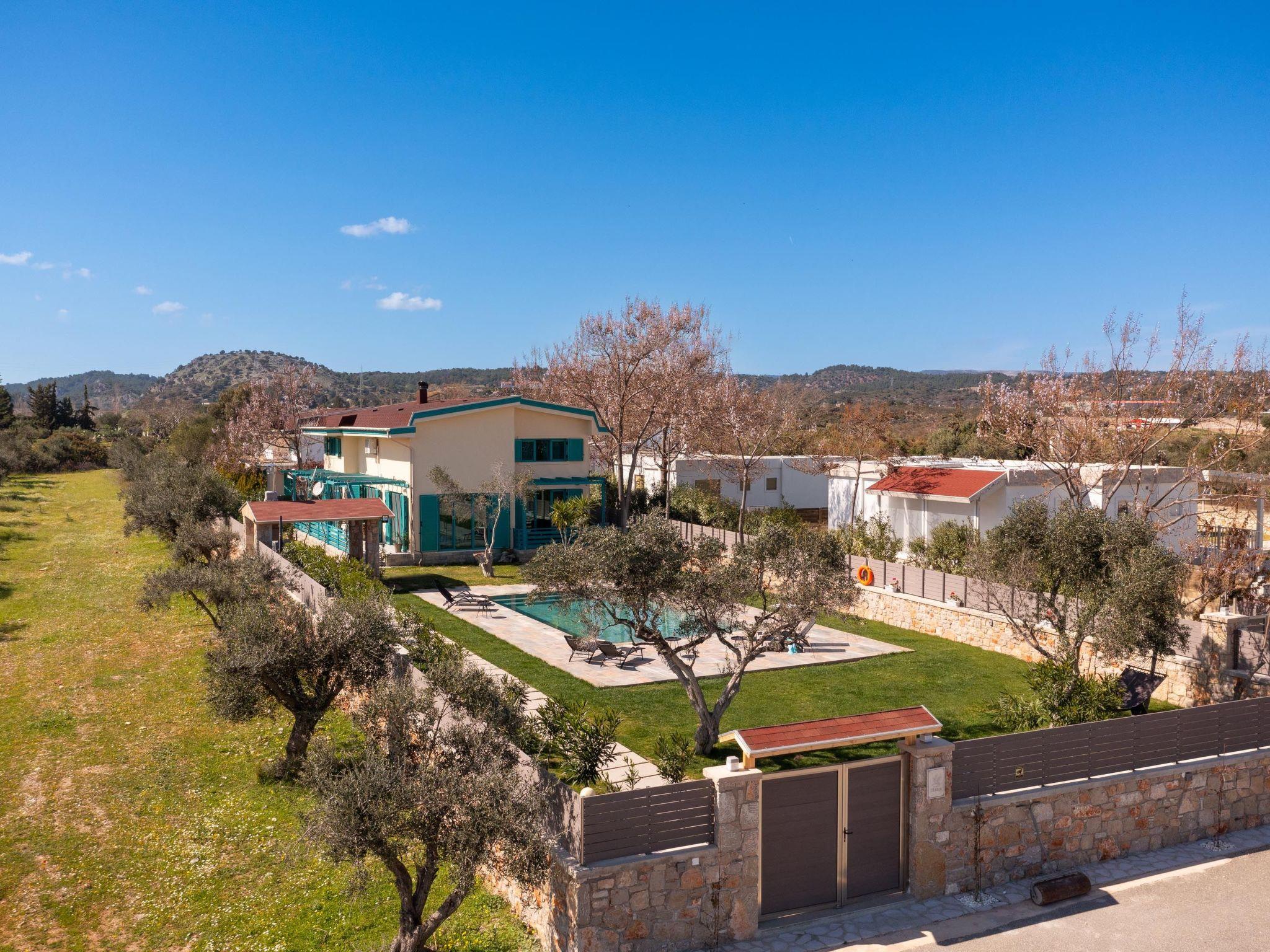 Throughout centuries, the people of Rhodes have used various types of stone to construct their towns, temples. Villa Terra stands as a testament to the craftsmanship and artistry of master stonemasons (?????t?st??), meticulously hand-carving each stone of the fence to preserve the distinctive nuances of the local terrain. The turquoise essence of the Aegean breeze woven into the windows and shutters. Spacious patio, lush green surroundings, a dedicated BBQ area equipped with TV and all the essentials invite guests to leisurely gatherings. Dive into the refreshing embrace of the spacious swimming pool, complete with amenities for both relaxation and recreation, including a counter-current feature and a Jacuzzi section. Inside, Villa Terra exudes a sense of balance and harmony. Natural wooden parquet, marble fireplace, onyx accents and a graceful oak staircase adorn the floors, leading to three elegantly appointed bedrooms with en-suite bathrooms. King-size beds on the upper floor and singles on the lower floor offer comfortable accommodations for up to six guests. With provision for additional 2 beds and 2 baby cots upon request, ensuring comfortable accommodations for larger groups or families. Each room is equipped with air conditioning, guaranteeing optimal comfort throughout your stay. The ground floor features a dedicated toilet and a fully equipped laundry room, complete with ironing facilities for added convenience. An airy open-plan living room seamlessly transitions into a sleek Scavolini kitchen, boasting contemporary appliances and generous counter space. A central island invites casual dining or an afternoon drink on the bar stools, leather sofas and armchairs invite relaxation. A private garage within the villa premises accommodates two cars, with extra parking available outside.
