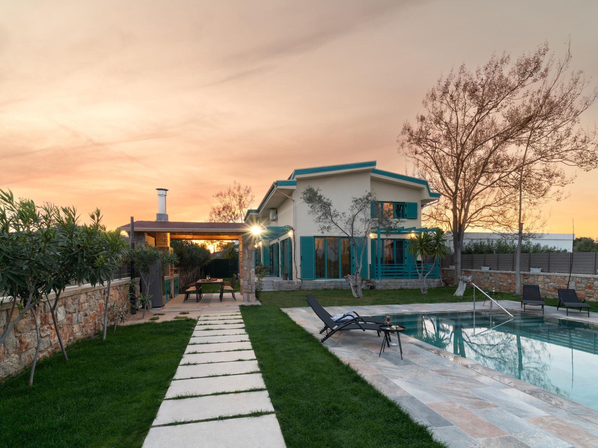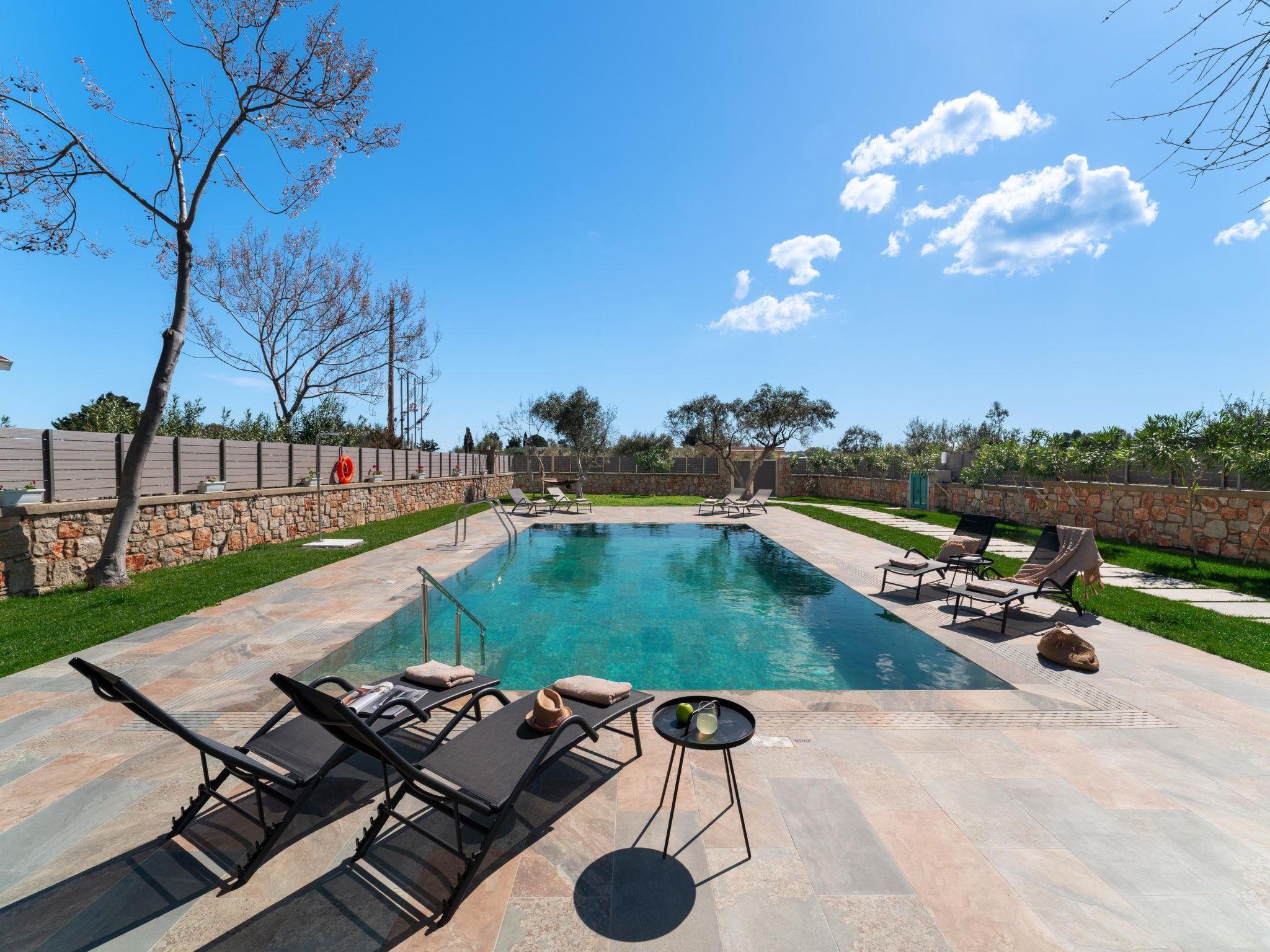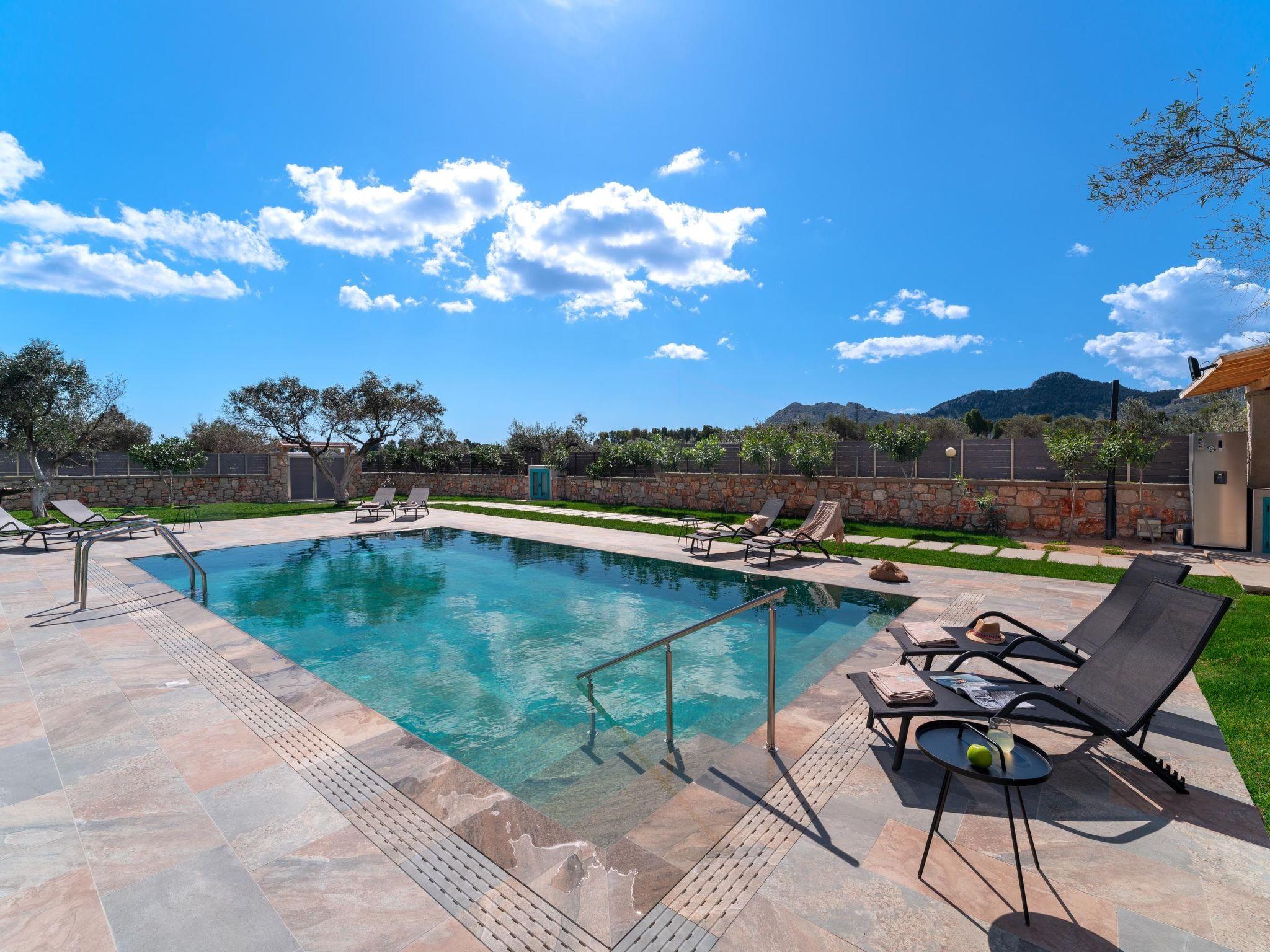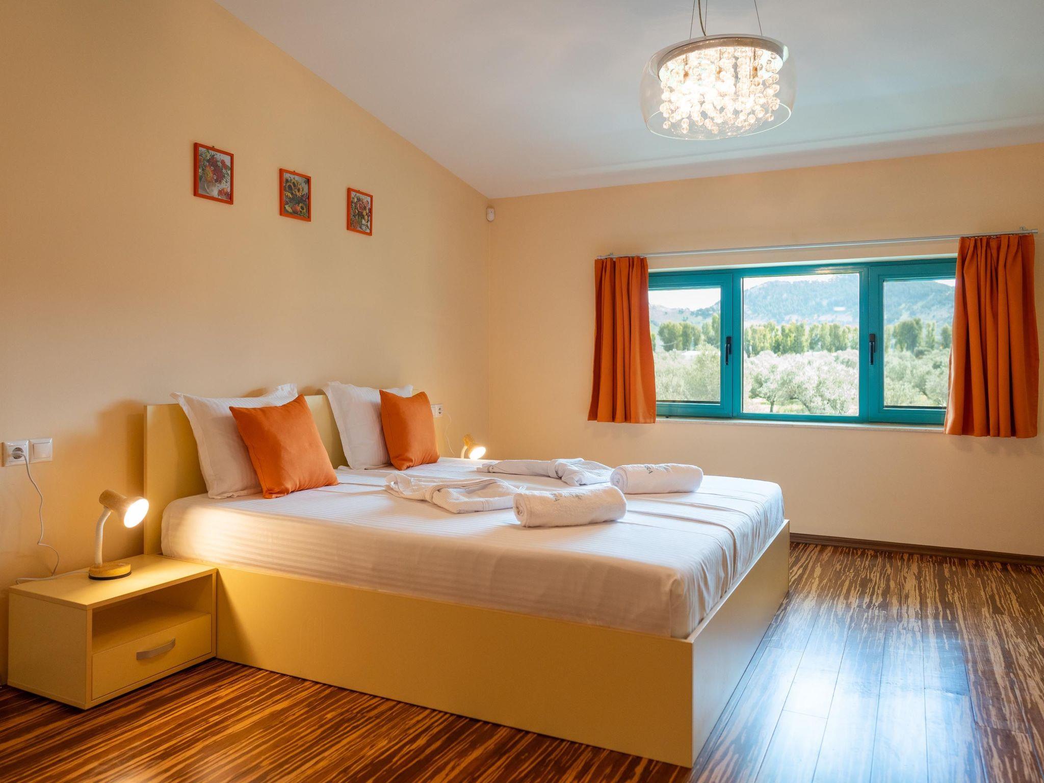 Throughout centuries, the people of Rhodes have used various types of stone to construct their towns, temples. Villa Terra stands as a testament to the craftsmanship and artistry of master stonemasons (?????t?st??), meticulously hand-carving each stone of the fence to preserve the distinctive nuances of the local terrain. The turquoise essence of the Aegean breeze woven into the windows and shutters. Spacious patio, lush green surroundings, a dedicated BBQ area equipped with TV and all the essentials invite guests to leisurely gatherings. Dive into the refreshing embrace of the spacious swimming pool, complete with amenities for both relaxation and recreation, including a counter-current feature and a Jacuzzi section. Inside, Villa Terra exudes a sense of balance and harmony. Natural wooden parquet, marble fireplace, onyx accents and a graceful oak staircase adorn the floors, leading to three elegantly appointed bedrooms with en-suite bathrooms. King-size beds on the upper floor and singles on the lower floor offer comfortable accommodations for up to six guests. With provision for additional 2 beds and 2 baby cots upon request, ensuring comfortable accommodations for larger groups or families. Each room is equipped with air conditioning, guaranteeing optimal comfort throughout your stay. The ground floor features a dedicated toilet and a fully equipped laundry room, complete with ironing facilities for added convenience. An airy open-plan living room seamlessly transitions into a sleek Scavolini kitchen, boasting contemporary appliances and generous counter space. A central island invites casual dining or an afternoon drink on the bar stools, leather sofas and armchairs invite relaxation. A private garage within the villa premises accommodates two cars, with extra parking available outside.