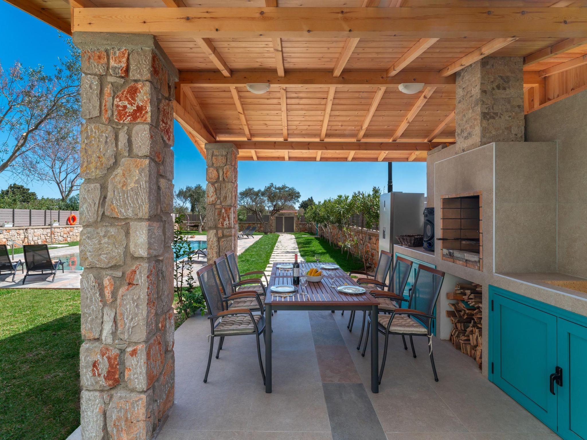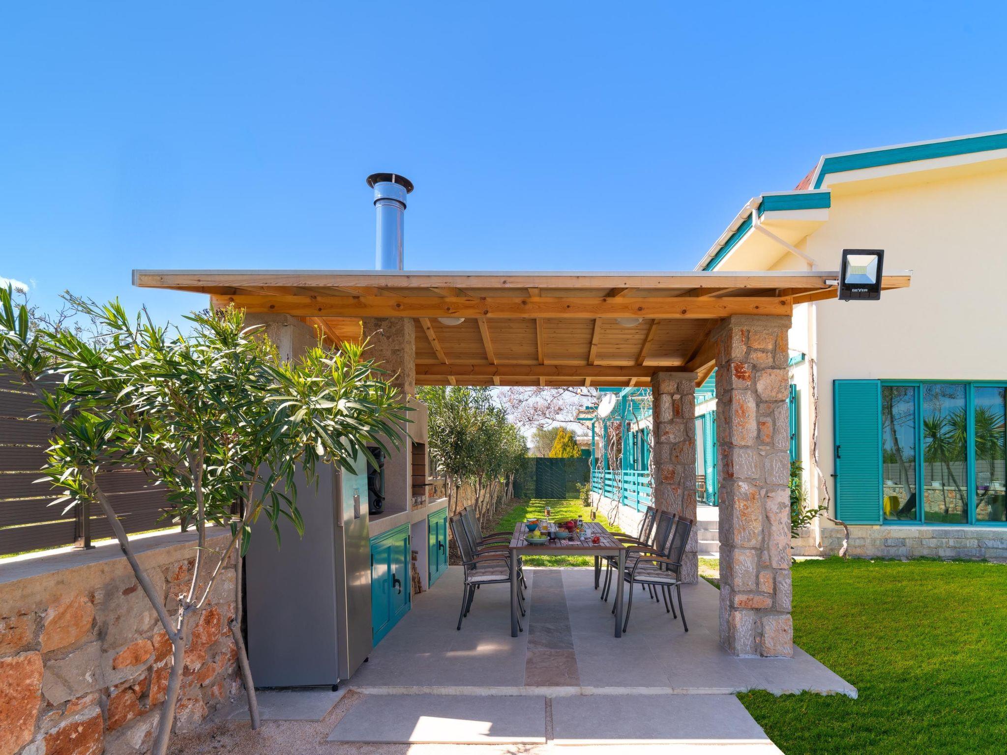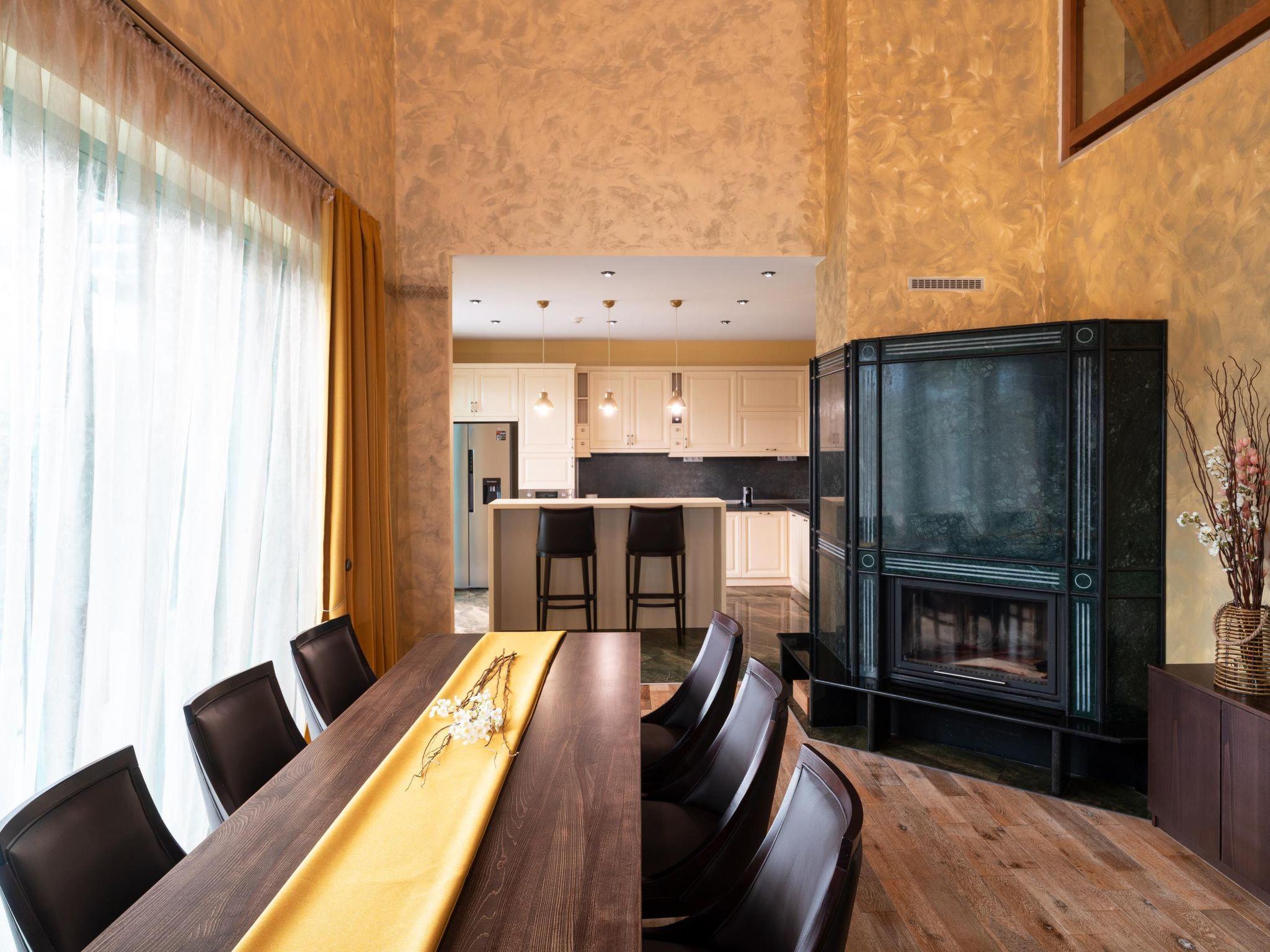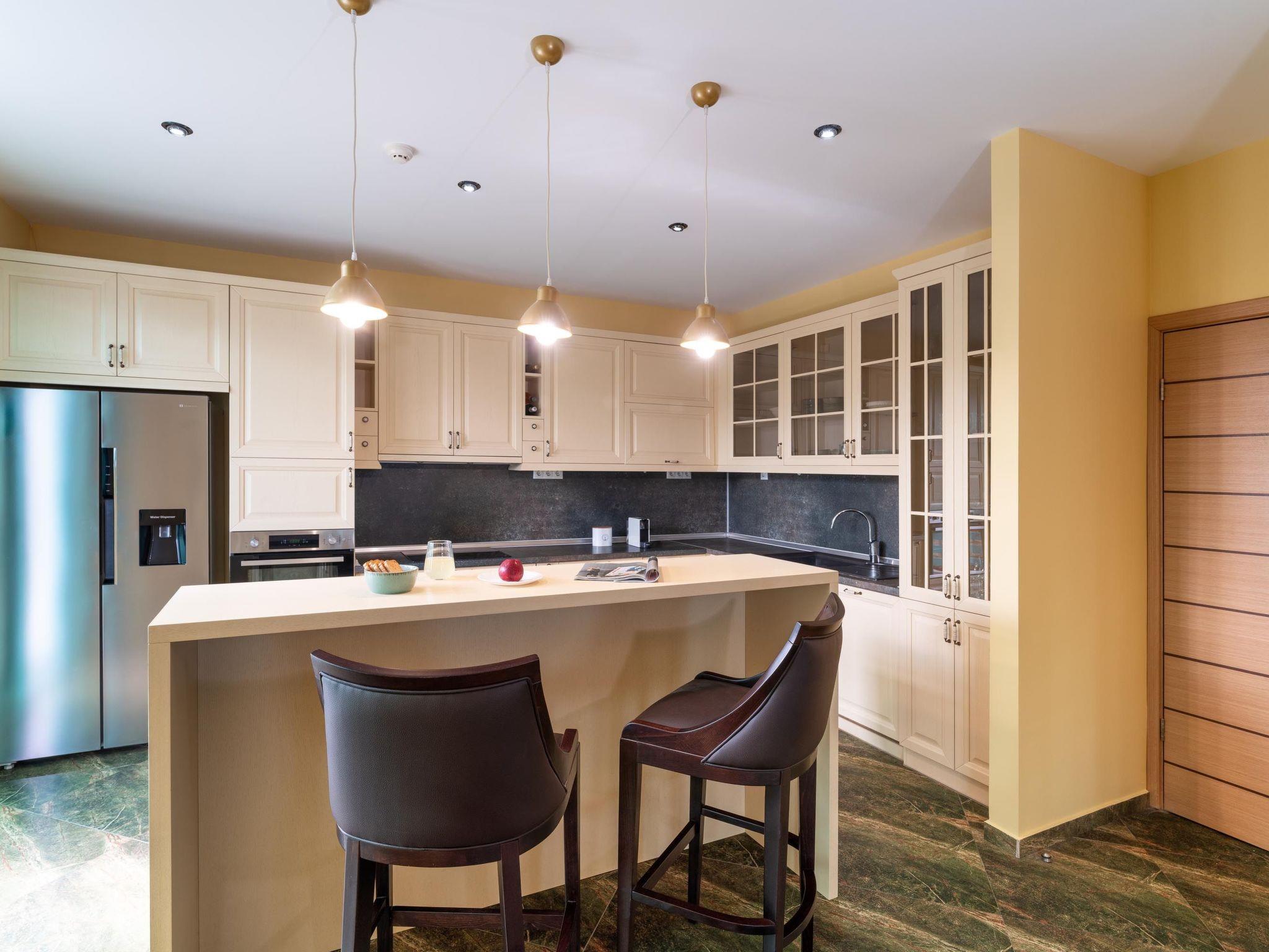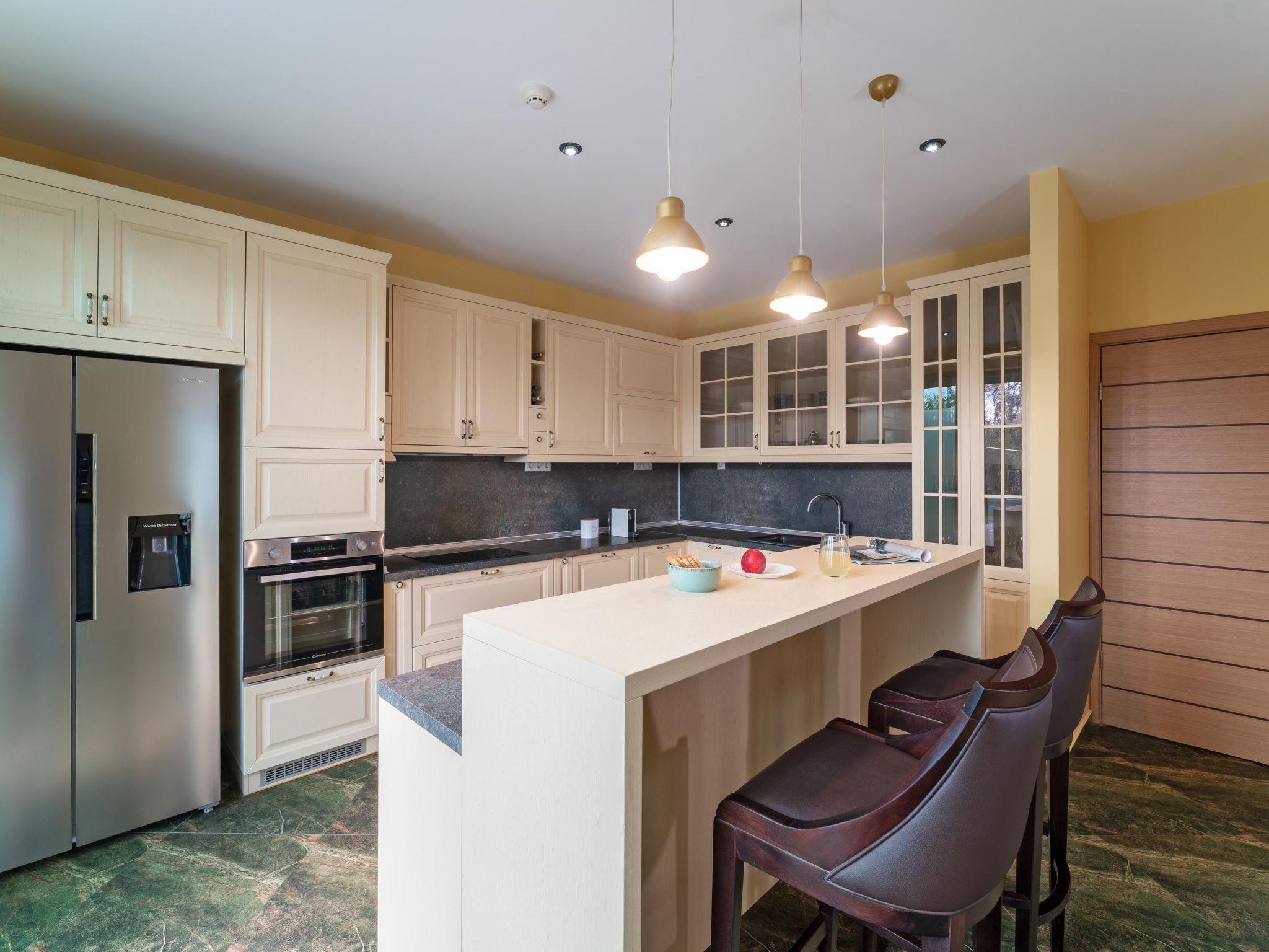 Throughout centuries, the people of Rhodes have used various types of stone to construct their towns, temples. Villa Terra stands as a testament to the craftsmanship and artistry of master stonemasons (?????t?st??), meticulously hand-carving each stone of the fence to preserve the distinctive nuances of the local terrain. The turquoise essence of the Aegean breeze woven into the windows and shutters. Spacious patio, lush green surroundings, a dedicated BBQ area equipped with TV and all the essentials invite guests to leisurely gatherings. Dive into the refreshing embrace of the spacious swimming pool, complete with amenities for both relaxation and recreation, including a counter-current feature and a Jacuzzi section. Inside, Villa Terra exudes a sense of balance and harmony. Natural wooden parquet, marble fireplace, onyx accents and a graceful oak staircase adorn the floors, leading to three elegantly appointed bedrooms with en-suite bathrooms. King-size beds on the upper floor and singles on the lower floor offer comfortable accommodations for up to six guests. With provision for additional 2 beds and 2 baby cots upon request, ensuring comfortable accommodations for larger groups or families. Each room is equipped with air conditioning, guaranteeing optimal comfort throughout your stay. The ground floor features a dedicated toilet and a fully equipped laundry room, complete with ironing facilities for added convenience. An airy open-plan living room seamlessly transitions into a sleek Scavolini kitchen, boasting contemporary appliances and generous counter space. A central island invites casual dining or an afternoon drink on the bar stools, leather sofas and armchairs invite relaxation. A private garage within the villa premises accommodates two cars, with extra parking available outside.