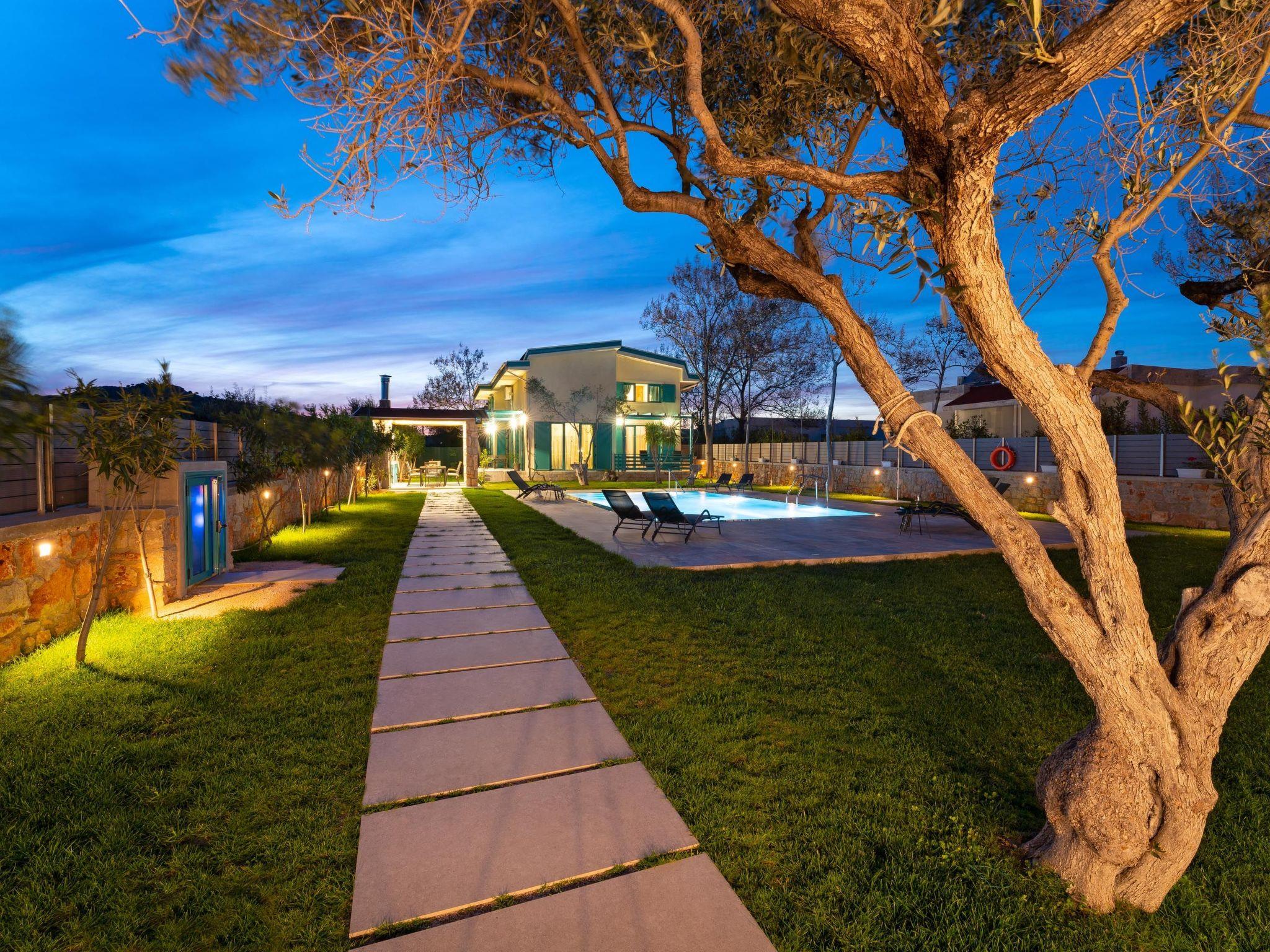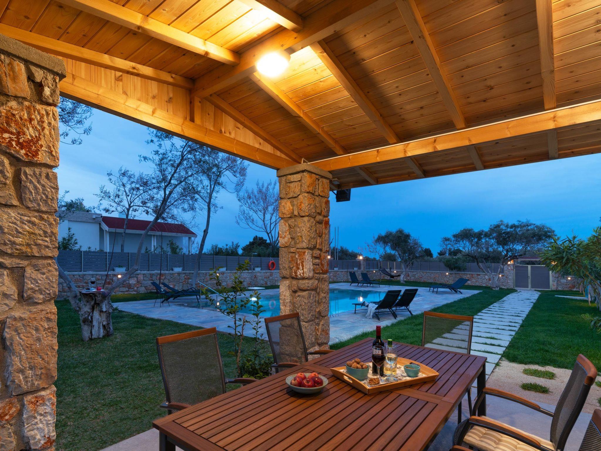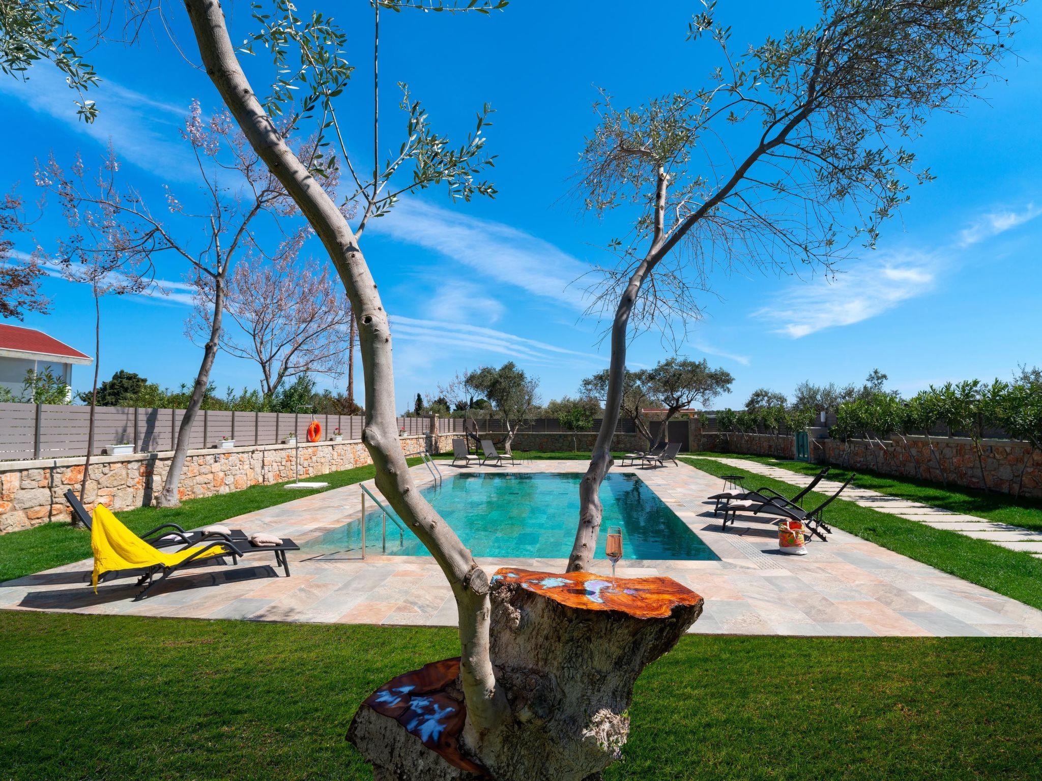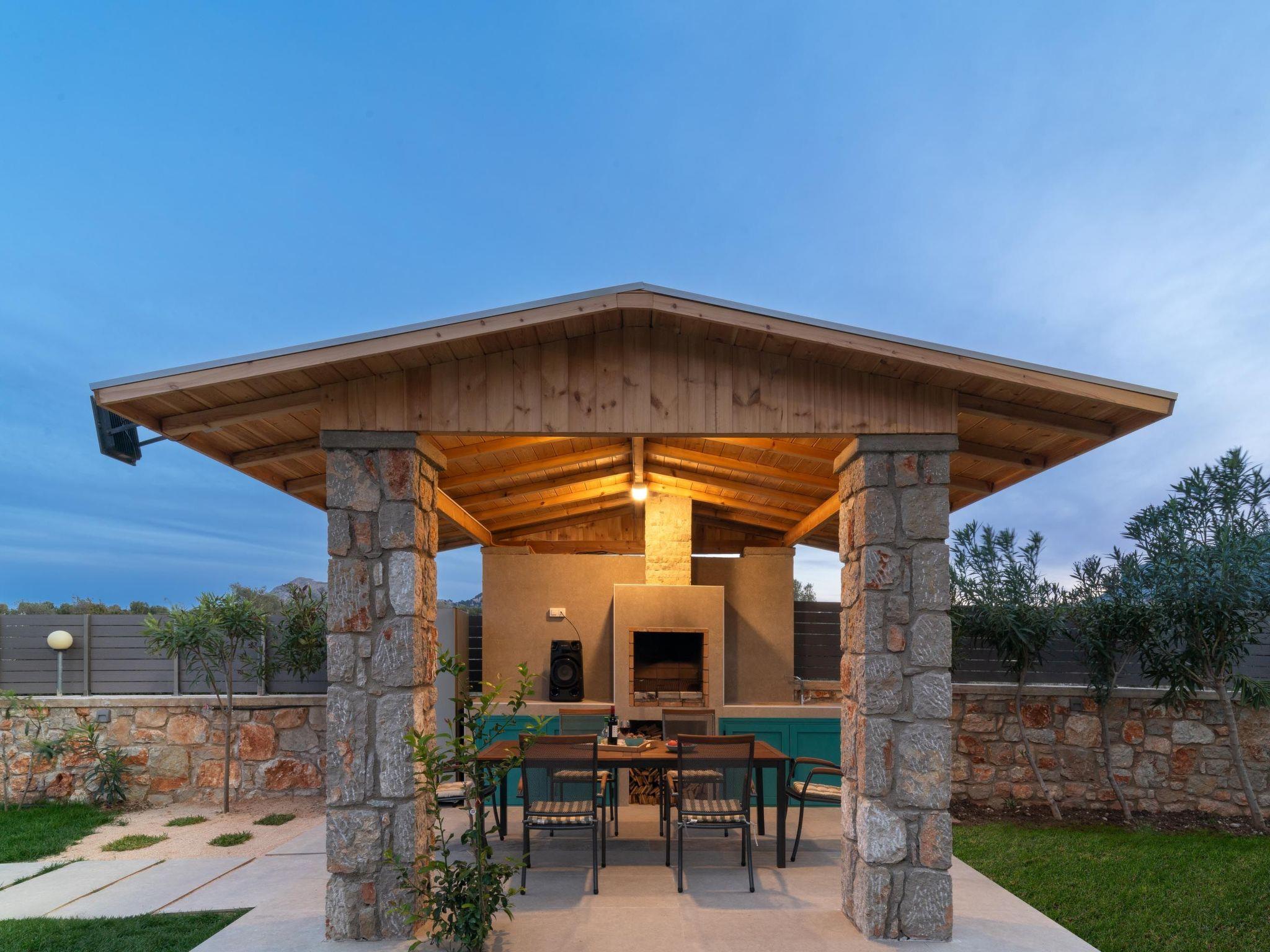 Throughout centuries, the people of Rhodes have used various types of stone to construct their towns, temples. Villa Terra stands as a testament to the craftsmanship and artistry of master stonemasons (?????t?st??), meticulously hand-carving each stone of the fence to preserve the distinctive nuances of the local terrain. The turquoise essence of the Aegean breeze woven into the windows and shutters. Spacious patio, lush green surroundings, a dedicated BBQ area equipped with TV and all the essentials invite guests to leisurely gatherings. Dive into the refreshing embrace of the spacious swimming pool, complete with amenities for both relaxation and recreation, including a counter-current feature and a Jacuzzi section. Inside, Villa Terra exudes a sense of balance and harmony. Natural wooden parquet, marble fireplace, onyx accents and a graceful oak staircase adorn the floors, leading to three elegantly appointed bedrooms with en-suite bathrooms. King-size beds on the upper floor and singles on the lower floor offer comfortable accommodations for up to six guests. With provision for additional 2 beds and 2 baby cots upon request, ensuring comfortable accommodations for larger groups or families. Each room is equipped with air conditioning, guaranteeing optimal comfort throughout your stay. The ground floor features a dedicated toilet and a fully equipped laundry room, complete with ironing facilities for added convenience. An airy open-plan living room seamlessly transitions into a sleek Scavolini kitchen, boasting contemporary appliances and generous counter space. A central island invites casual dining or an afternoon drink on the bar stools, leather sofas and armchairs invite relaxation. A private garage within the villa premises accommodates two cars, with extra parking available outside.