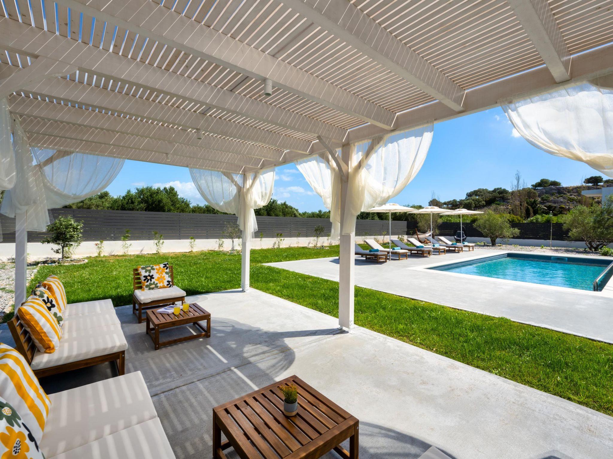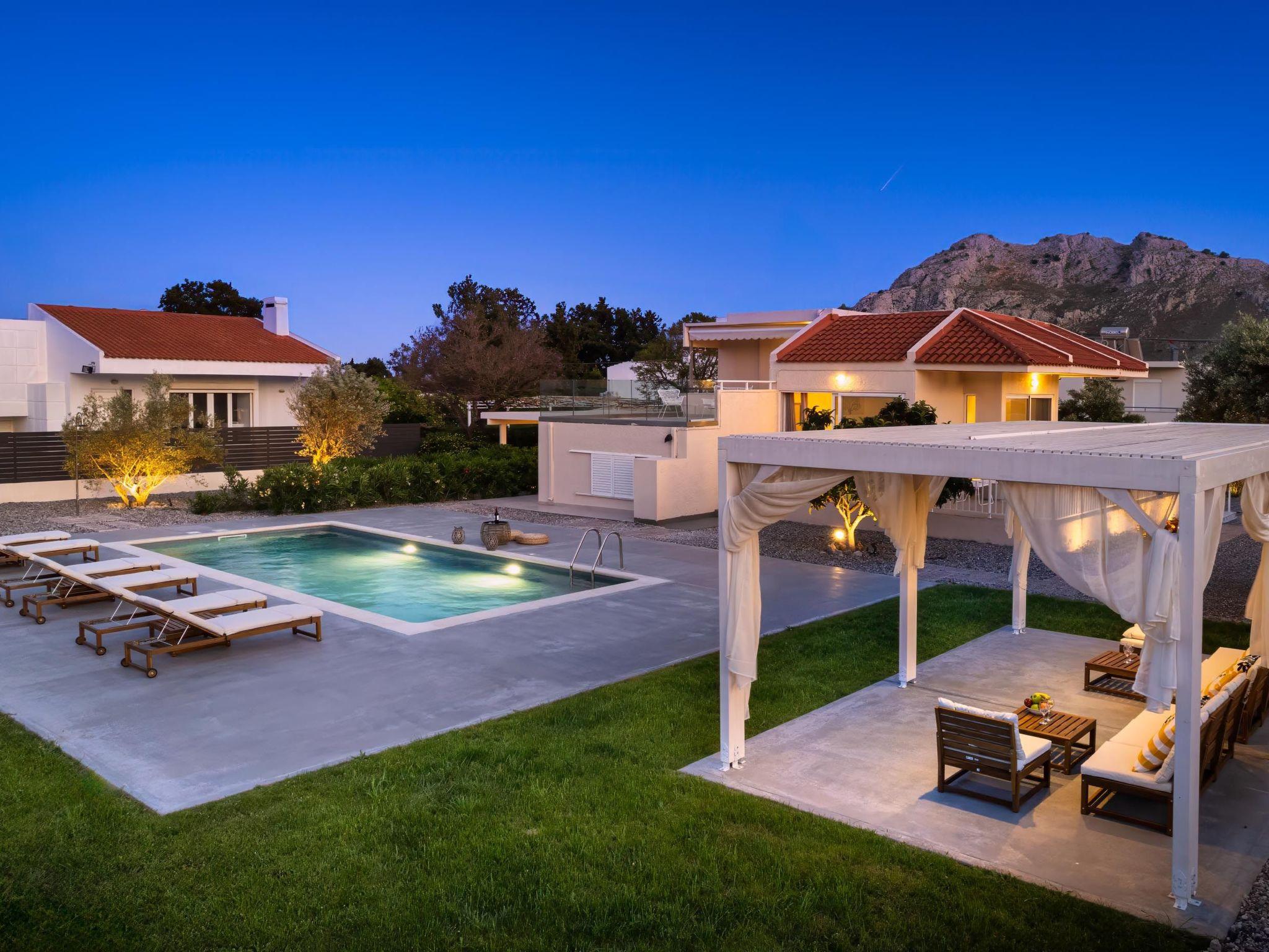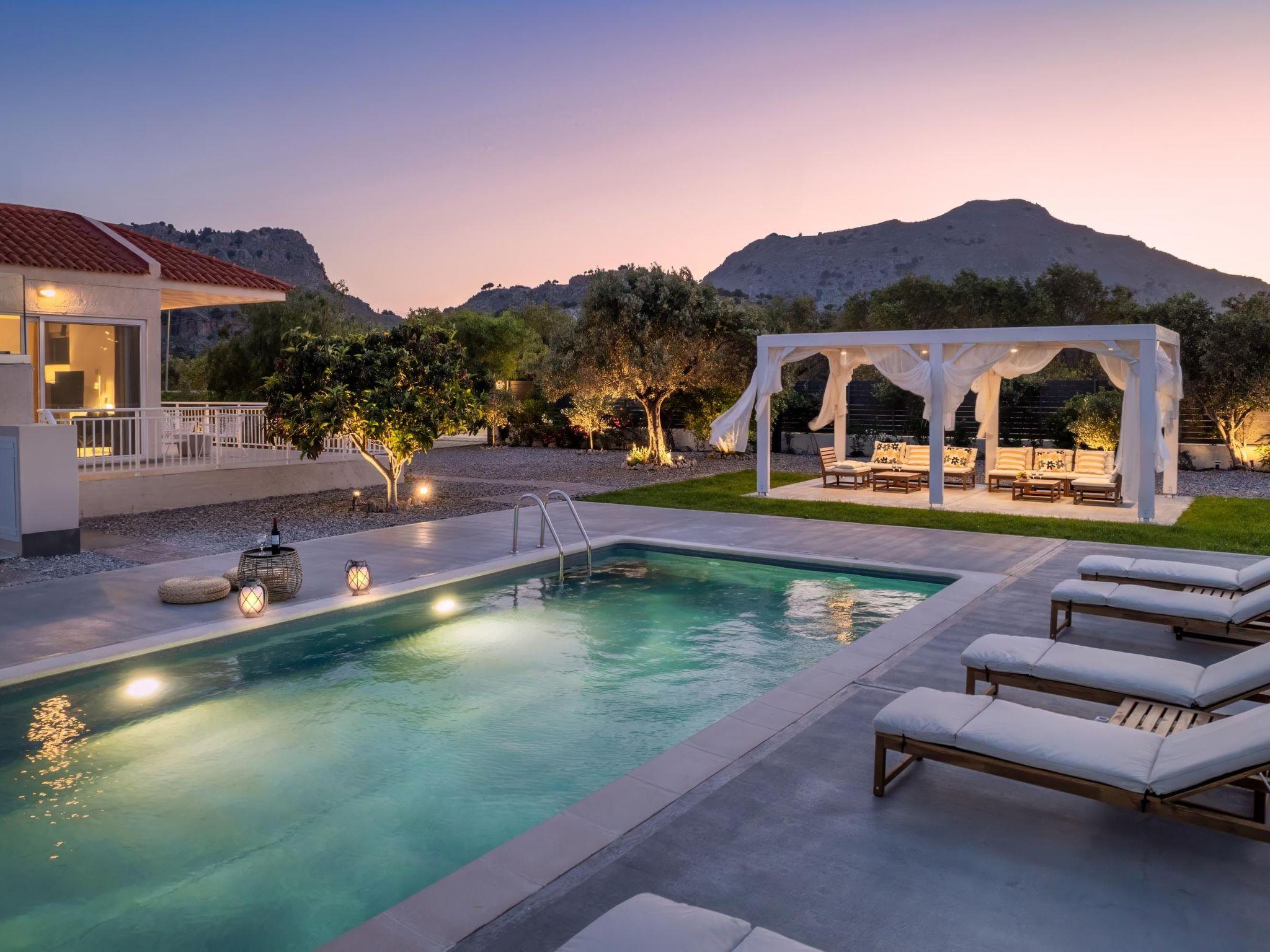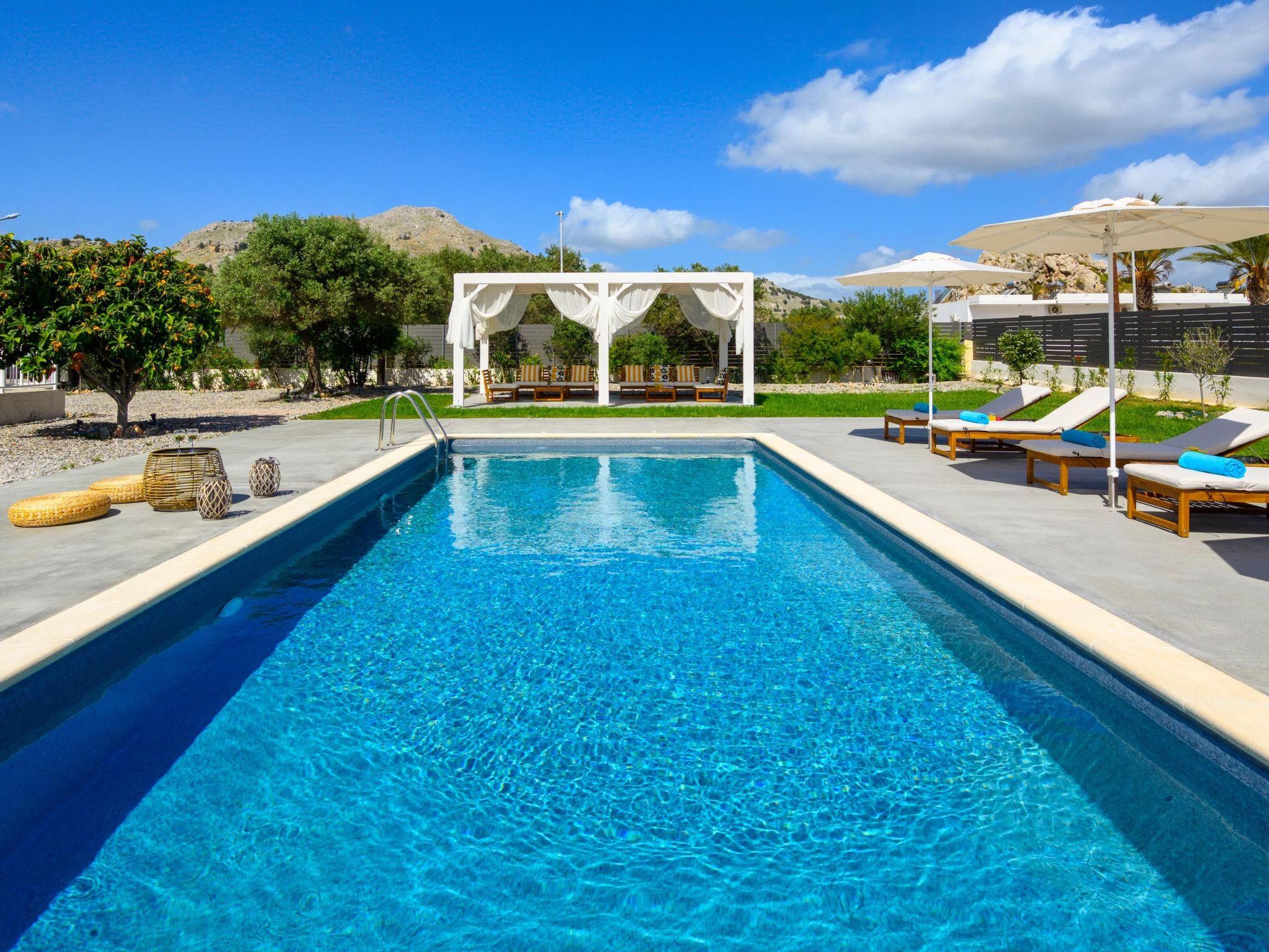 Eternity Villa in Kolympia, Rhodes, welcomes up to 7 guests. This spacious retreat offers modern amenities, including a private pool and lush garden. With multiple bedrooms and bathrooms, it ensures comfort and privacy for families or groups. Enjoy serene surroundings and easy access to nearby attractions during your stay.