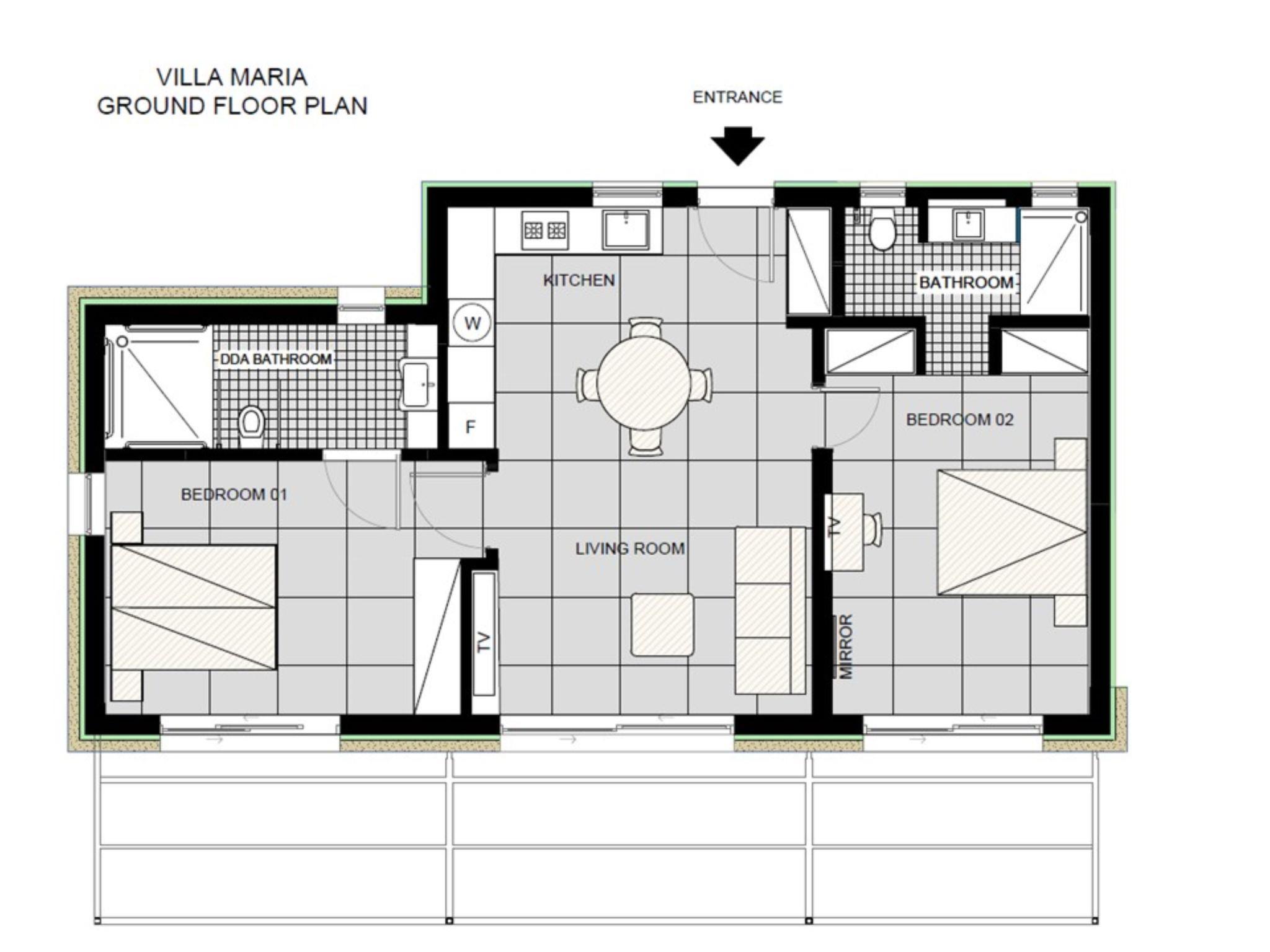 Maria prides itself on a harmonious interior that exudes warmth and relaxation. The villa features two dimmable double bedrooms, each with its own ensuite bathroom, providing ample space and privacy for up to 4 guests. In addition, one of the ensuite bedroom can accommodate guests with disabilities. These rooms are seamlessly connected to a welcoming open living area, equipped with a fully functional kitchen and dining space. Here, comfort is not just felt but experienced through thoughtful amenities such as air conditioning throughout, a washing machine, clothes dryer, dishwasher and an array of coffee machines including an espresso pot and a filter coffee machine, ensuring you have all the homely conveniences you need.