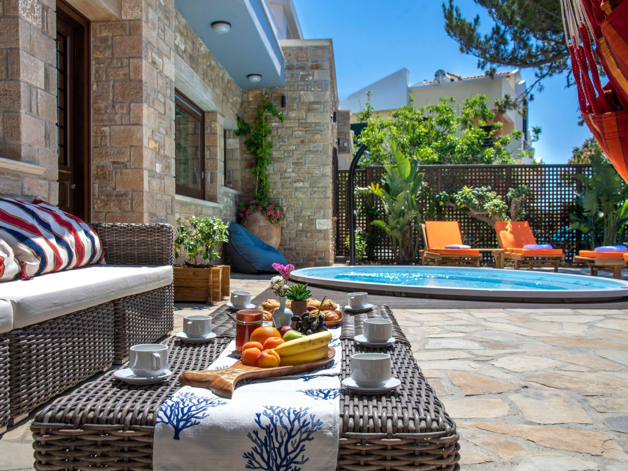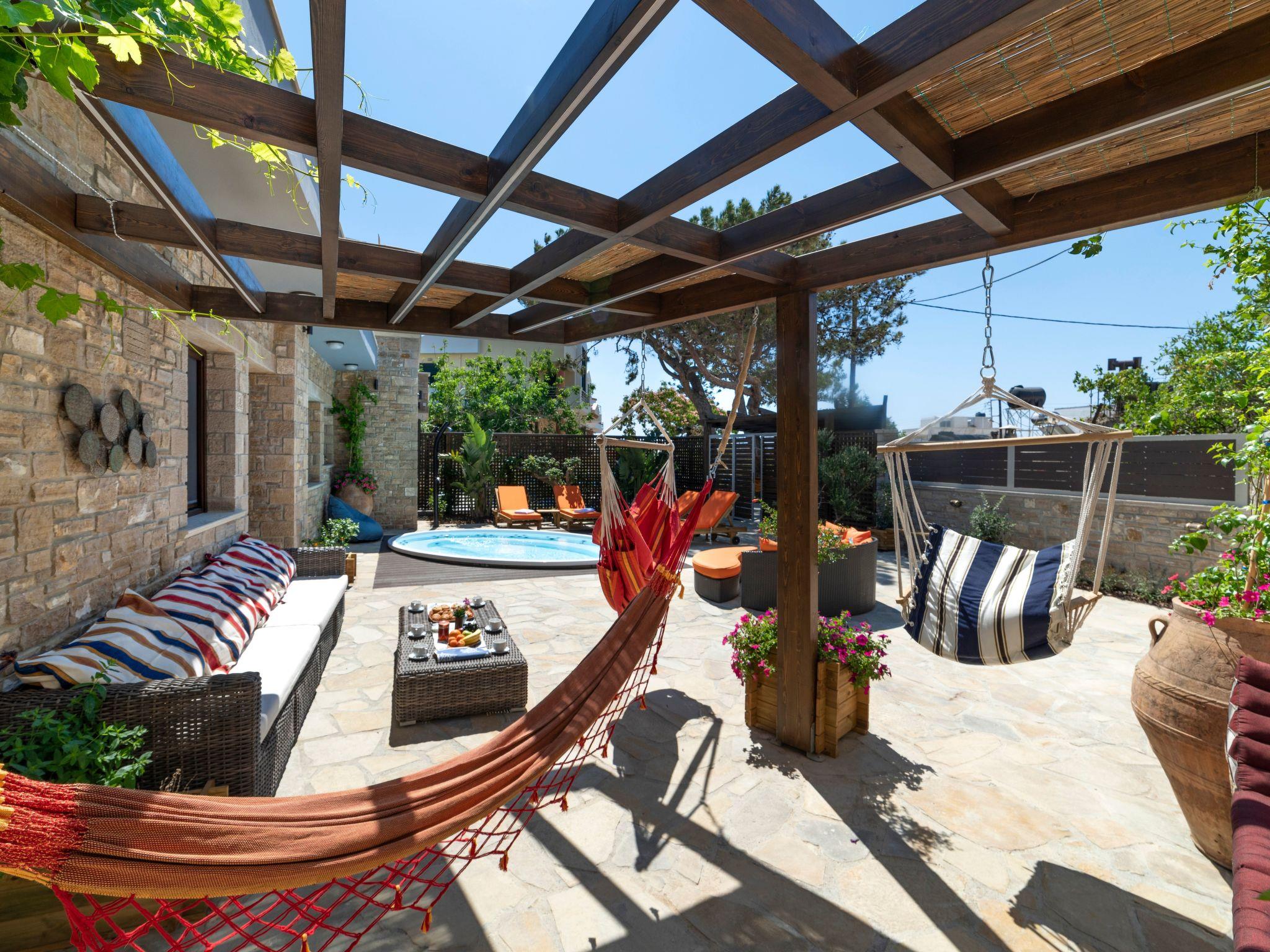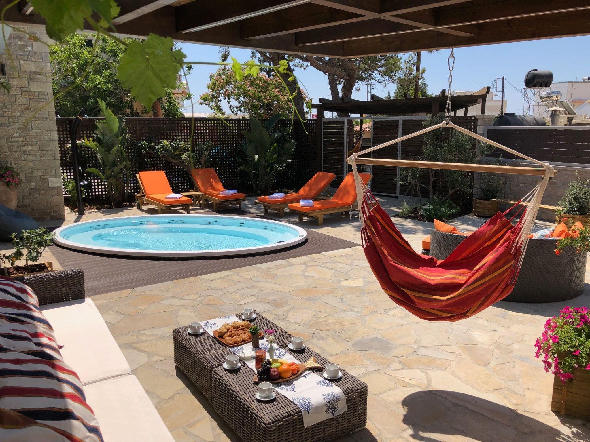 Built in 1935, Lemonia has been fully renovated to nicely blend contemporary and traditional accents. Inspired by the beauty of the Cretan land, natural elements and modernity blends in perfect harmony with a sense of unparalleled comfort. Lemonia (= Lemon tree) features 2 separate master suites with en-suite bathrooms, a comfy sitting area with fireplace, a stone dining table that fits 8, modern bathrooms with walk-in shower cabin and/or spa tub, and a large private patio with view to the garden and to the Zen huge outdoor spa tub. A third large bedroom with 3 single beds, one of which is for special needs. There is also a chair bed that can sleep a 4th child.