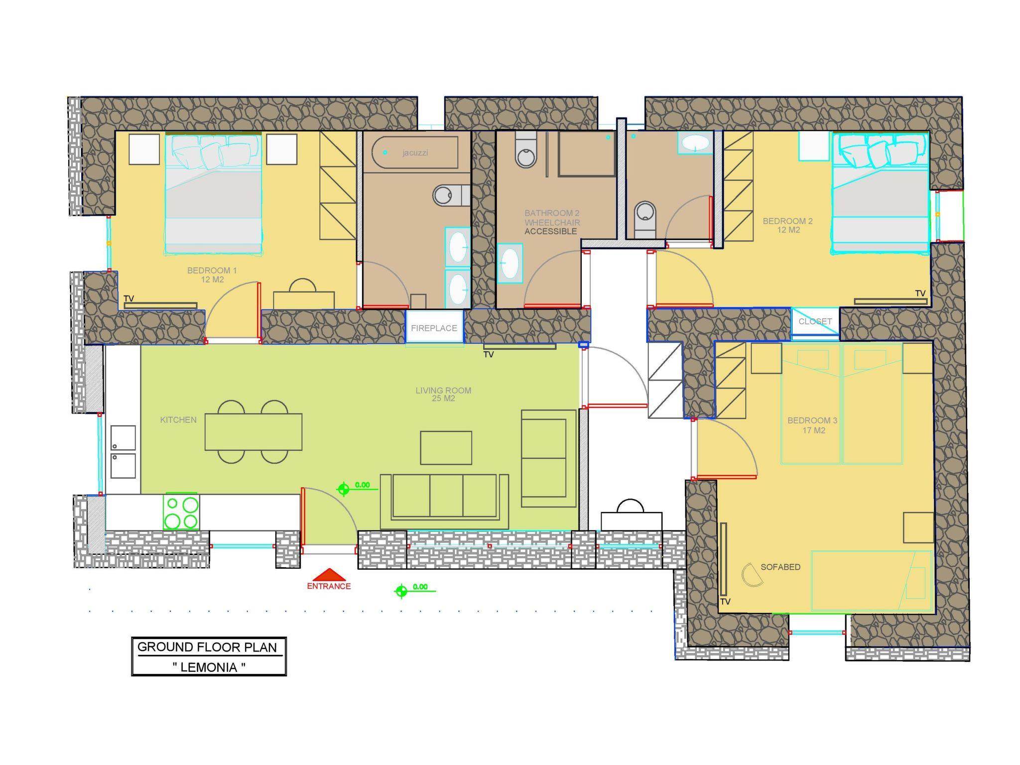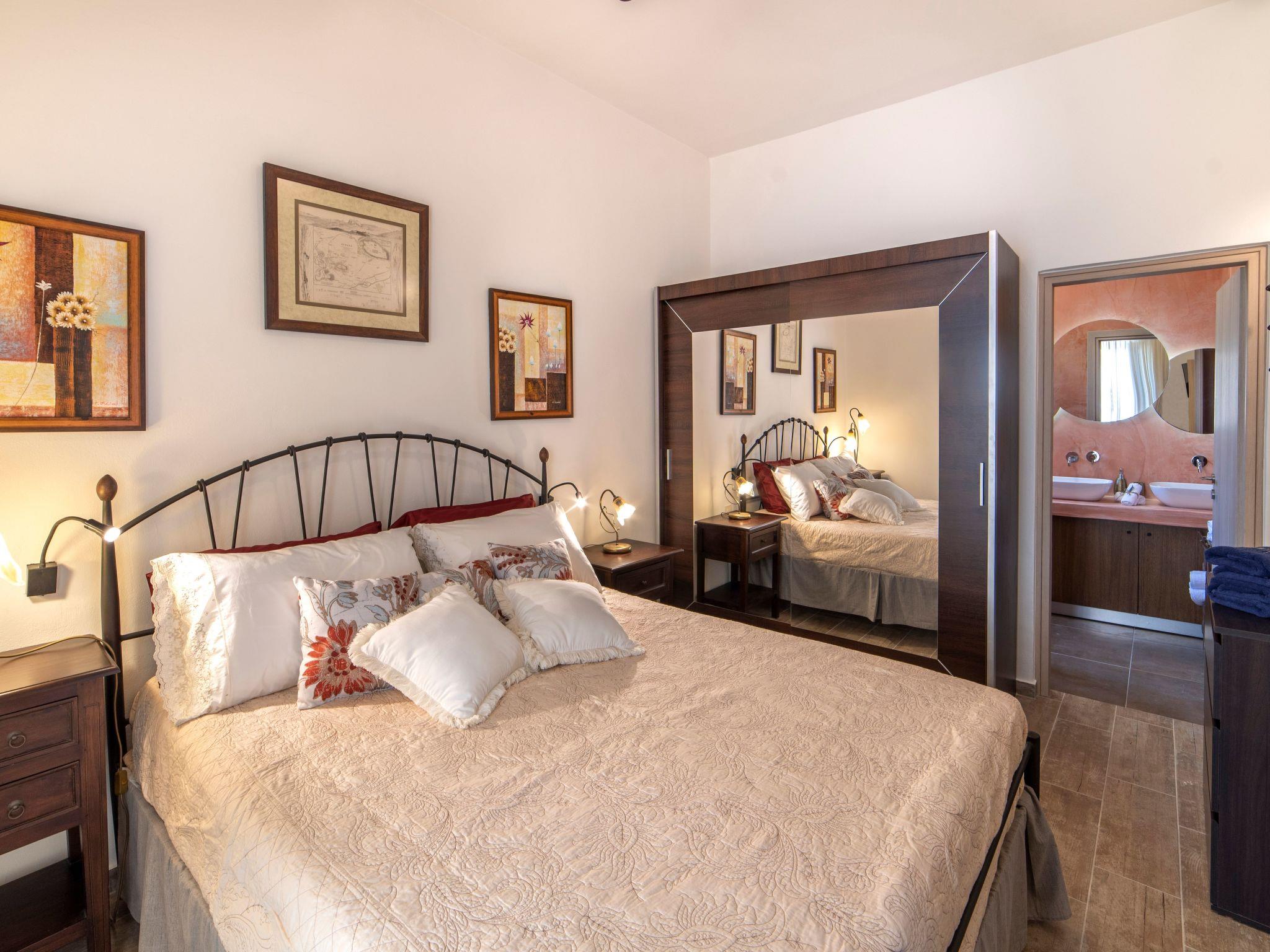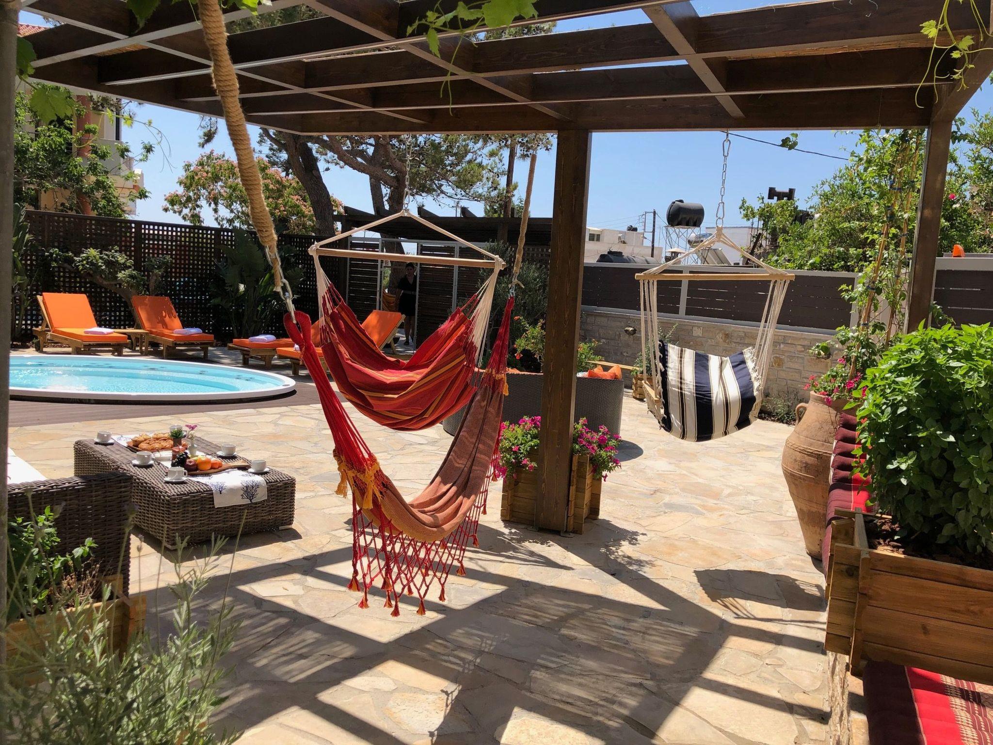 Built in 1935, Lemonia has been fully renovated to nicely blend contemporary and traditional accents. Inspired by the beauty of the Cretan land, natural elements and modernity blends in perfect harmony with a sense of unparalleled comfort. Lemonia (= Lemon tree) features 2 separate master suites with en-suite bathrooms, a comfy sitting area with fireplace, a stone dining table that fits 8, modern bathrooms with walk-in shower cabin and/or spa tub, and a large private patio with view to the garden and to the Zen huge outdoor spa tub. A third large bedroom with 3 single beds, one of which is for special needs. There is also a chair bed that can sleep a 4th child.