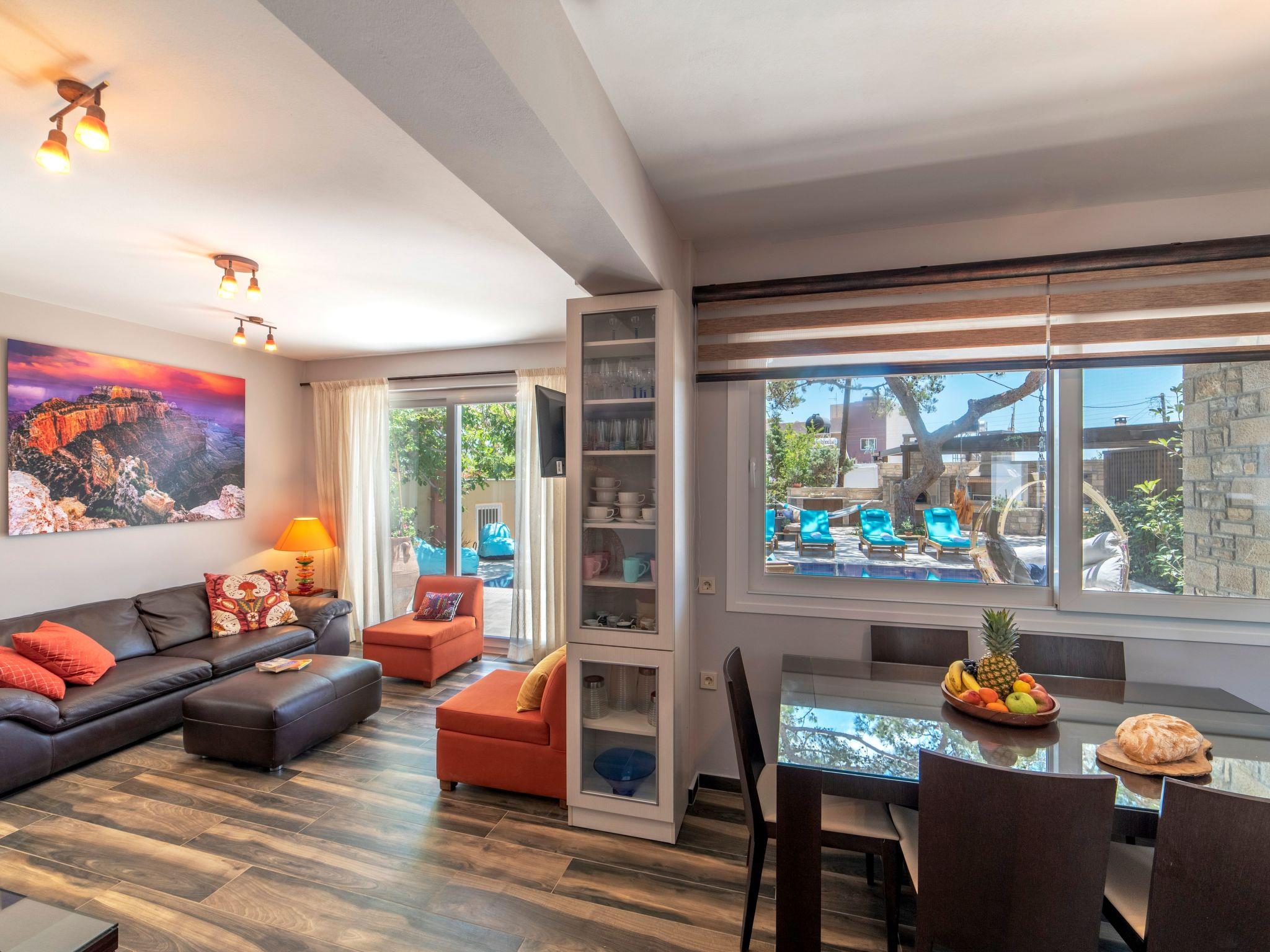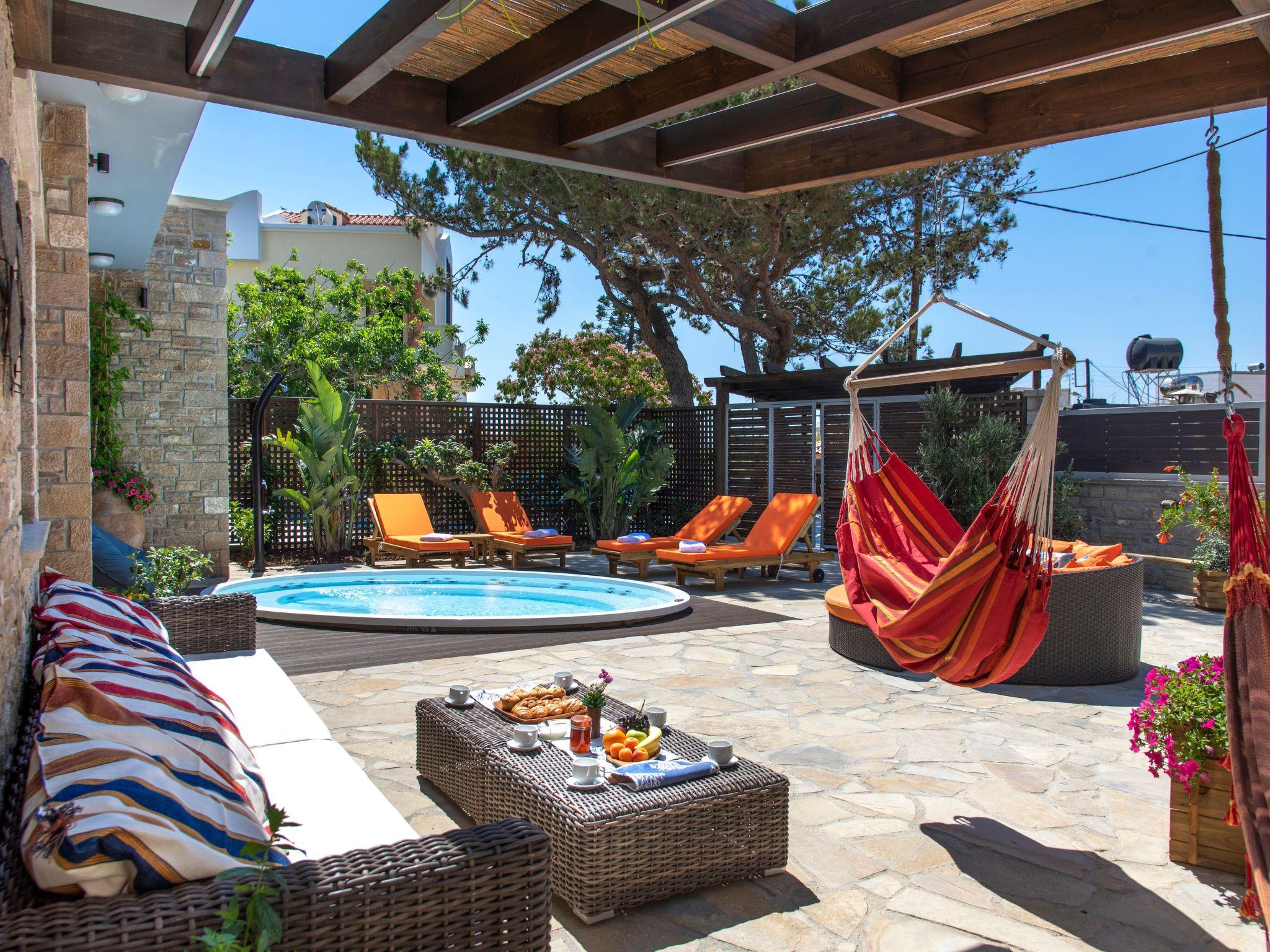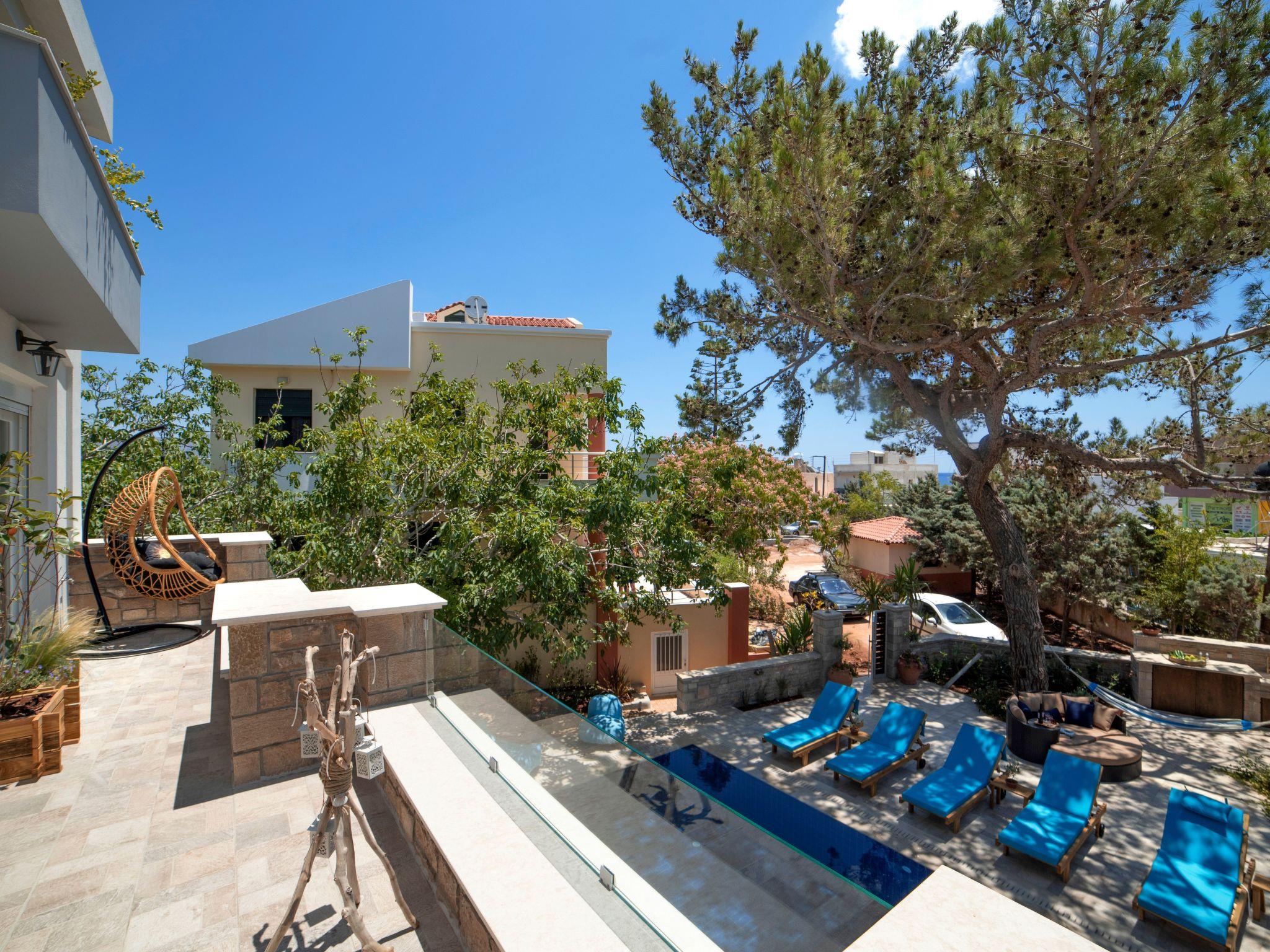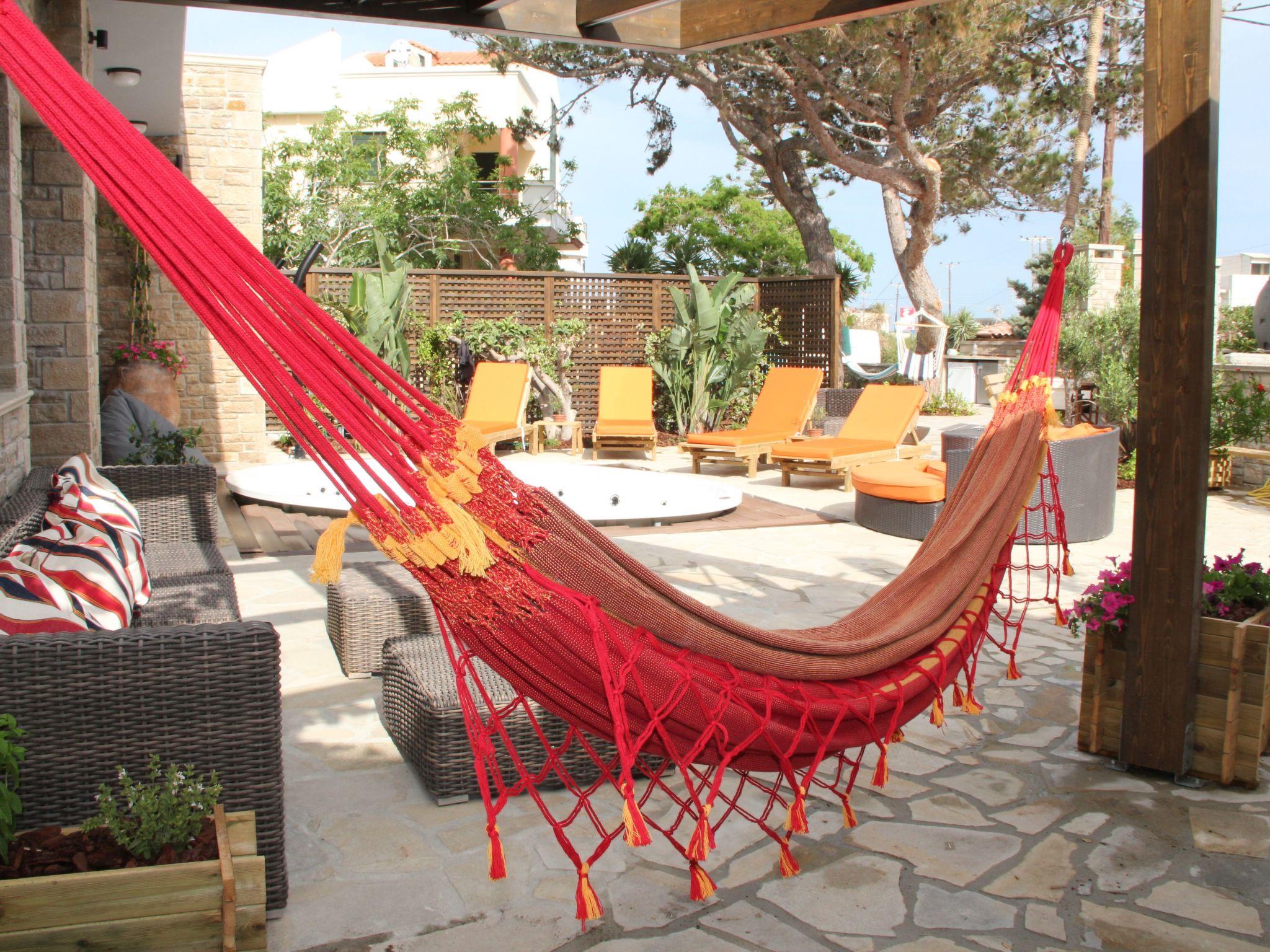 Two adjoining residences with shared outdoors in a wooded, secluded lot, only a 3 min walk to a pebble beach with bar and restaurants. Combining wonderfully the Cretan architecture with international inspirations and modern elegance, this stylishly decorated villa exudes a feeling of warmth and privilege by offering a unique experience of ultimate relaxation. Beautiful garden, heated infinity swimming pool (38.25 square meters) and huge (3.5 x 4 m) outdoor spa tub. A large sand beach is found only 2 km away. 6 of 7 bedrooms have en-suite bathrooms; two bathrooms have jetted tubs. We welcome you to stay! Entirely private and enclosed property in a quiet village with all modern comforts (markets, bakery, pharmacy) walking distance to the property. The enclosed private property is wooded with beautiful gardens and multiple leisure lounge areas by the pool and outdoor whirlpool tub.