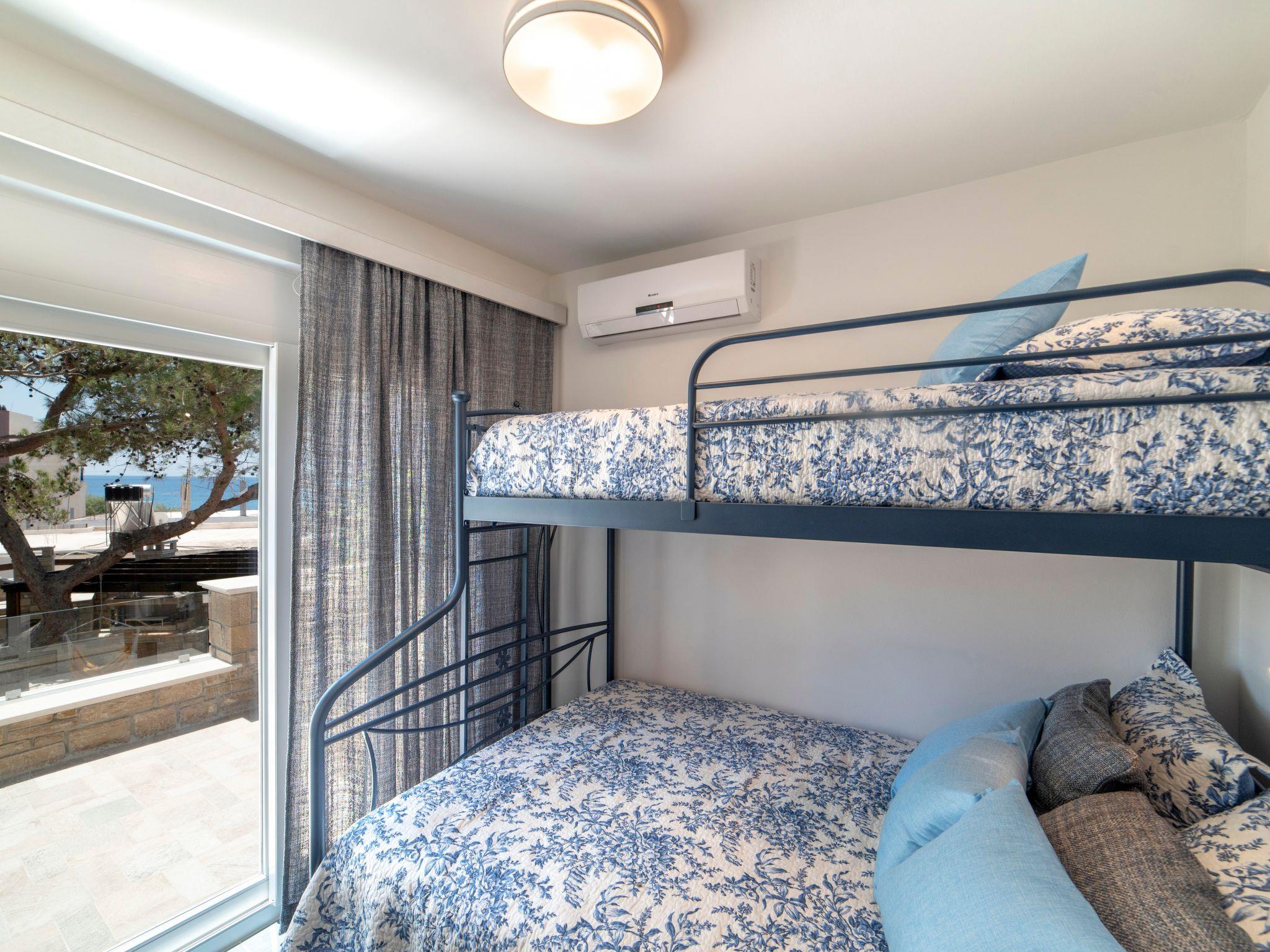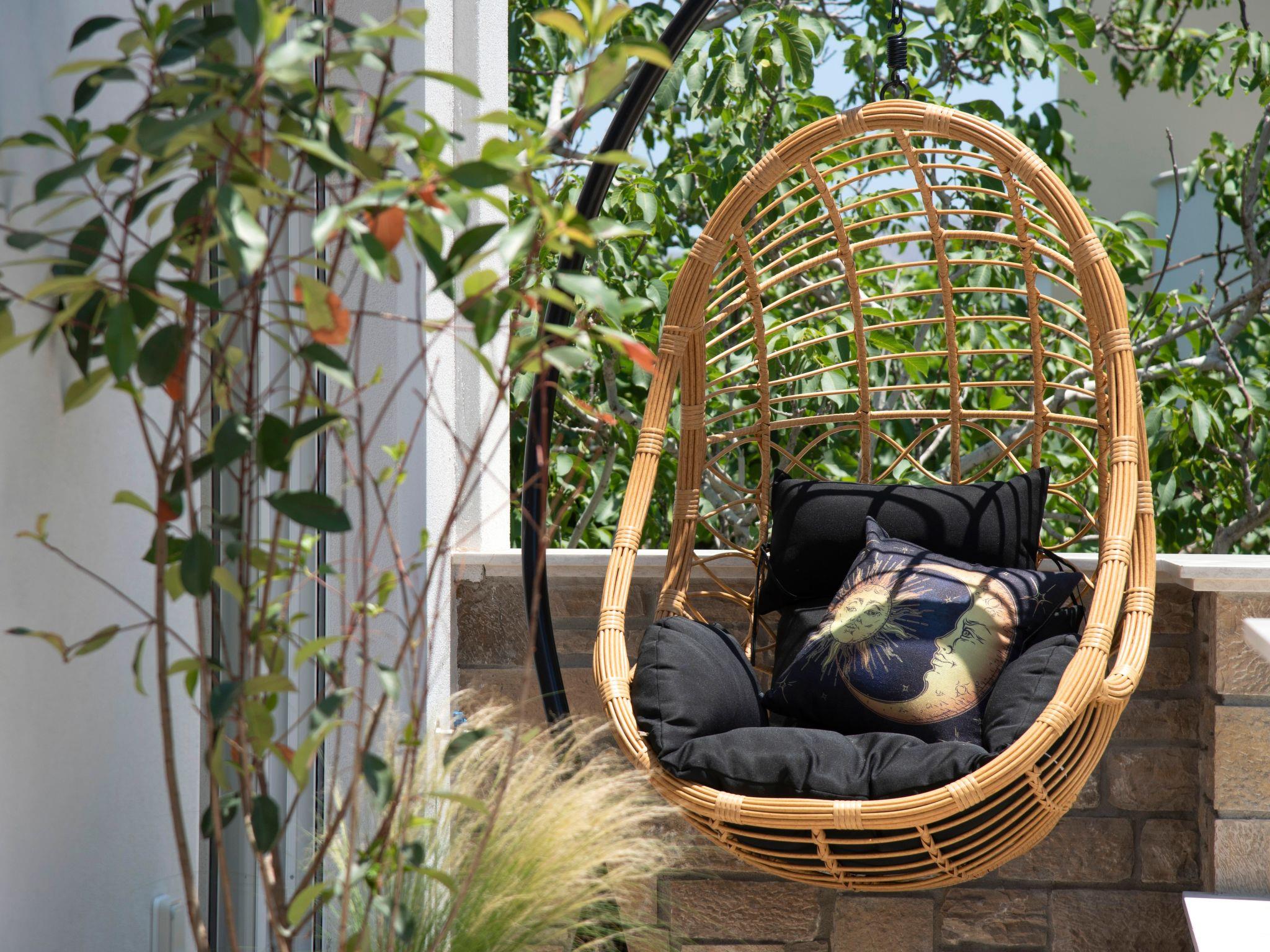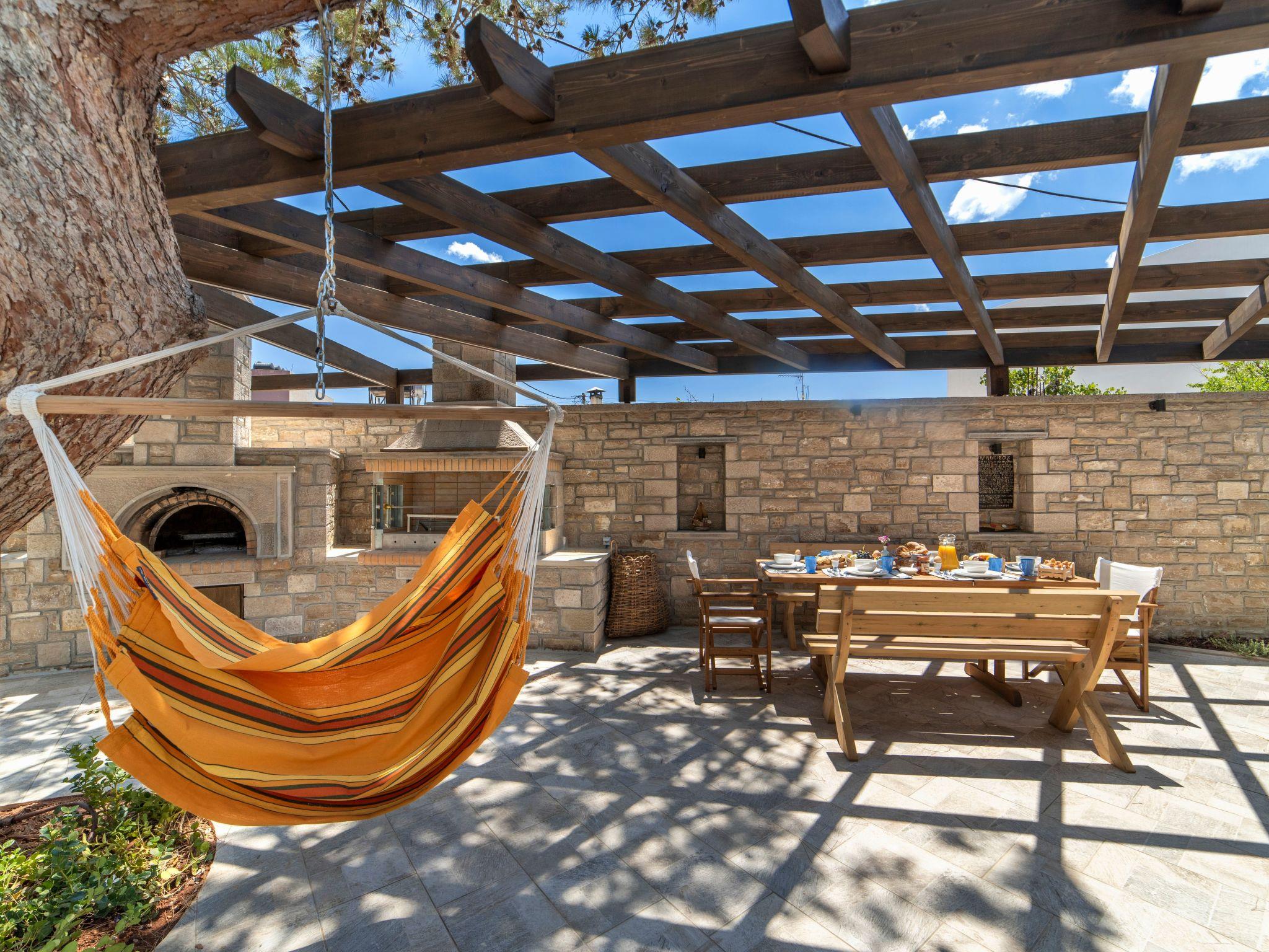 Pefka (pine tree) is newly-constructed and modern. It is situated next to 2 tall pecan trees and across 2 huge pine trees that provide ample shadow during the hot summer days. It features 2 master bedrooms with en suite bathrooms situated in the quiet part of the villa facing the gardens away from the pool, a pool-facing third bedroom with en suite bathroom, a fully walled, private loft with double bed and en suite bathroom, as well as two living rooms with chair and sofa beds able to sleep more. First and second floors have sea views.