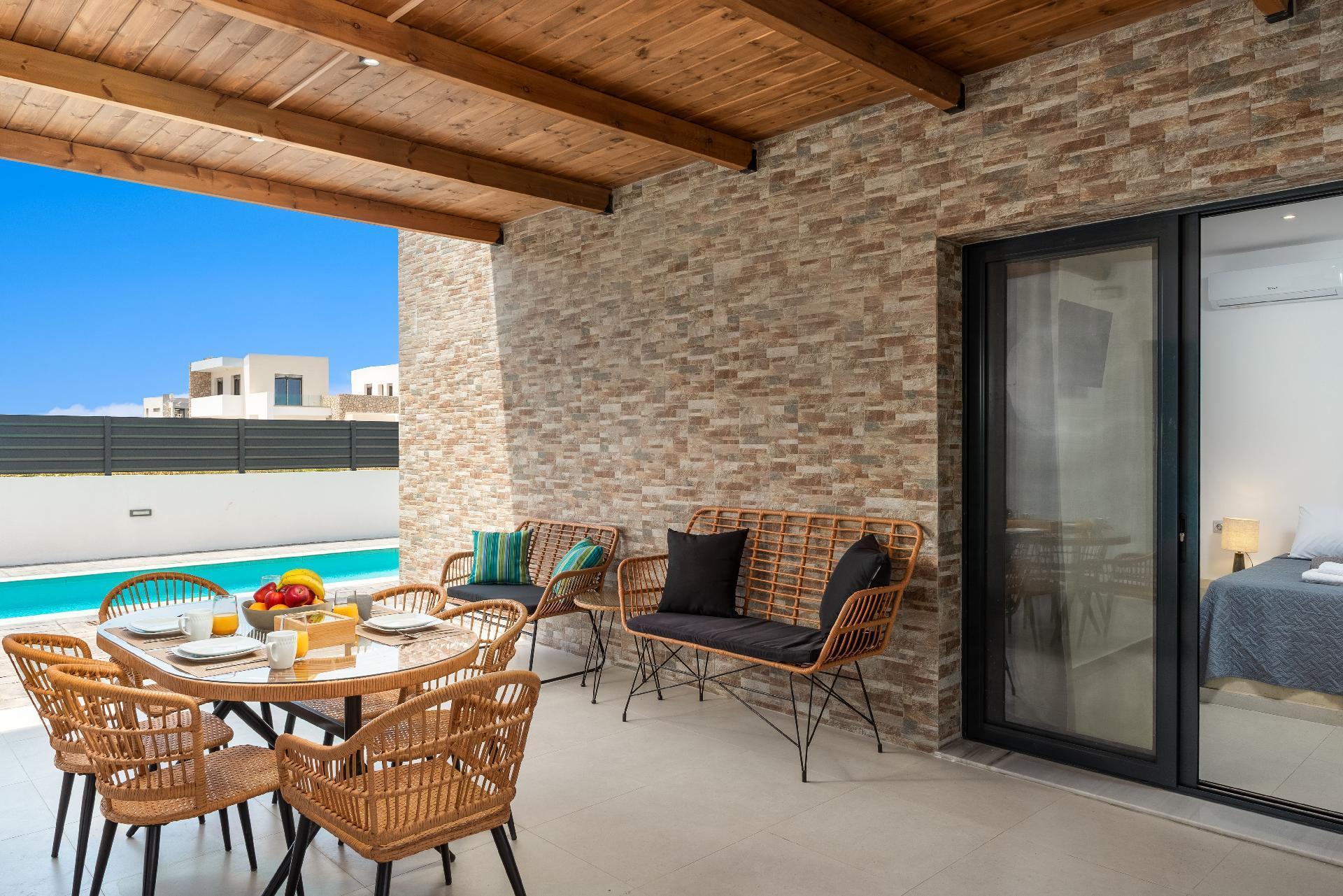 Salty Sun Luxury Villas offers 7 beautiful villas that can accommodate up to 5 guests. The villas features two air-conditioned bedrooms, each with a comfortable double bed and an ensuite bathroom with a shower. Inside, you will find a fully equipped kitchen, perfect for preparing meals, and a cozy living room with a sofa bed and a smart TV for entertainment. Outdoors, the villas provides a wonderful space to enjoy the warm weather. There is an outdoor kitchen with an electric BBQ, ideal for cooking and dining al fresco. The dining area offers a great spot to enjoy meals with family or friends. The highlight of the outdoor space is the private swimming pool, perfect for relaxing and cooling off. Salty Sun Luxury Villas ensures a luxurious and comfortable stay with all the amenities you need for a memorable vacation.