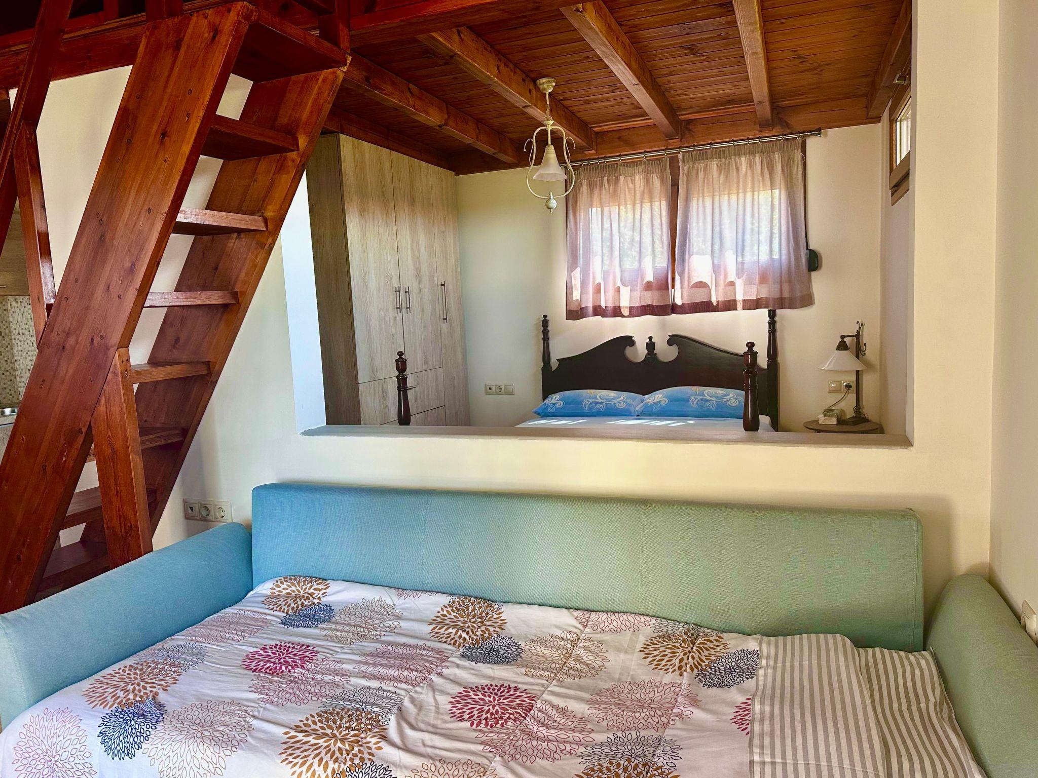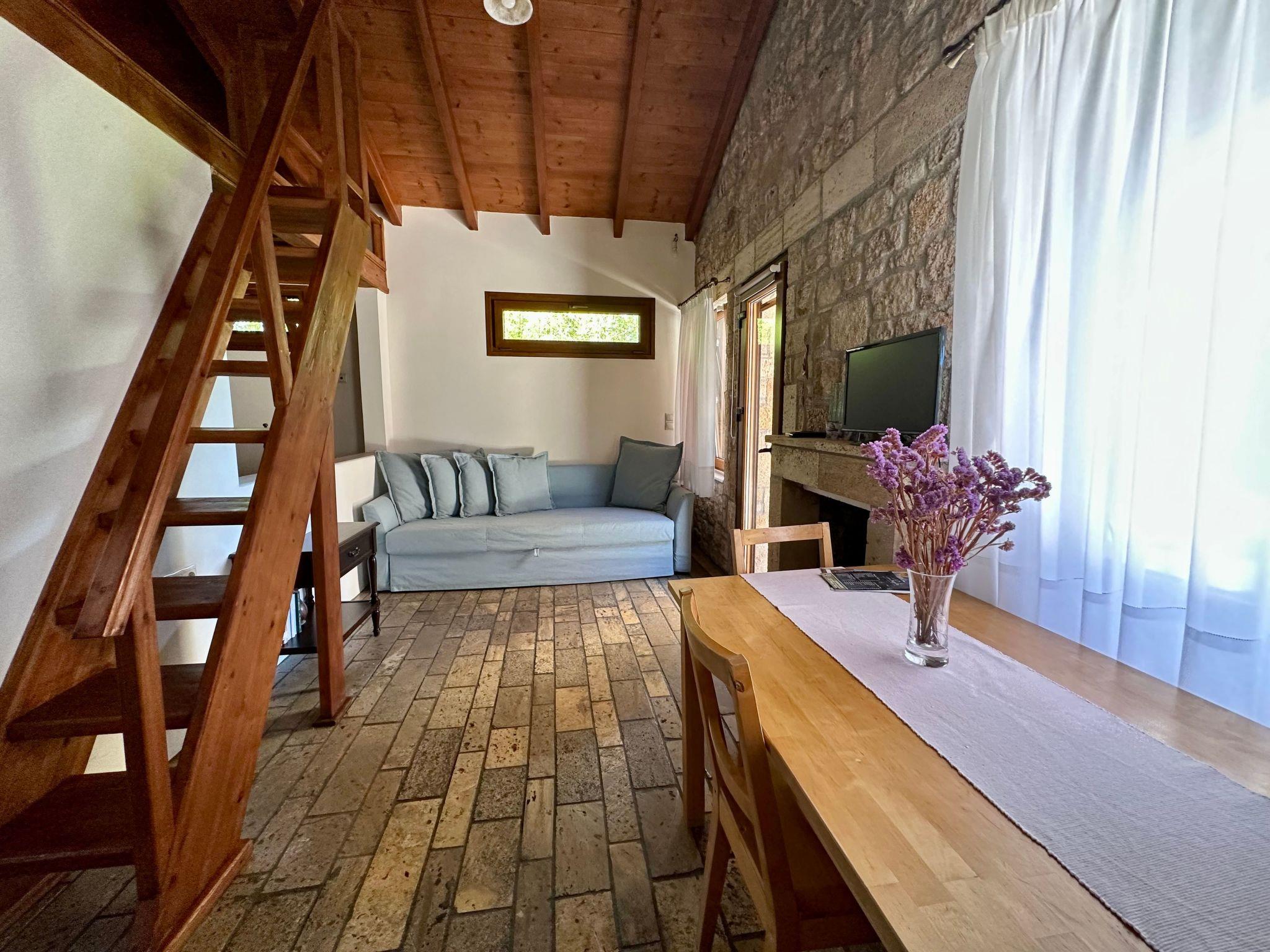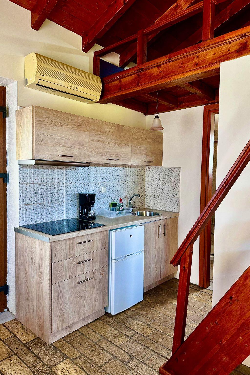 The interior of the Garden View Apartment is meticulously designed to provide a feeling of a true home away from home. It boasts a comfortable double bedroom and a versatile attic space that can accommodate extra guests, making it perfectly suited for both romantic getaways and family vacations. The apartment features an open-plan layout that cleverly integrates a cozy living room with a sofa bed and a fully equipped kitchen. This setup not only allows guests to prepare and savor their favorite meals at their own pace but also ensures every moment of their stay is enveloped in comfort and convenience. Large windows and access to a garden offer views of lush greenery, with glimpses of the sea visible, reminding guests of their proximity to nature's beauty.