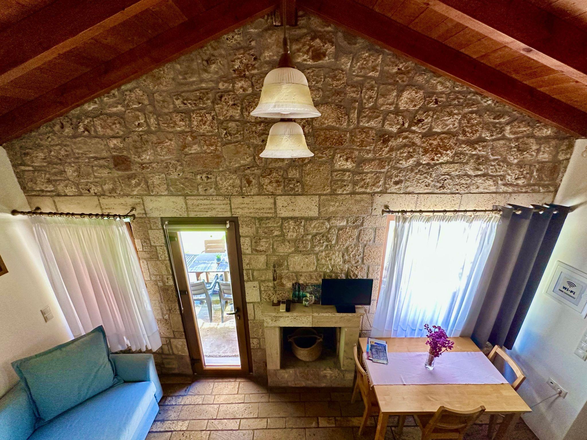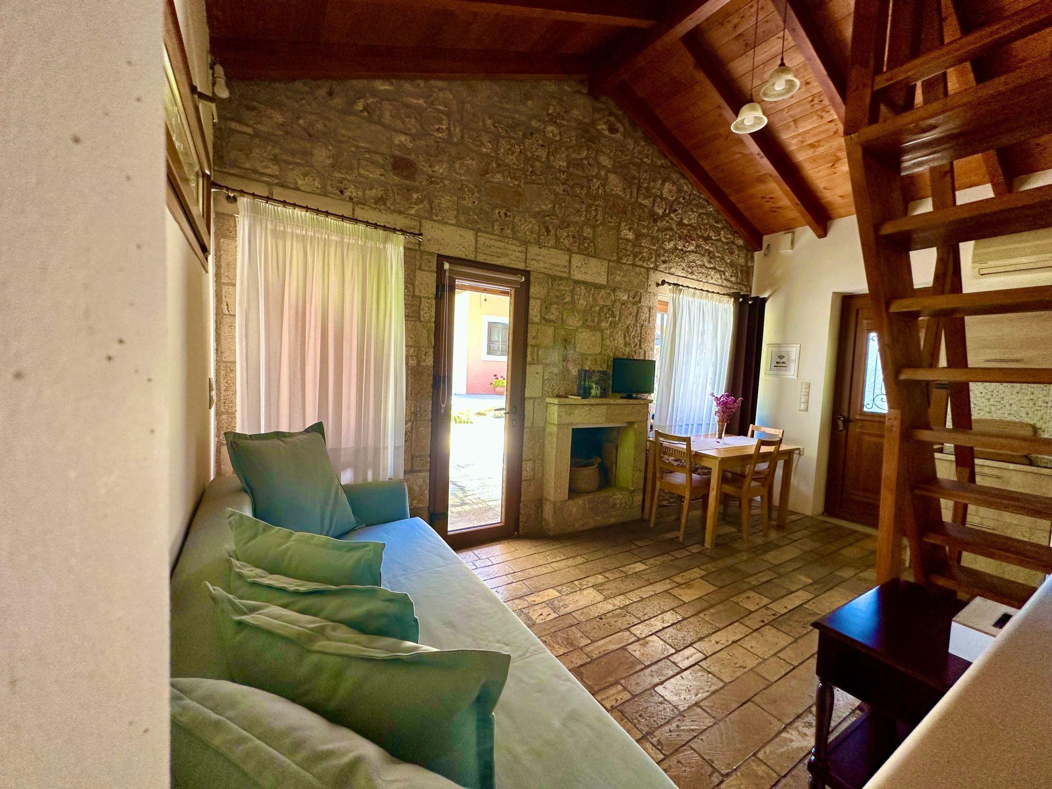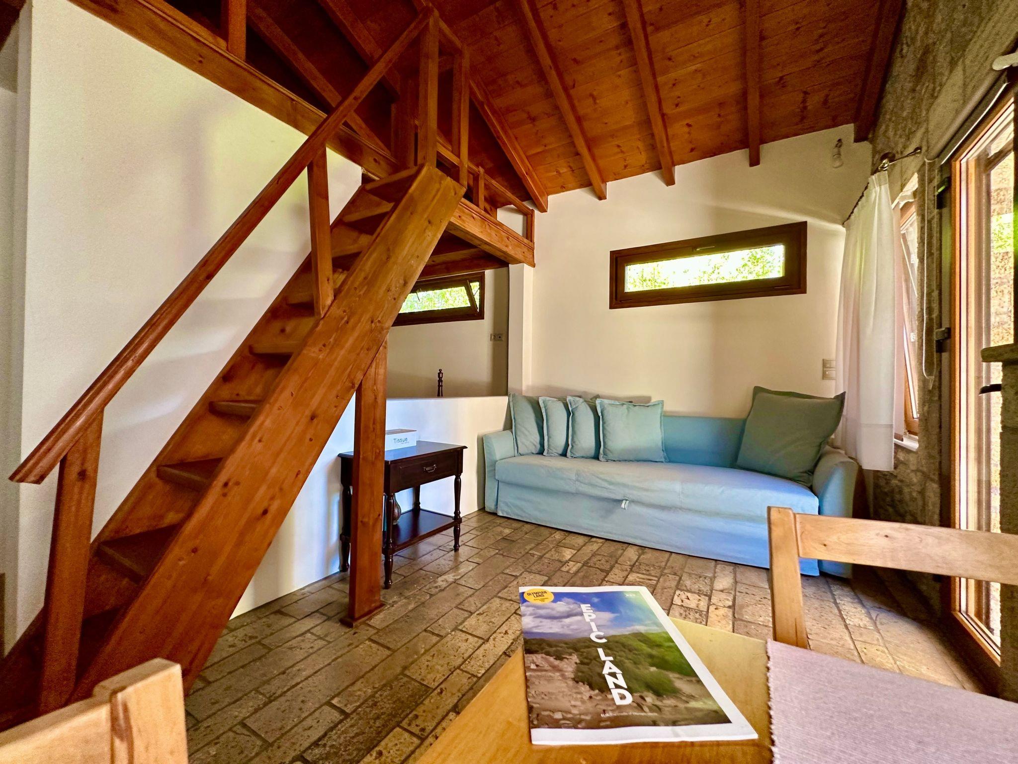 The interior of the Garden View Apartment is meticulously designed to provide a feeling of a true home away from home. It boasts a comfortable double bedroom and a versatile attic space that can accommodate extra guests, making it perfectly suited for both romantic getaways and family vacations. The apartment features an open-plan layout that cleverly integrates a cozy living room with a sofa bed and a fully equipped kitchen. This setup not only allows guests to prepare and savor their favorite meals at their own pace but also ensures every moment of their stay is enveloped in comfort and convenience. Large windows and access to a garden offer views of lush greenery, with glimpses of the sea visible, reminding guests of their proximity to nature's beauty.