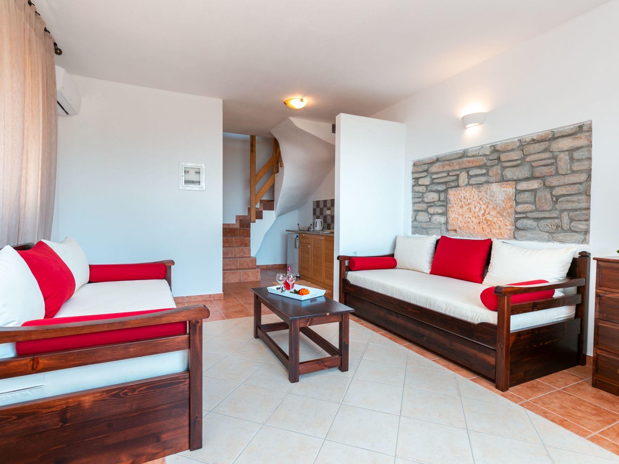 The maisonette has a traditional design and is ideal for families or groups as it can accommodate up to six people, two people can be accommodated in the double bed of the master bedroom, while four people can use the two double sofa beds in the living room. The layout is divided into two floors, on the ground floor our guests will find the living room, a kitchenette and the private bathroom, upstairs is the master bedroom and the kitchen is equipped with a kitchenette and various kitchen utensils. Finally, the maisonette has direct access to a furnished balcony with magnificent views where you can relax with family or friends.